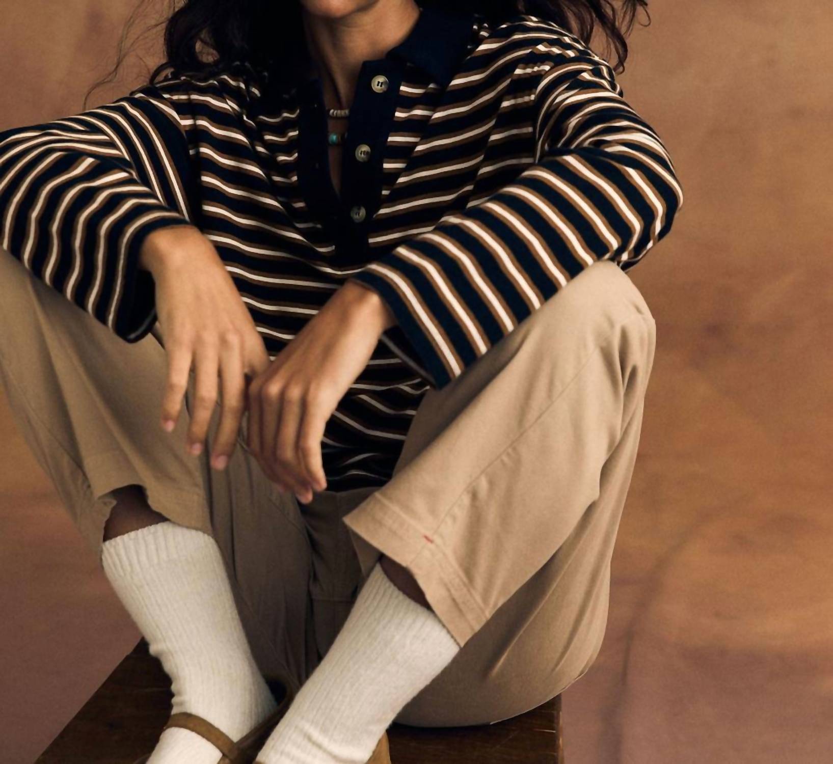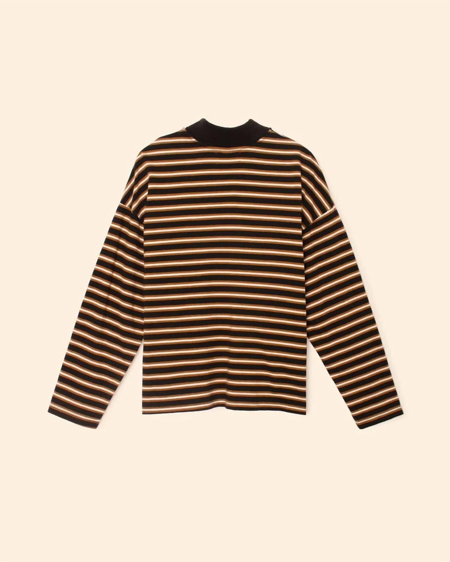 The perfect long sleeve tee that goes with just about anything. Introducing the Clay Striped Top by XIRENA, a relaxed fit polo designed for minimalist style. With its long sleeves and collar neckline, this 100% cotton rugby polo comes in a chic licorice striped pattern. It features a classic button closure, adding a refined touch to any ensemble. Care instructions include machine wash and tumble dry, making it a practical choice for the spring season.