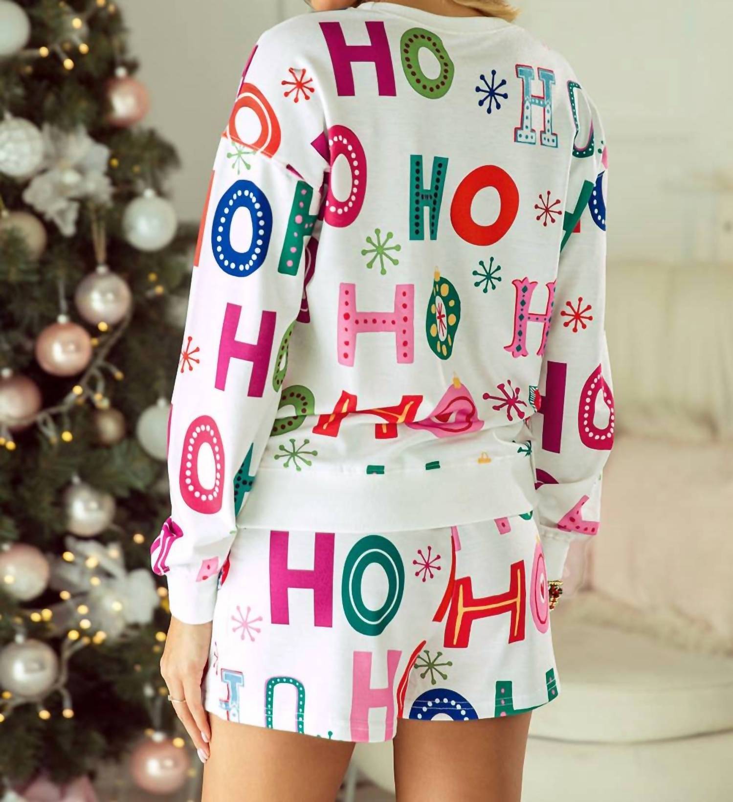A set so cute you'll never want to take it off. Designed to look good while lounging, this little number is the perfect outfit for hanging at home in style. Stay festive and cozy this winter with the 1 the Woman Ho Ho Ho Christmas Fashion Print Lounge Short Set. Featuring long sleeves and a crewneck design, this set is made of 95% polyester and 5% elastane for ultimate comfort. The playful Christmas graphic print adds a touch of charm, perfect for holiday parties or lounging at home. Care: Machine wash cold, tumble dry low. Ideal for the Christmas season, this set is a must-have for those who love maximalist festive fashion.