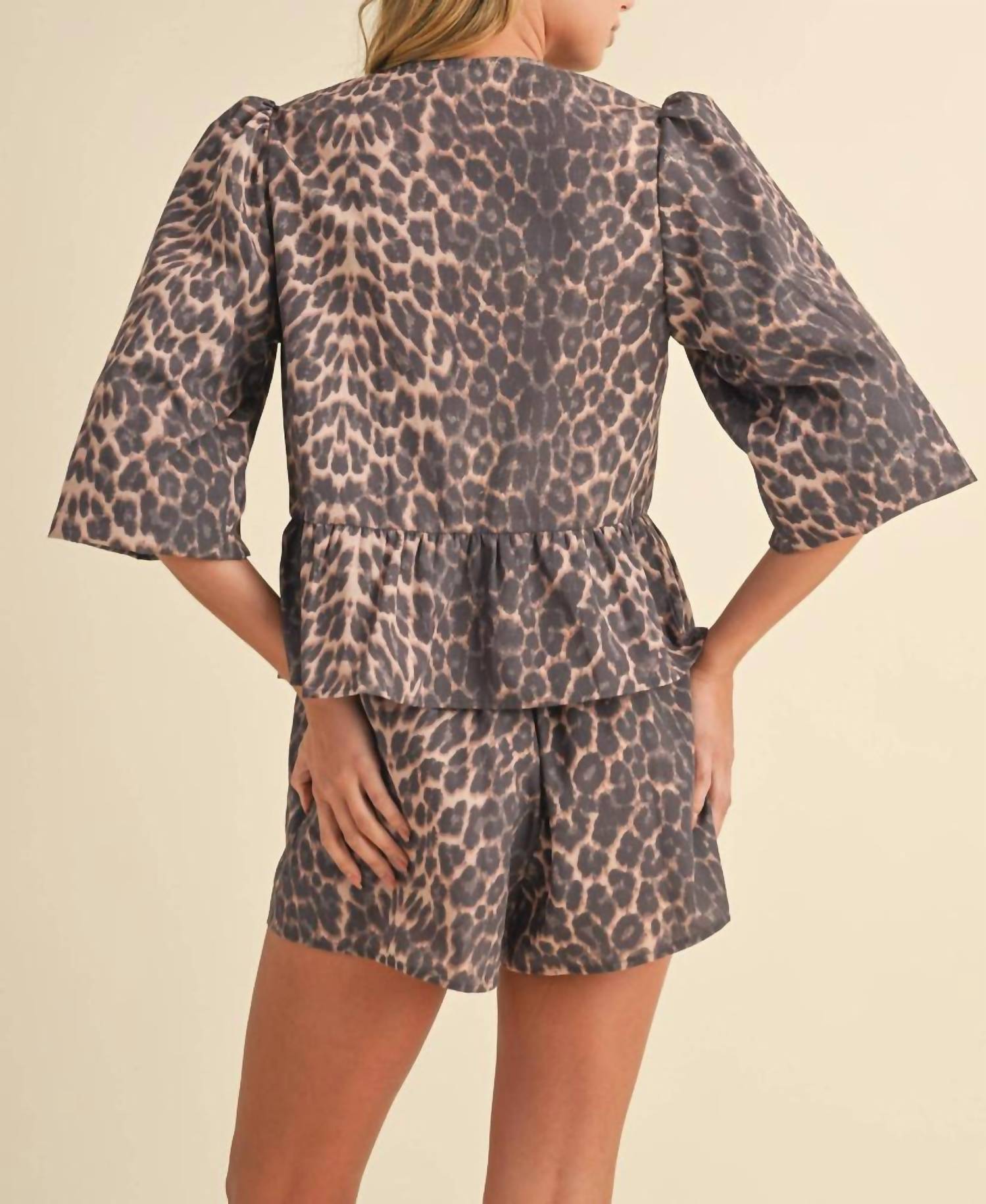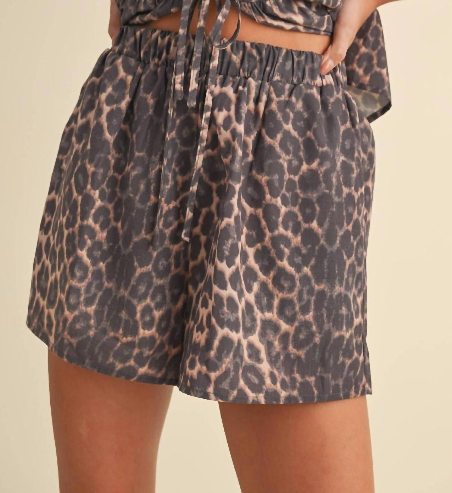 A match made in heaven. This two-piece set is so cute, you'll wish you could wear it out of the house! Did we mention how comfortable it is, too? You may want two sets! Unleash your inner wild side with the Casey Leopard Tie Front Set by Klesis, a chic addition to your summer wardrobe. This playful loungewear set features a short sleeve top with a trendy tie front and collar, all in a striking leopard print, accompanied by matching elastic waist shorts.