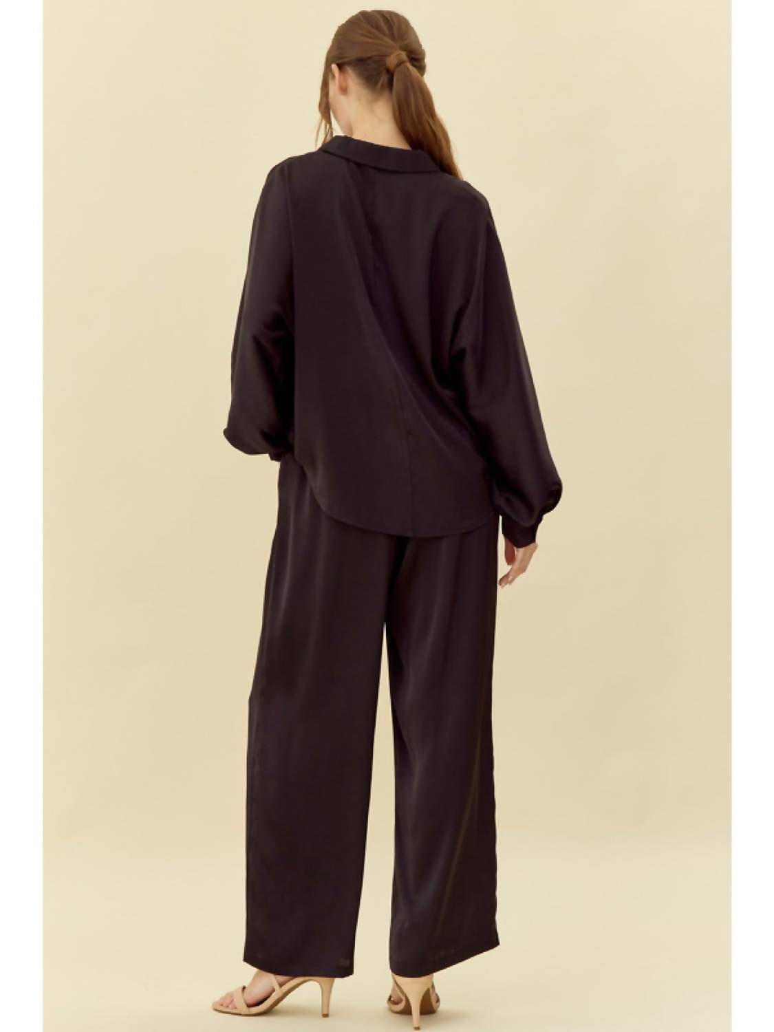 Loungewear doesn't have to be frumpy and this is exactly what we had in mind. Designed for a comfortable fit, this chic little number will be your favorite lounging-at-home look. Introducing the So Much Better Satin Set by Jodifl, a chic loungewear essential in sleek black. The set features a button-up collared top with long dolman sleeves, accented by buttoned cuffs. Made from 100% Polyester, the pants offer a drawstring waistline and convenient front pockets. Fits true to size for an oversized fit—consider sizing down for a more tailored look.