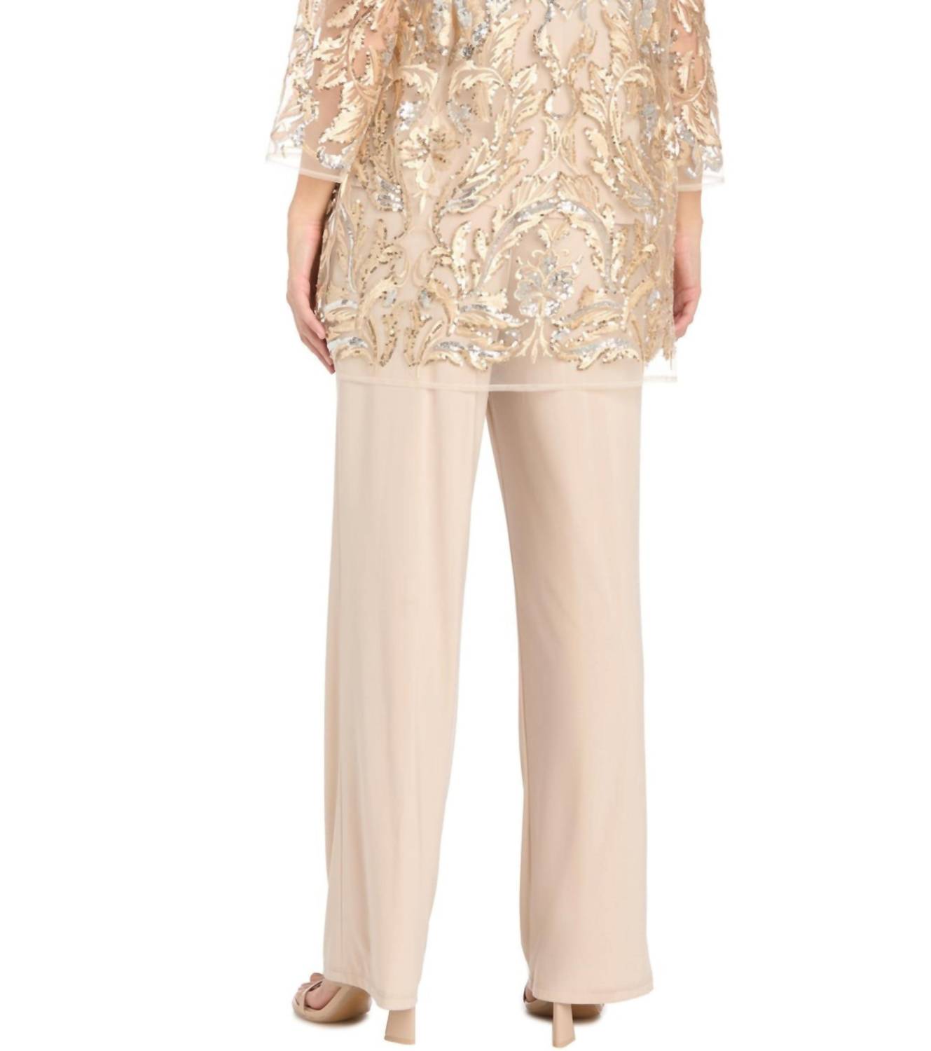 Loungewear doesn't have to be frumpy and this is exactly what we had in mind. Designed for a comfortable fit, this chic little number will be your favorite lounging-at-home look. Elevate your evening with the R&M Richards Gold 3 Piece Evening Pant Set, a luxurious ensemble that offers timeless elegance. Showcasing a stunning patterned design, this set features a three-quarter sleeve top with a scoop neckline and an elastic waistband pant for comfort. Crafted from 95% Rayon and 5% Polyester, this set includes removable jewelry for added flair. For care, hand wash these pieces delicately to maintain their exquisite quality.