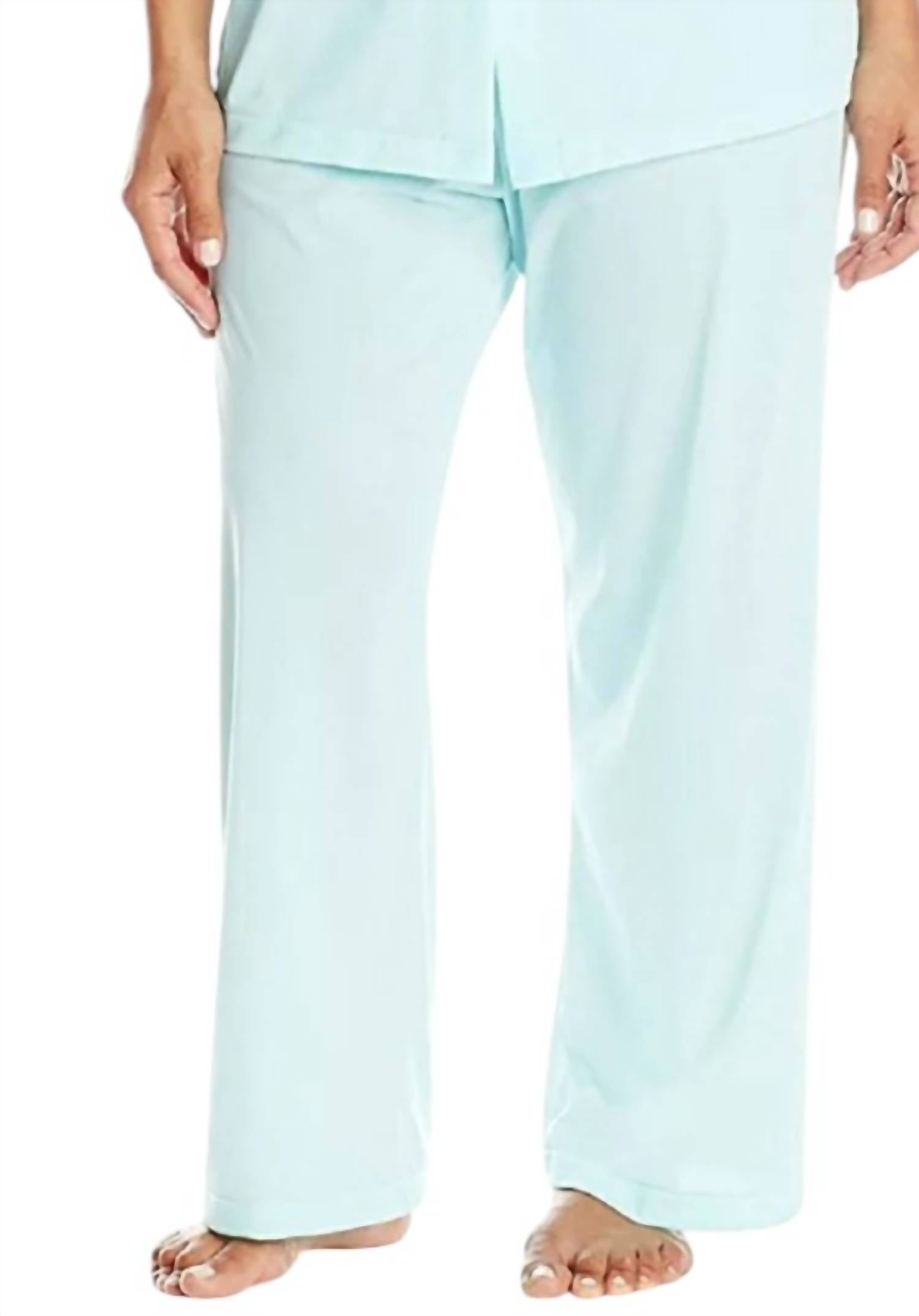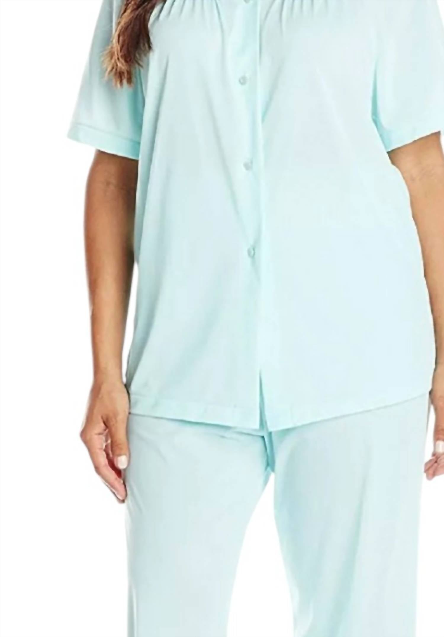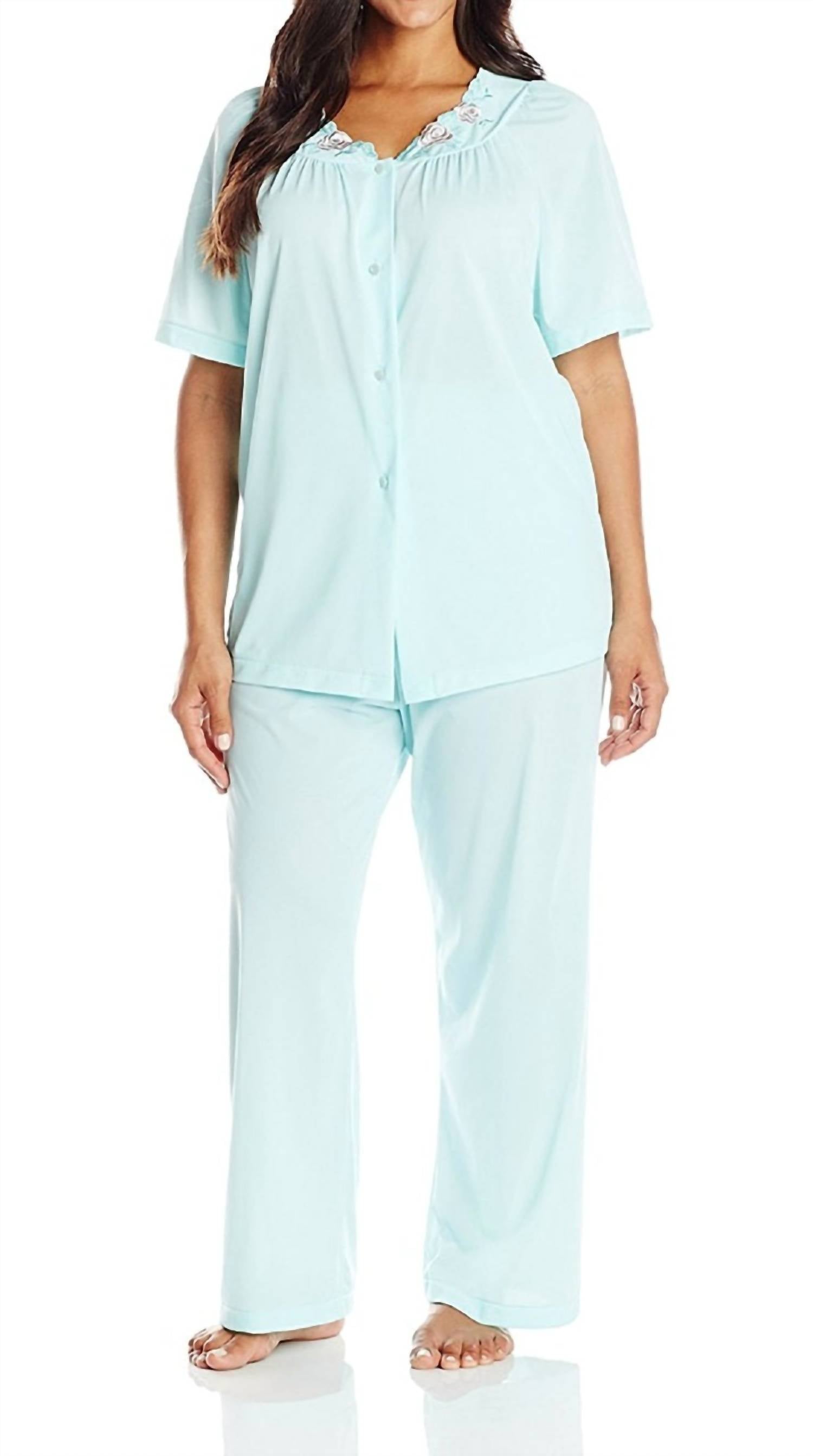 Works well with naps, zoom calls and binging your favorite series. Introducing the Shadowline Women's Petals Short Sleeve Pajama, a delightful piece in serene seafoam. This luxurious set features a short sleeve top with an exquisite embroidered yoke and soft gathers at the front and back for a relaxed fit. Made from 100% Opacitrique® nylon tricot, this pajama guarantees comfort and opaqueness, with a convenient pull-on closure and a full button front closure complementing its design. Proudly made in the USA, this pajama is machine washable and can be tumble dried for easy care. The pajama bottoms offer a 28-inch inseam, ensuring exceptional comfort with their covered elastic waist and relaxed styling—a signature of Shadowline's unmatched quality and attention to detail.