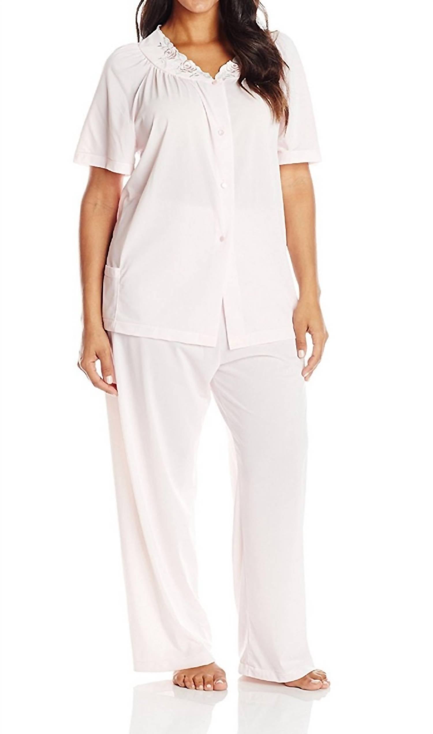 Works well with naps, zoom calls and binging your favorite series. Indulge in the luxurious comfort of the Shadowline Lingerie Petals Short Sleeve Pajama in pink, featuring short sleeves and a signature embroidered yoke for a touch of elegance. Crafted from 100% Opacitrique® nylon tricot, this pajama set offers a soft and opaque finish, ensuring maximum comfort. Made in the USA, the top showcases a full button front closure and a convenient patch pocket. The bottoms have a 28-inch inseam with a covered elastic waist for a relaxed fit. Care: Machine wash and tumble dry for easy maintenance.