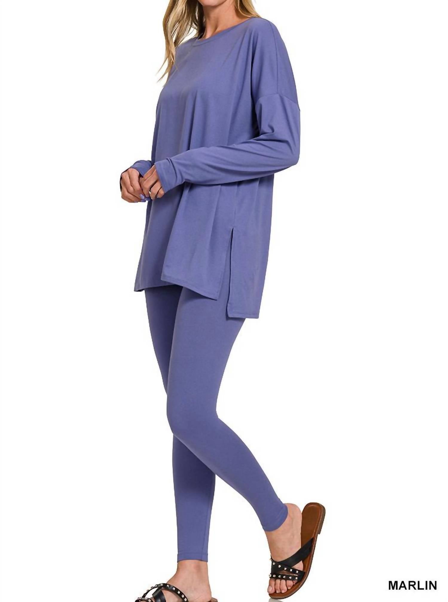 A match made in heaven. This two-piece set is so cute, you'll wish you could wear it out of the house! Did we mention how comfortable it is, too? You may want two sets! Elevate your relaxation with the Long Sleeve Microfiber Pant Set by ZENANA, crafted in Marlin blue for a chic and cozy look. This luxurious loungewear set, made from 90% polyester and 10% spandex, features long sleeves and a crewneck design for ultimate comfort. The top lengths are 28.5" for regular sizes and 30" for plus sizes, with bust measurements of 43" and 51" respectively. The leggings offer a perfect fit with a total waist of 22" (regular) and 30" (plus), and an inseam of 25.5", making it ideal for those who appreciate a classic, buttery soft feel with excellent stretch and recovery.