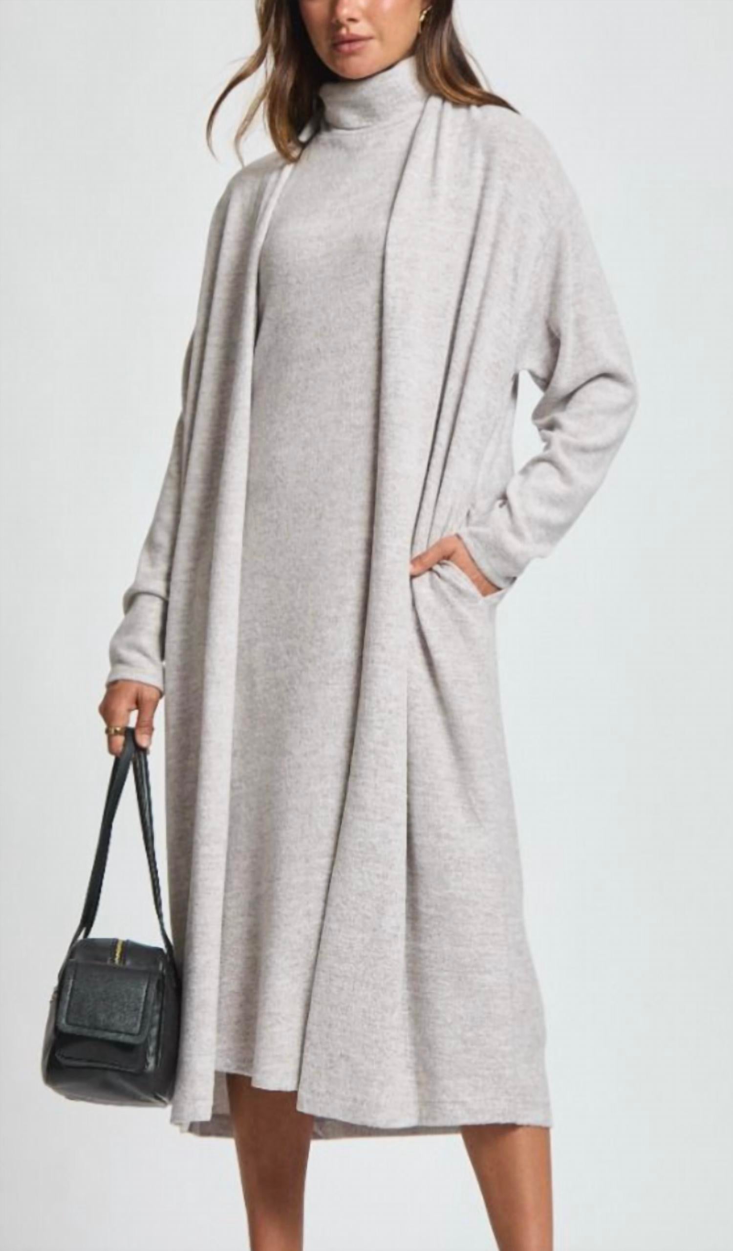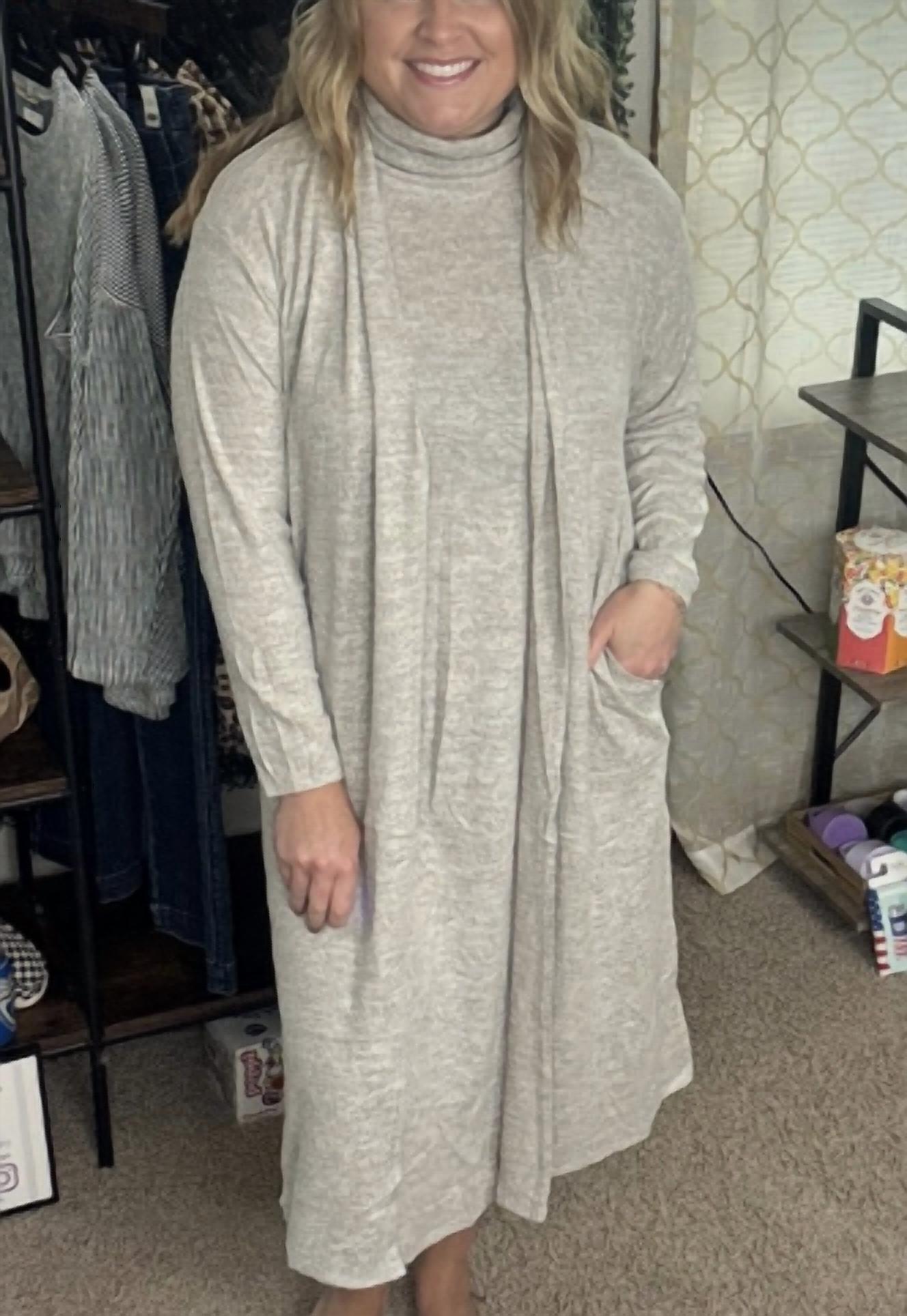 A set so cute you'll never want to take it off. Designed to look good while lounging, this little number is the perfect outfit for hanging at home in style. ** 2 piece set: includes a dress and cardigan. Wrap yourself in softness with this luxurious 2 piece set, featuring a brushed cashmere cowl neck dress paired with a matching open front cardigan. The dress offers a flattering, silhouette with a cozy cowl neckline, while the cardigan adds an extra layer of warmth and effortless style. Perfect for chilly days when you want to feel both comfortable and refind, this set is the ultimate in elevated travelwear. ** Please note that light shedding is a natural characteristic of the delicate Cashmere Hacci fabric. ** FABRIC CONTENT 52% Polyester 44% Rayon 4% Spandex S-0-6 M-8-10 L-10-12 XL-14-16 2XL-18-20 3XL-22-26