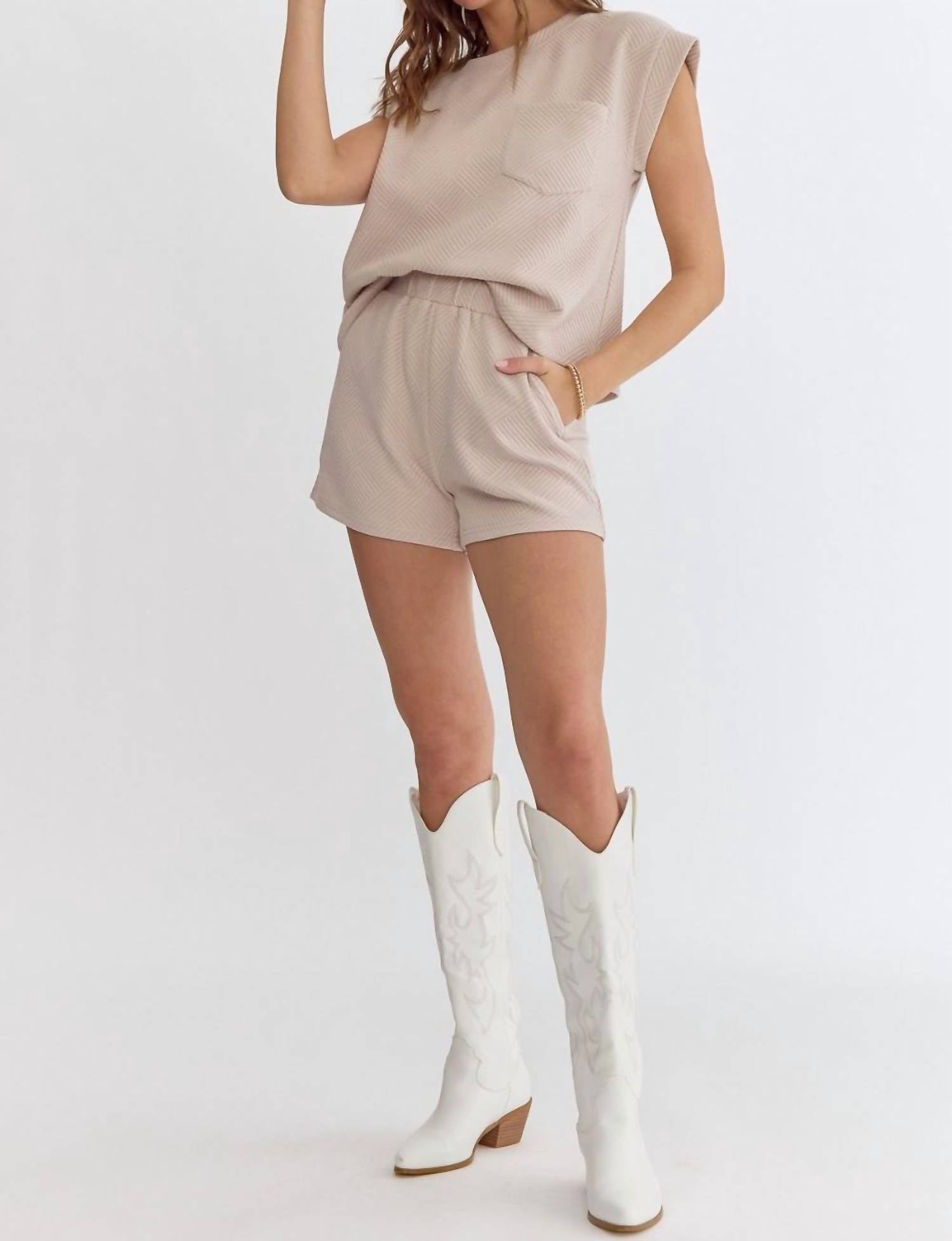 Loungewear doesn't have to be frumpy and this is exactly what we had in mind. Designed for a comfortable fit, this chic little number will be your favorite lounging-at-home look. Meet the Short Sleeve Textured Short Set by Entro, a stylish and comfortable choice for your loungewear collection in light taupe. This set features a cropped top with a round neck and short sleeves, crafted from textured knit material, complete with a single pocket at the bust. The coordinating high-waisted shorts boast an elastic waistband and side pockets, making them as practical as they are chic. Care for this solid, non-sheer set is effortless with machine wash and tumble dry instructions.