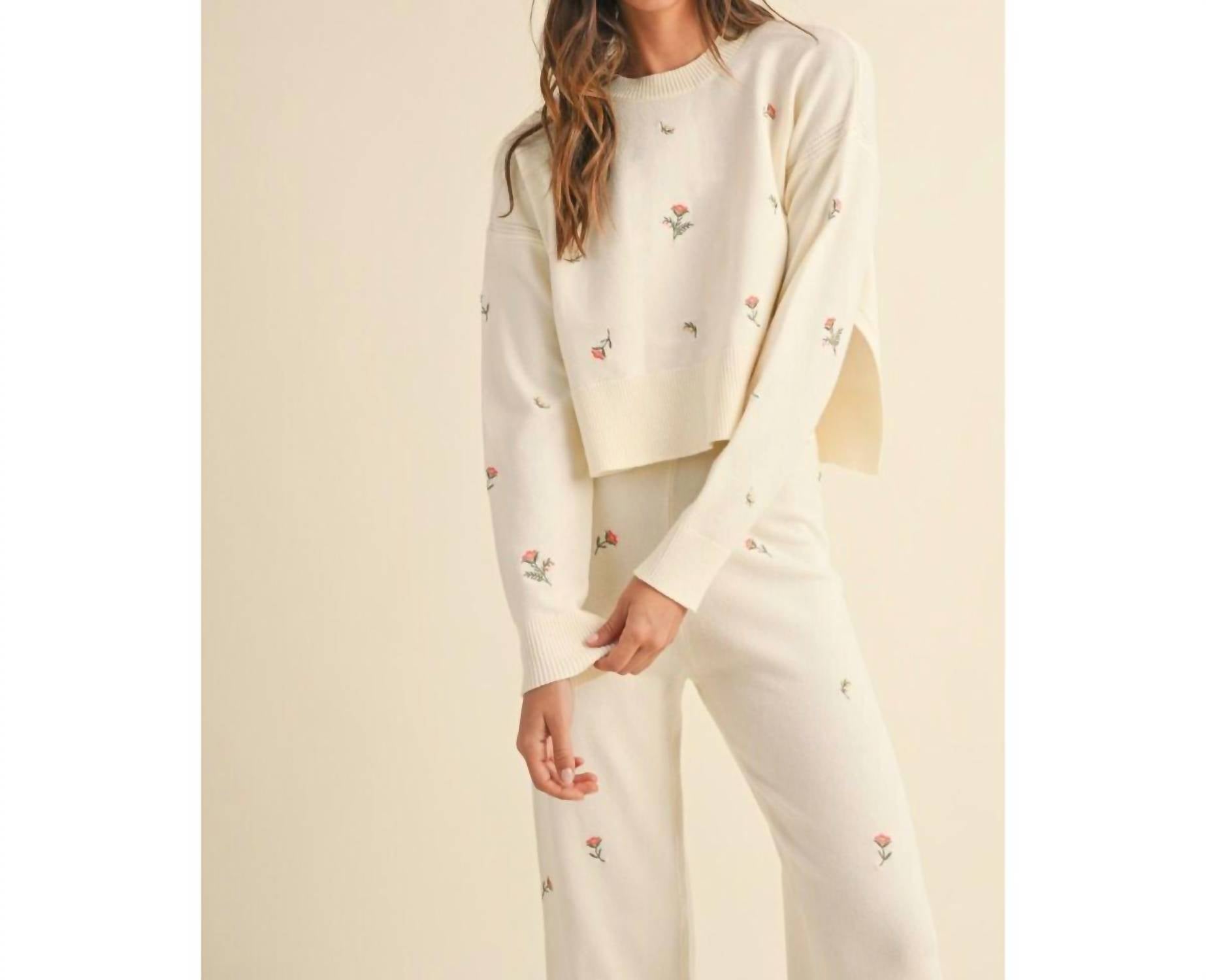 Loungewear doesn't have to be frumpy and this is exactly what we had in mind. Designed for a comfortable fit, this chic little number will be your favorite lounging-at-home look. Indulge in the Floral Embroidered Lounge Set by MABLE, perfect for luxury lounging in an elegant beige hue. This women's loungewear set features a long sleeve crewneck sweater with delicate floral embroidery and matching straight-leg pants, blending a sophisticated touch with cozy comfort. Made from 50% Viscose, 28% Polyester, 22% Nylon, this set embodies the boho chic trend, ideal for a spring vacation or Easter holiday. Care: Hand wash and lay flat to dry. Model is wearing a size small.