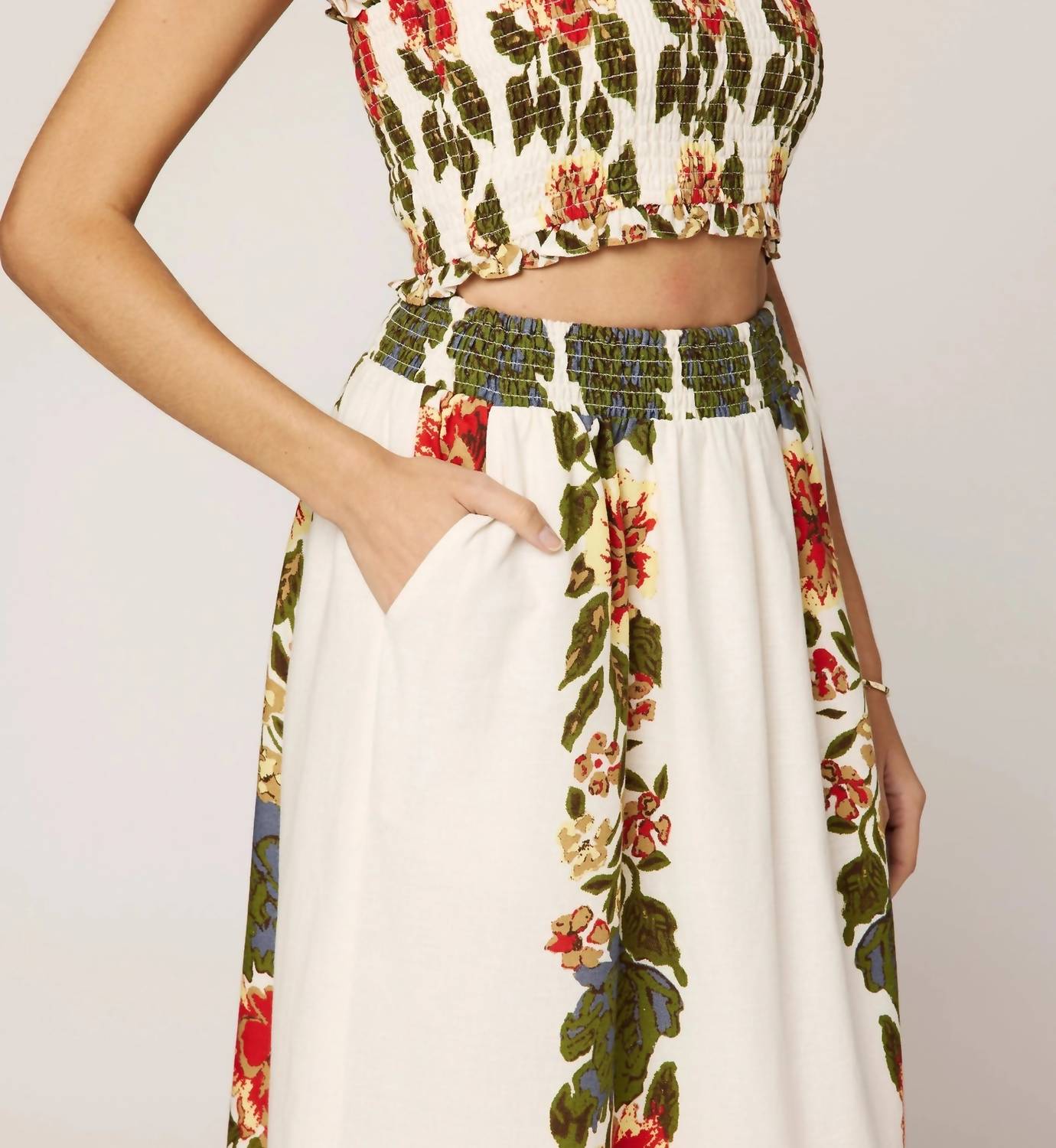A match made in heaven. This two-piece set is so cute, you'll wish you could wear it out of the house! Did we mention how comfortable it is, too? You may want two sets! Introducing the Ruby Top & Midi Skirt Set by Cleobella, a stunning addition to your boho chic collection in a beautiful Juliet floral pattern. The strapless top is cropped, while the skirt features a smocked waist and handy side-seam pockets, both crafted from a luxurious cotton blend with 70% cotton and 30% linen, accented by a partial organic-cotton lining. This imported ensemble is perfect for a summer holiday party. Care: Dry clean only.