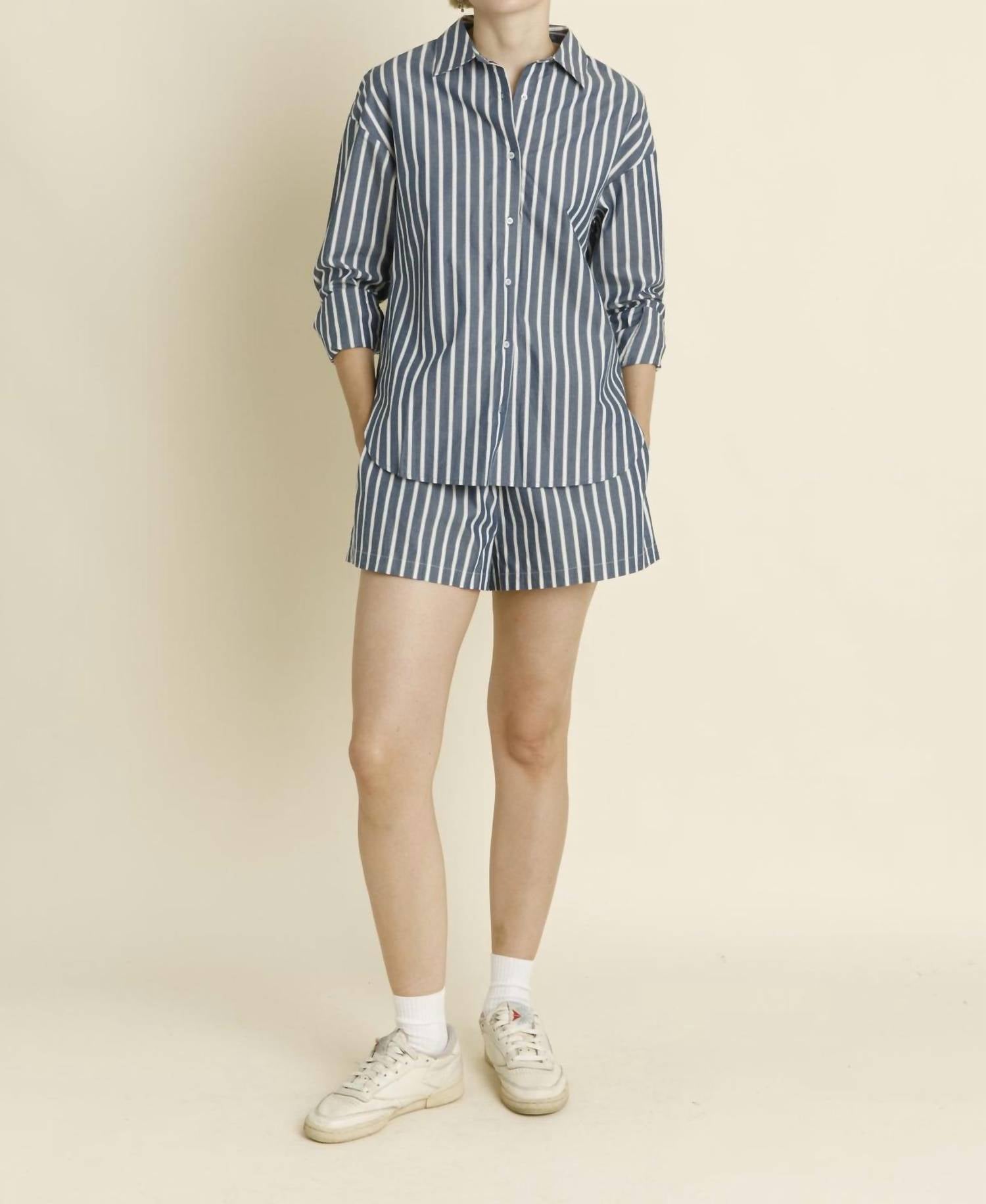 A set so cute you'll never want to take it off. Designed to look good while lounging, this little number is the perfect outfit for hanging at home in style. Introducing the Palmer Button Down Top and Short Set by Aureum, crafted from 100% Cotton for ultimate comfort. This set features a long sleeve shirt with a collar and button closure, offering an oversized fit. The shorts include a functional elastic waistband and convenient pockets. Care for this stylish Stripe pattern set is easy with machine wash instructions. Ideal for a relaxed vacation or a cozy Thanksgiving, showcasing a nod to 90s fashion.
