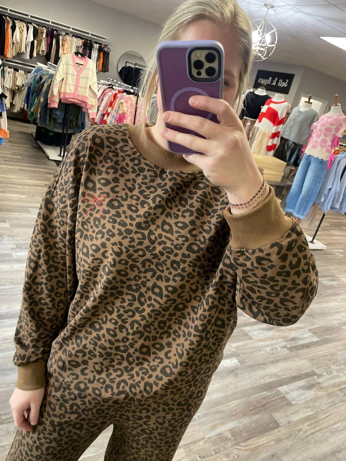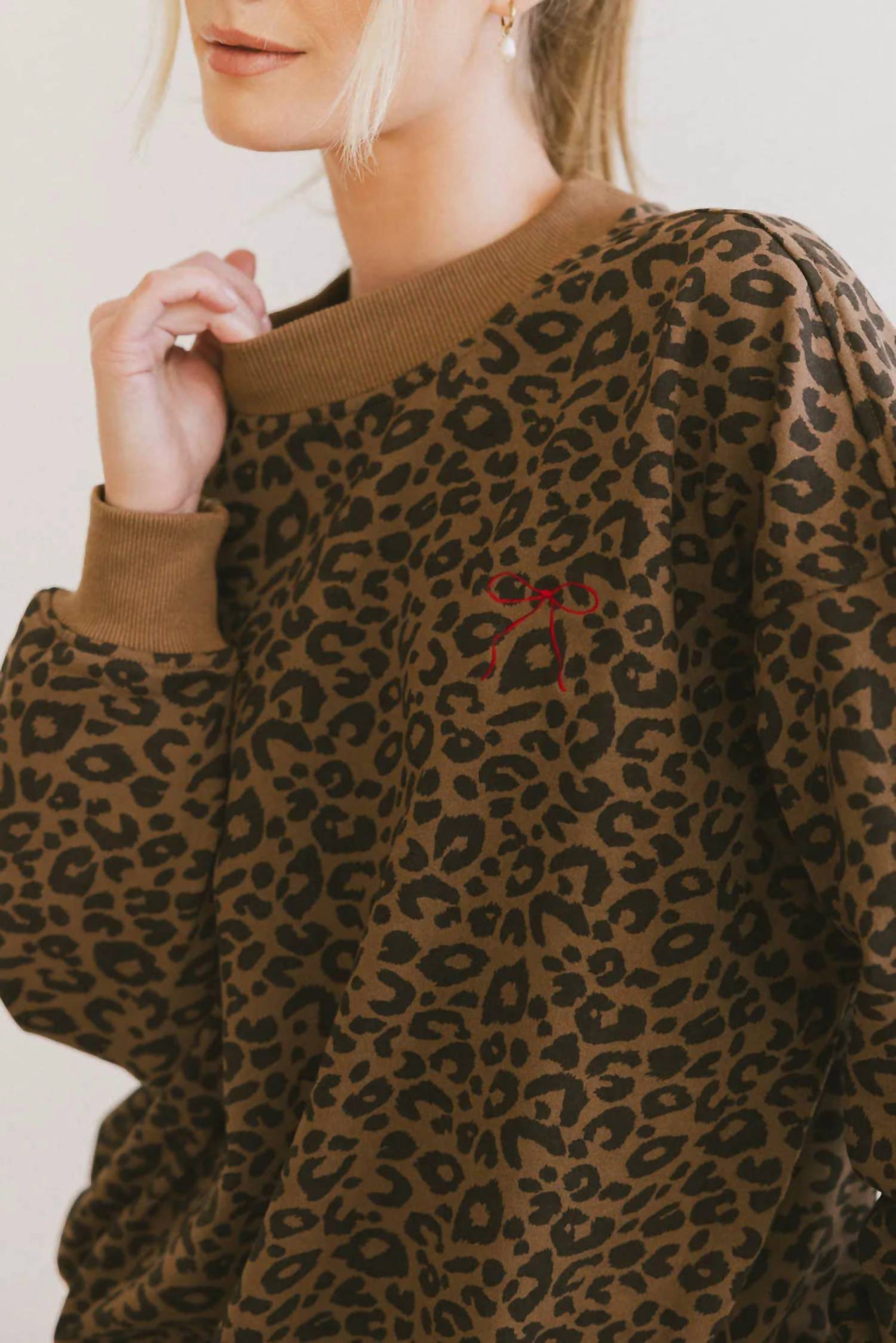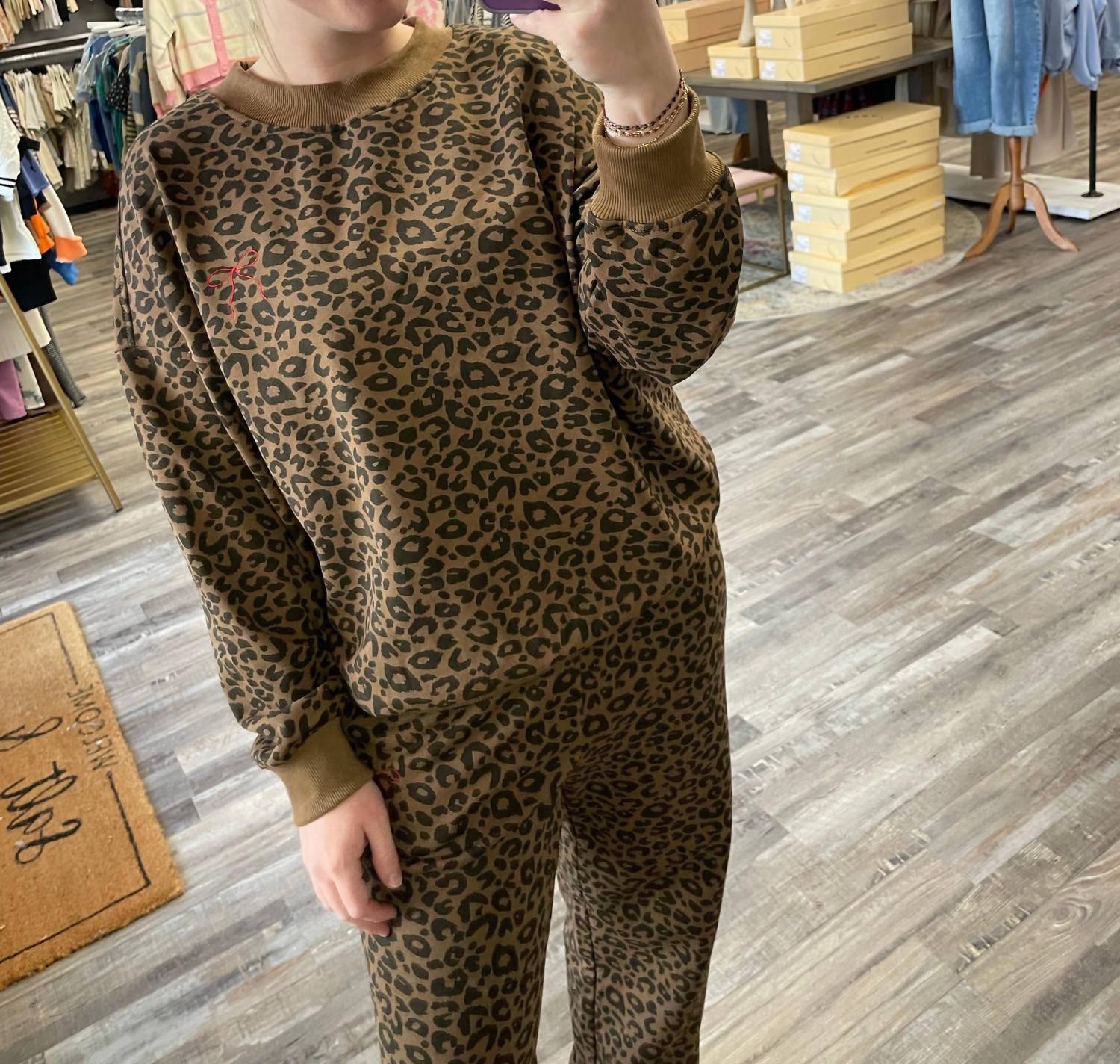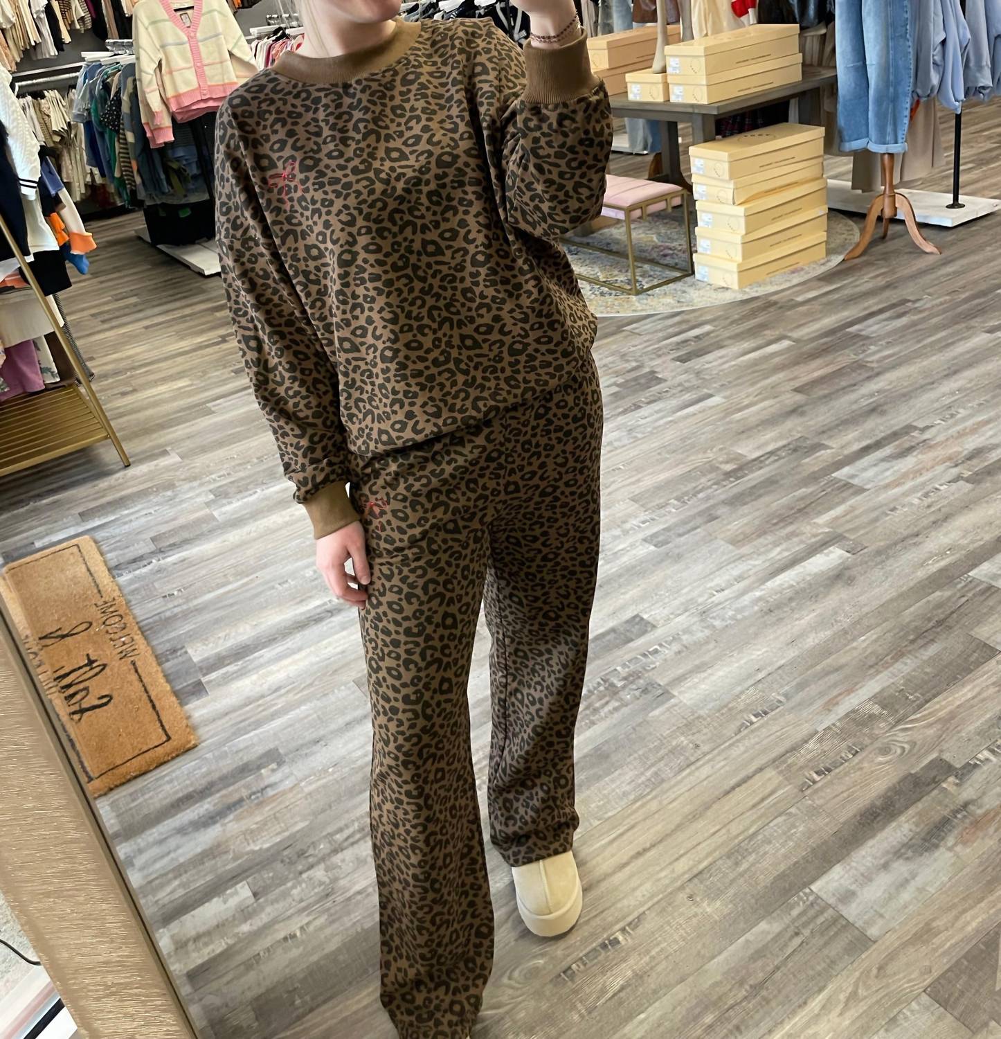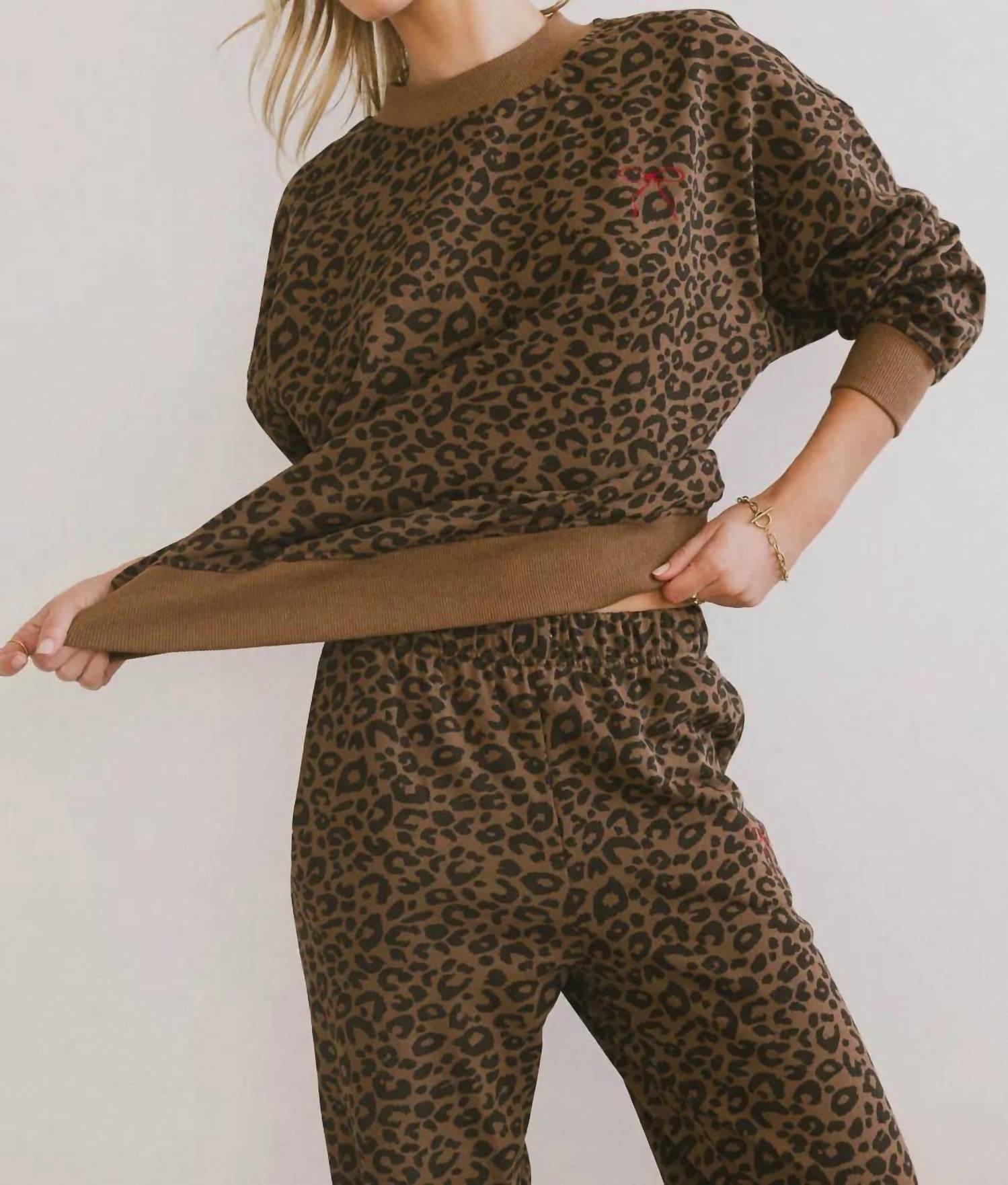 Loungewear doesn't have to be frumpy and this is exactly what we had in mind. Designed for a comfortable fit, this chic little number will be your favorite lounging-at-home look. Embrace leisurely elegance with the Leopard Sweat Set by LE LIS, the perfect choice for relaxed yet chic style. Designed with long sleeves and a crewneck, it showcases an embroidered bow detail for an added touch of sophistication. The set is composed of 100% cotton with a stretch blend of 97% cotton and 3% spandex. Keep this loungewear looking its best by hand washing cold and laying flat to dry.