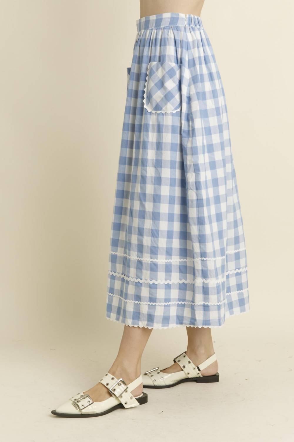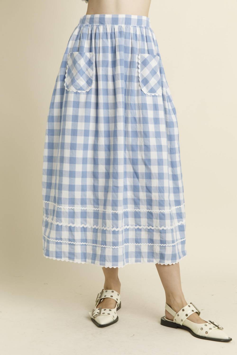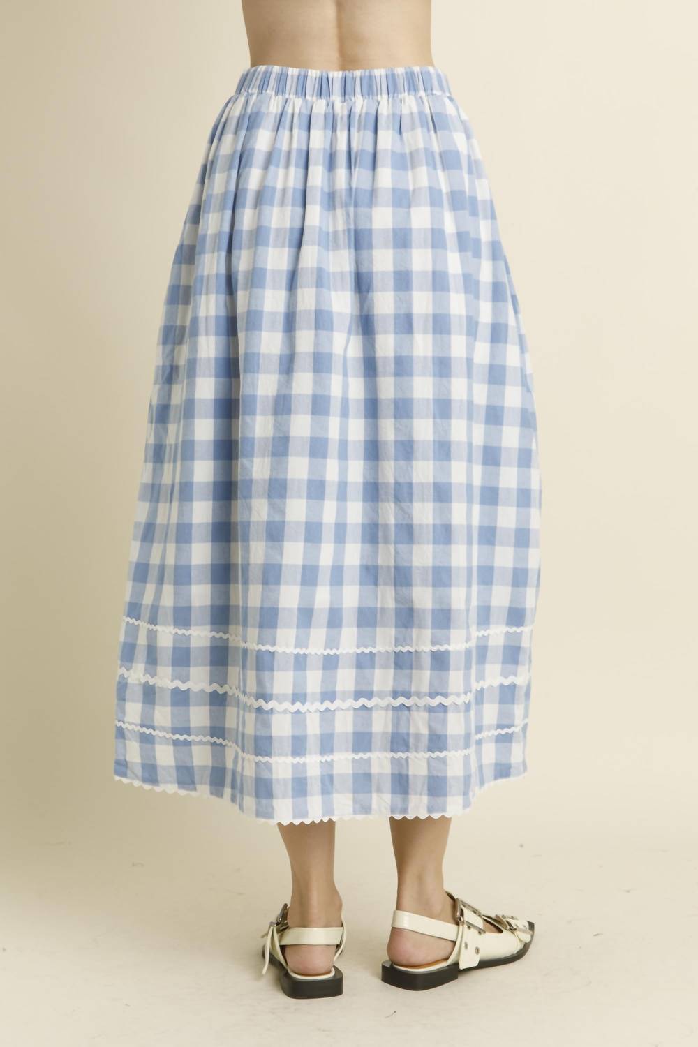 A set so cute you'll never want to take it off. Designed to look good while lounging, this little number is the perfect outfit for hanging at home in style. Elevate your loungewear collection with the Gingham Top And Matching Skirt by Aureum, a charming set perfect for leisurely days. The top features short sleeves and a stylish squareneck, beautifully complementing the blue gingham pattern of the ensemble. Made from a non-stretch cotton fabric, the midi skirt adds a playful touch with ric-rac trim at the pockets and hem, and ensures comfort with an elasticated waistband at the back and a side seam zipper closure. Care for this delightful set by hand washing to maintain the crisp and fresh look.