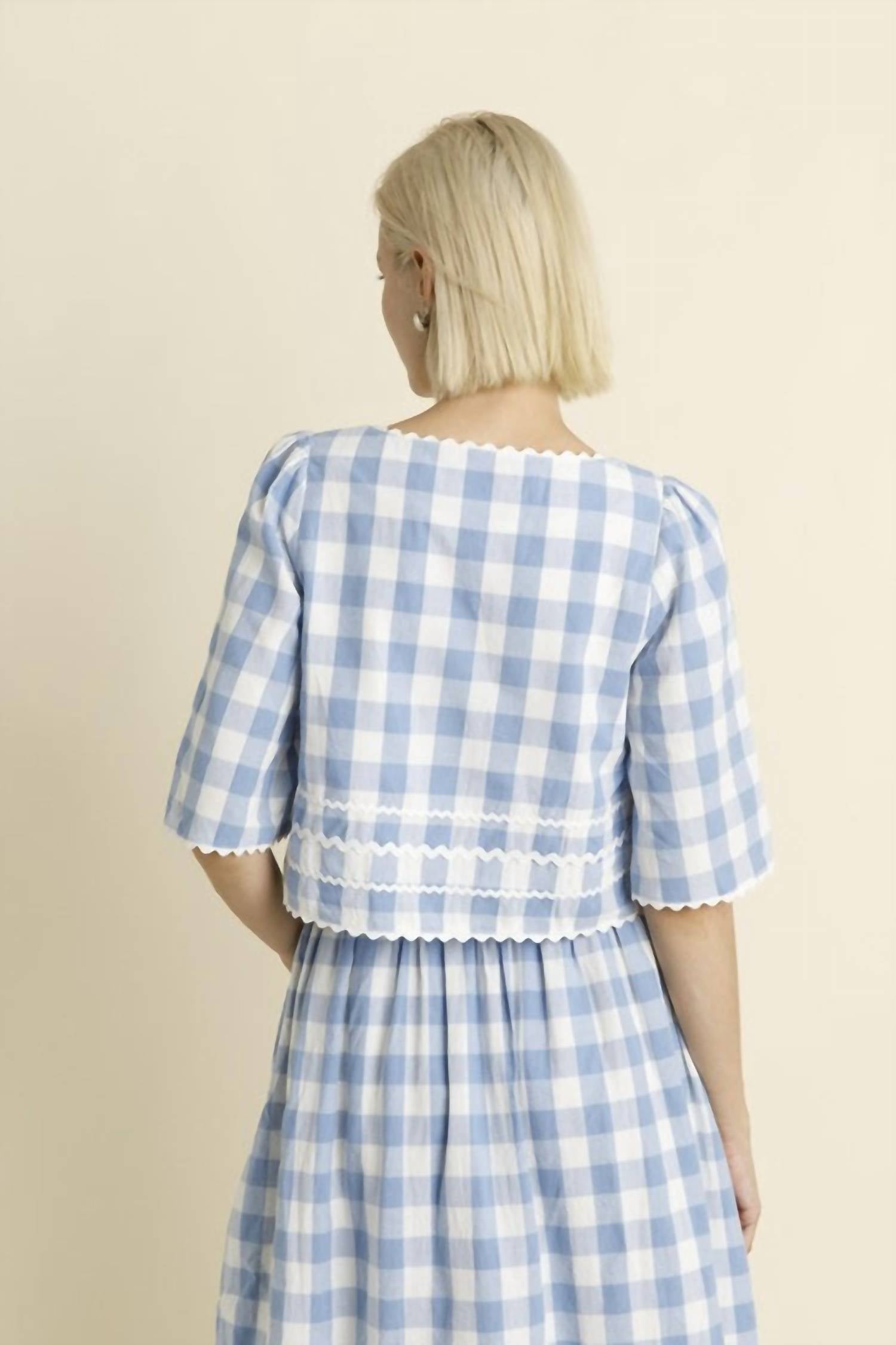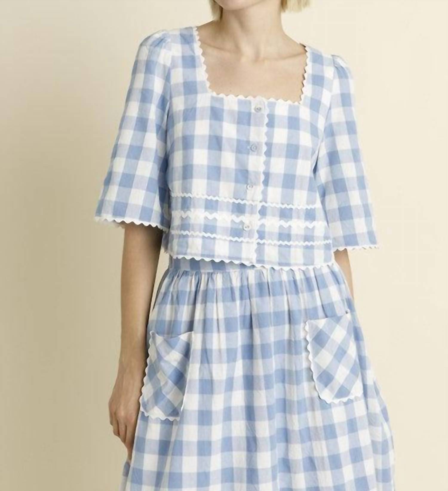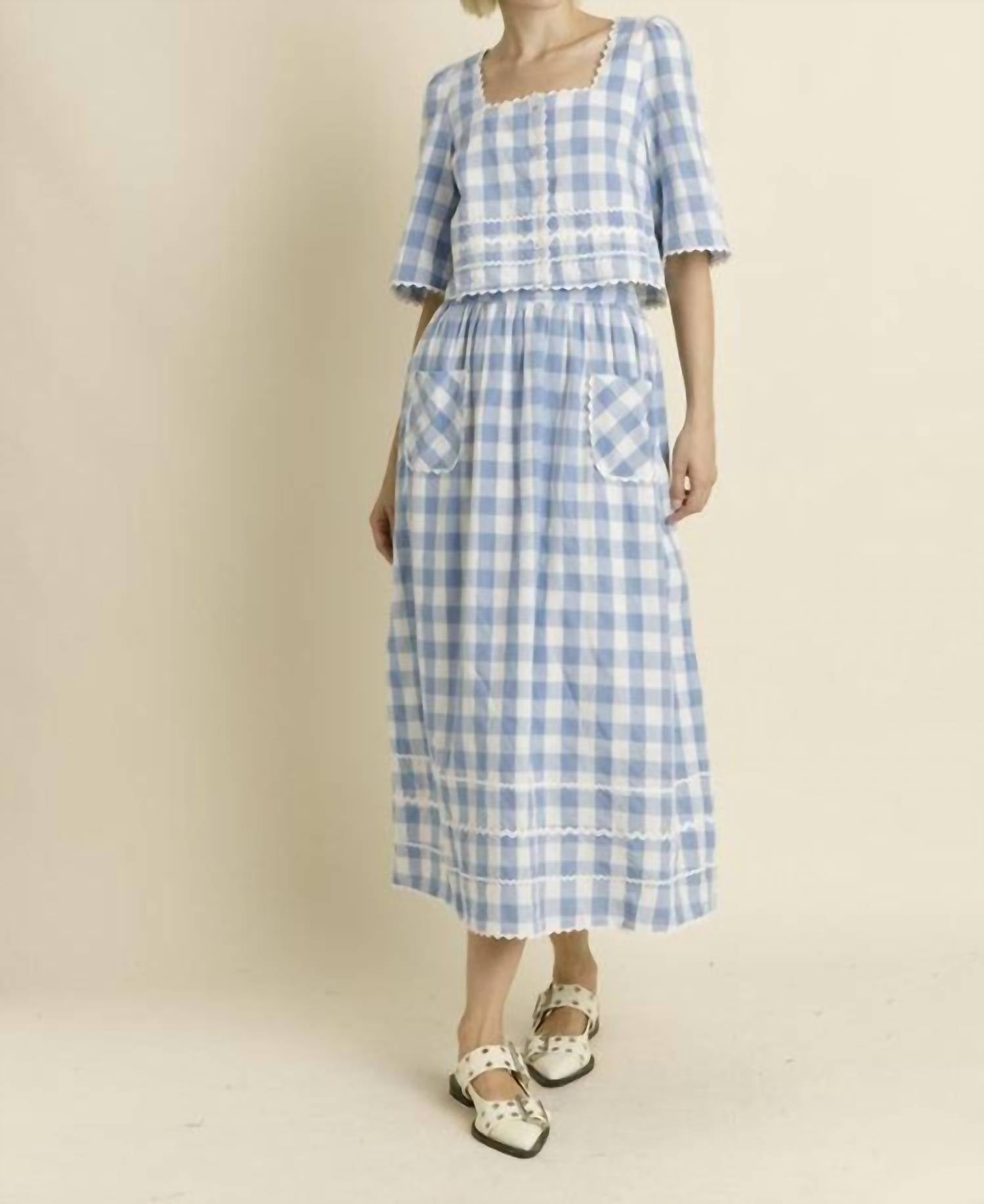 A set so cute you'll never want to take it off. Designed to look good while lounging, this little number is the perfect outfit for hanging at home in style. Elevate your loungewear collection with the Gingham Top And Matching Skirt by Aureum, a charming set perfect for leisurely days. The top features short sleeves and a stylish squareneck, beautifully complementing the blue gingham pattern of the ensemble. Made from a non-stretch cotton fabric, the midi skirt adds a playful touch with ric-rac trim at the pockets and hem, and ensures comfort with an elasticated waistband at the back and a side seam zipper closure. Care for this delightful set by hand washing to maintain the crisp and fresh look.