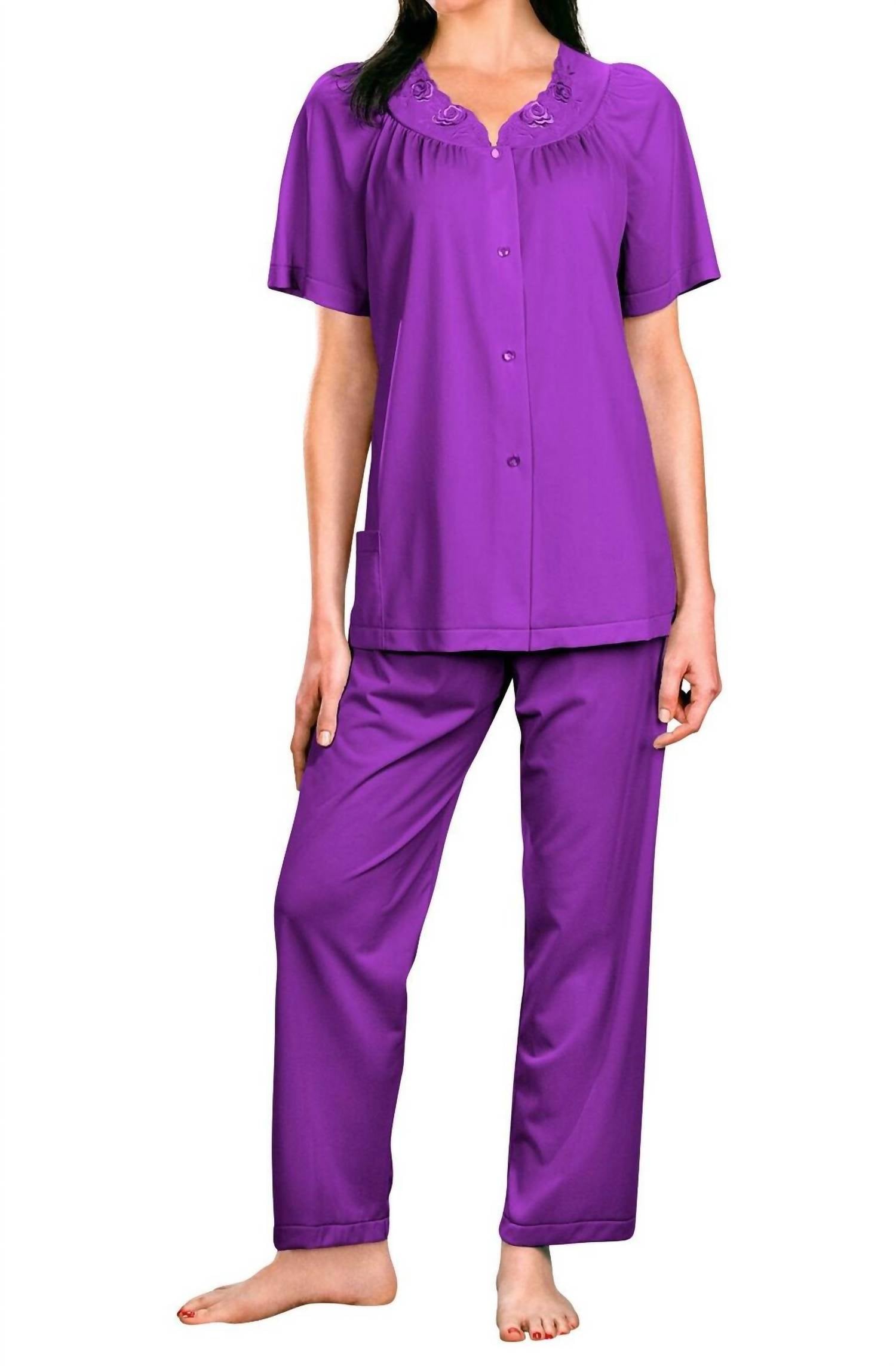 The perfect piece to lounge in, sleep in, and cook breakfast in. Introducing the Petals Short Sleeve Pajama by Shadowline Lingerie, crafted for ultimate comfort and style in a soothing purple hue. Made from 100% Opacitrique® nylon tricot, this short-sleeve pajama set features exquisite embroidered yoke with signature petals design, offering a luxurious feel with every wear. Made in the USA using imported fabric, it boasts a pull-on closure with a 28-inch inseam for the bottoms, designed to provide a relaxed fit. Care instructions include machine wash and tumble dry, ensuring easy maintenance while retaining its soft comfort.