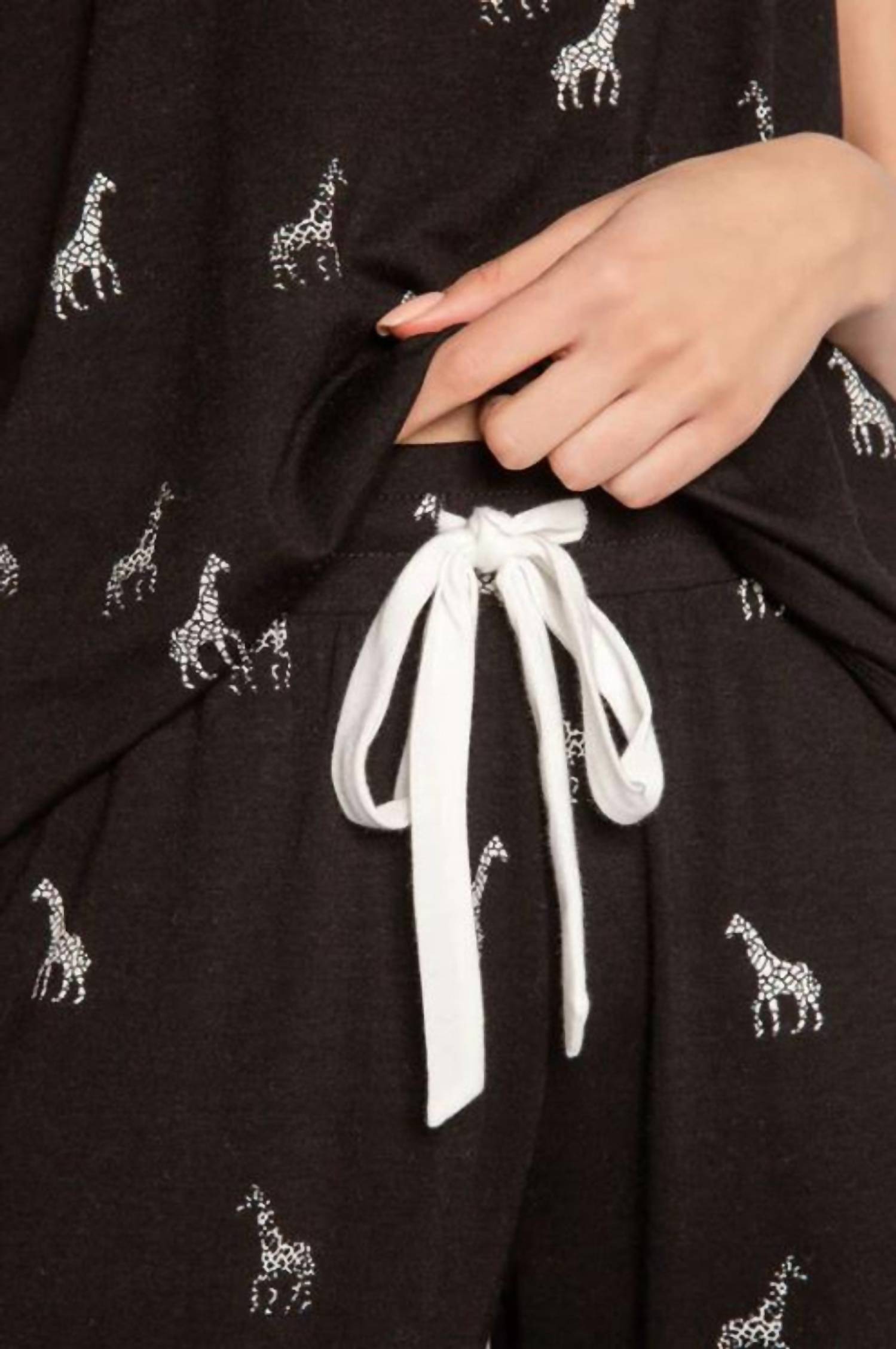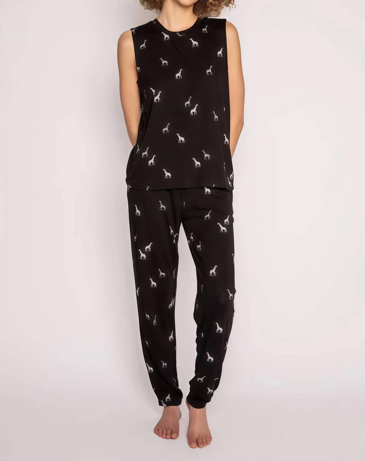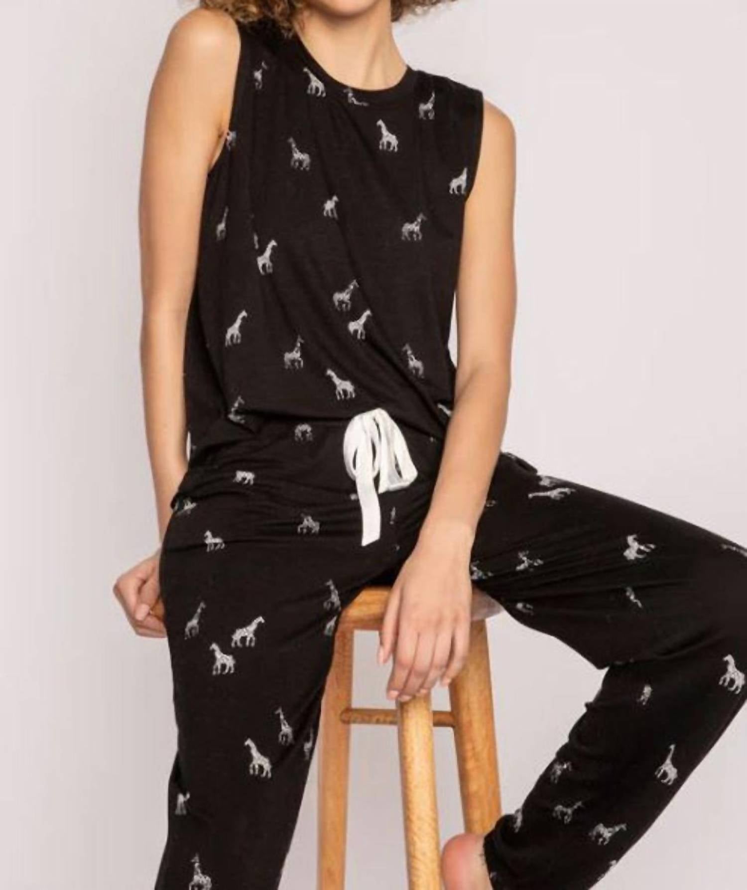 A match made in heaven. This two-piece set is so cute, you'll wish you could wear it out of the house! Did we mention how comfortable it is, too? You may want two sets! PJ Salvage presents the Giraffe Manor Lounge Set, an embodiment of comfort and style perfect for any lounging occasion. This sleeveless set, made of 95% modal and 5% elastane, offers a crew neckline and comes in a chic black color. With a drawstring waistband on the banded pajama pants, it ensures a perfect fit, while its jersey material, infused with aloe, provides a soothing touch. Originating from imported sources, this lounge set is easy to care for with machine wash and low tumble dry instructions.