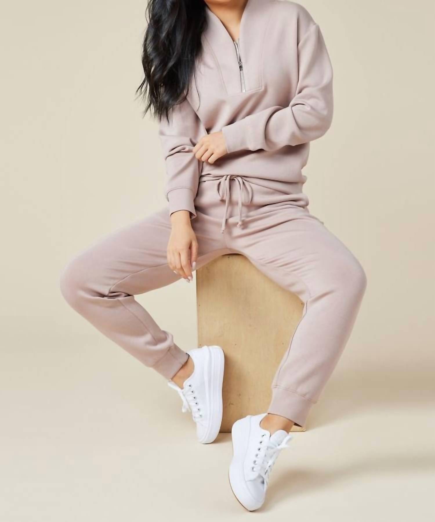 A set so cute you'll never want to take it off. Designed to look good while lounging, this little number is the perfect outfit for hanging at home in style. Introducing the SOFTiES Dreamtech 1/4 Zip Jogger Set in Cocoa, a must-have for the modern woman’s wardrobe. This loungewear set features a long sleeve, quarter-zip top with a V-neck and jogger pants with side pockets and a 27” inseam. Crafted from Softies DreamTech fabric, it comprises 81% polyester, 14% rayon, and 5% spandex, ensuring durability and comfort. Care: This set is easy care, colorfast, and machine washable, making it a versatile addition to your seasonal collection.
