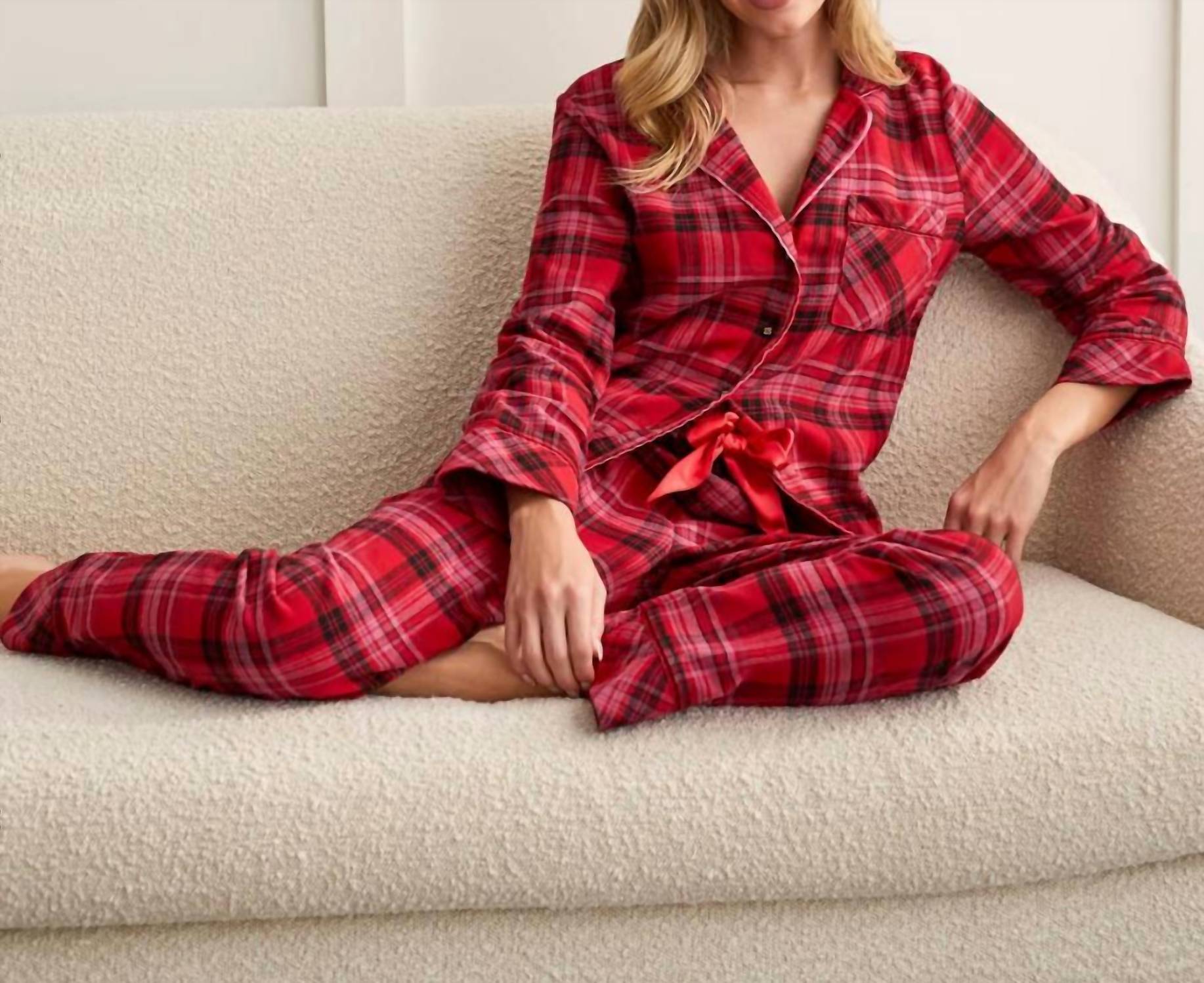 Works well with naps, zoom calls and binging your favorite series. Stay cozy and stylish with the TRIBAL Plaid Pajama Set, perfect for women who love classic sleepwear. This set features a long sleeve top with a button-up collared neckline, crafted from 100% super soft flannel for ultimate comfort. The red plaid pattern adds a trendy touch, while the button closure and elastic waistband on the bottoms ensure a perfect fit. Made for easy care, this set is machine washable and should be line dried, making it a great addition to your nighttime routine. Available in sizes S-XXL.
