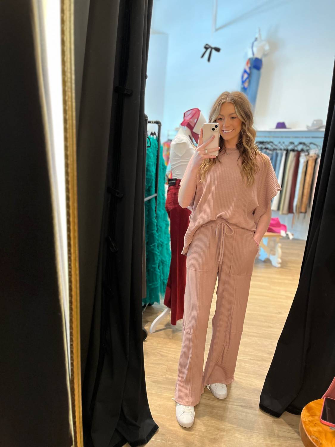 A match made in heaven. This two-piece set is so cute, you'll wish you could wear it out of the house! Did we mention how comfortable it is, too? You may want two sets! Experience the blend of comfort and elegance with the Bella Loungewear Set by Blumin in Taupe. This women's loungewear set features a textured design with short sleeves and a crewneck top, offering an oversized fit. Crafted from a cotton blend of 92% Cotton and 8% Spandex, it ensures flexibility and ease with its elastic waistband and practical pockets. The top measures 25" to 28" from shoulder to hem, and pants range from 41" to 43.5" in length, offering generous comfort for lounging.