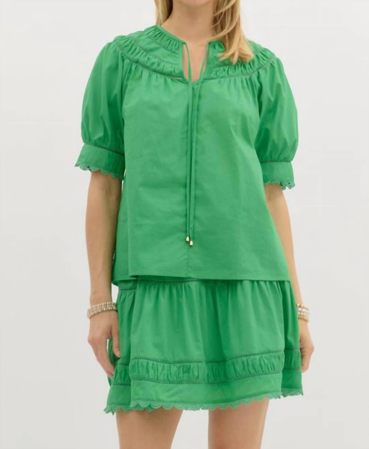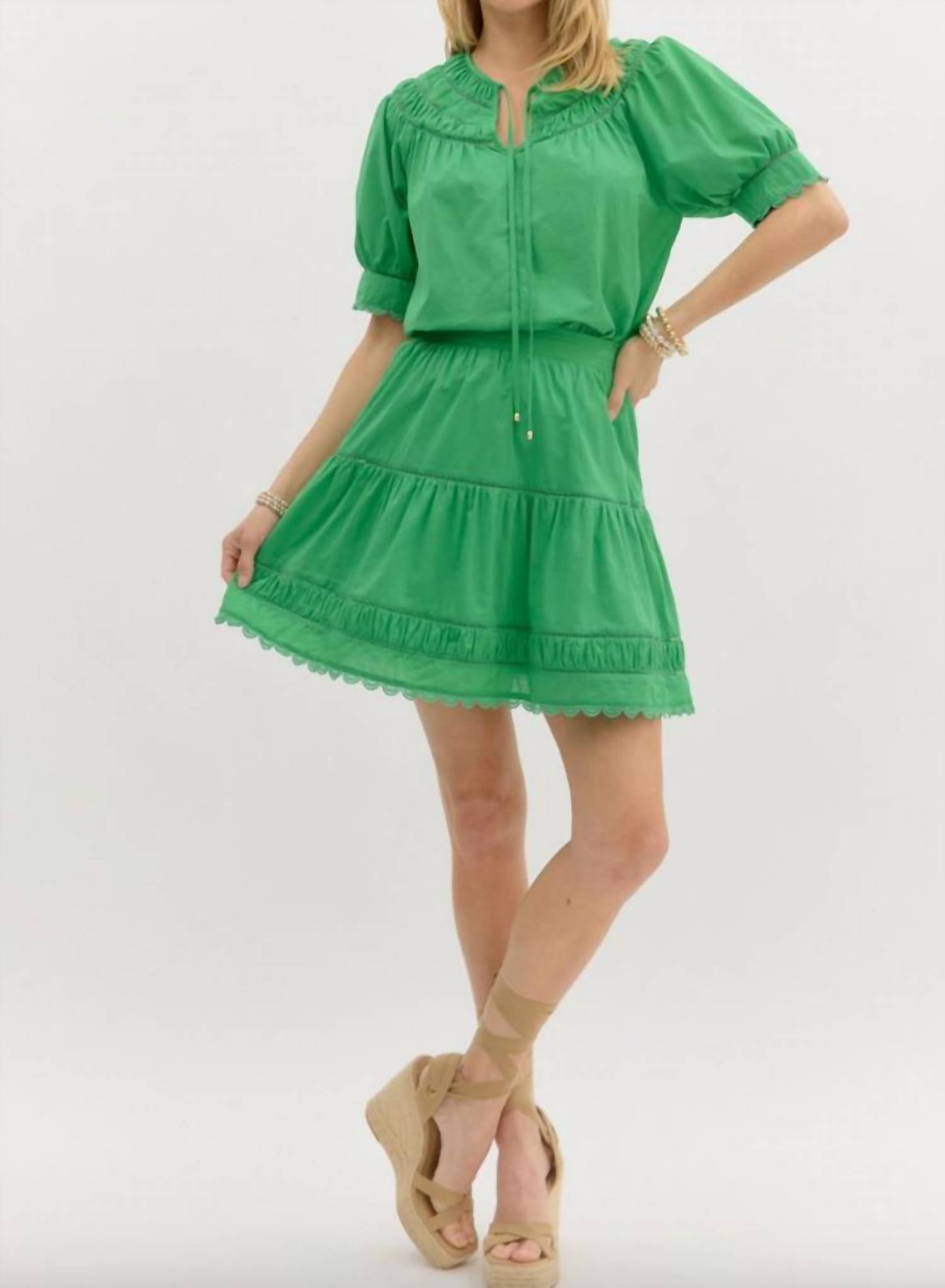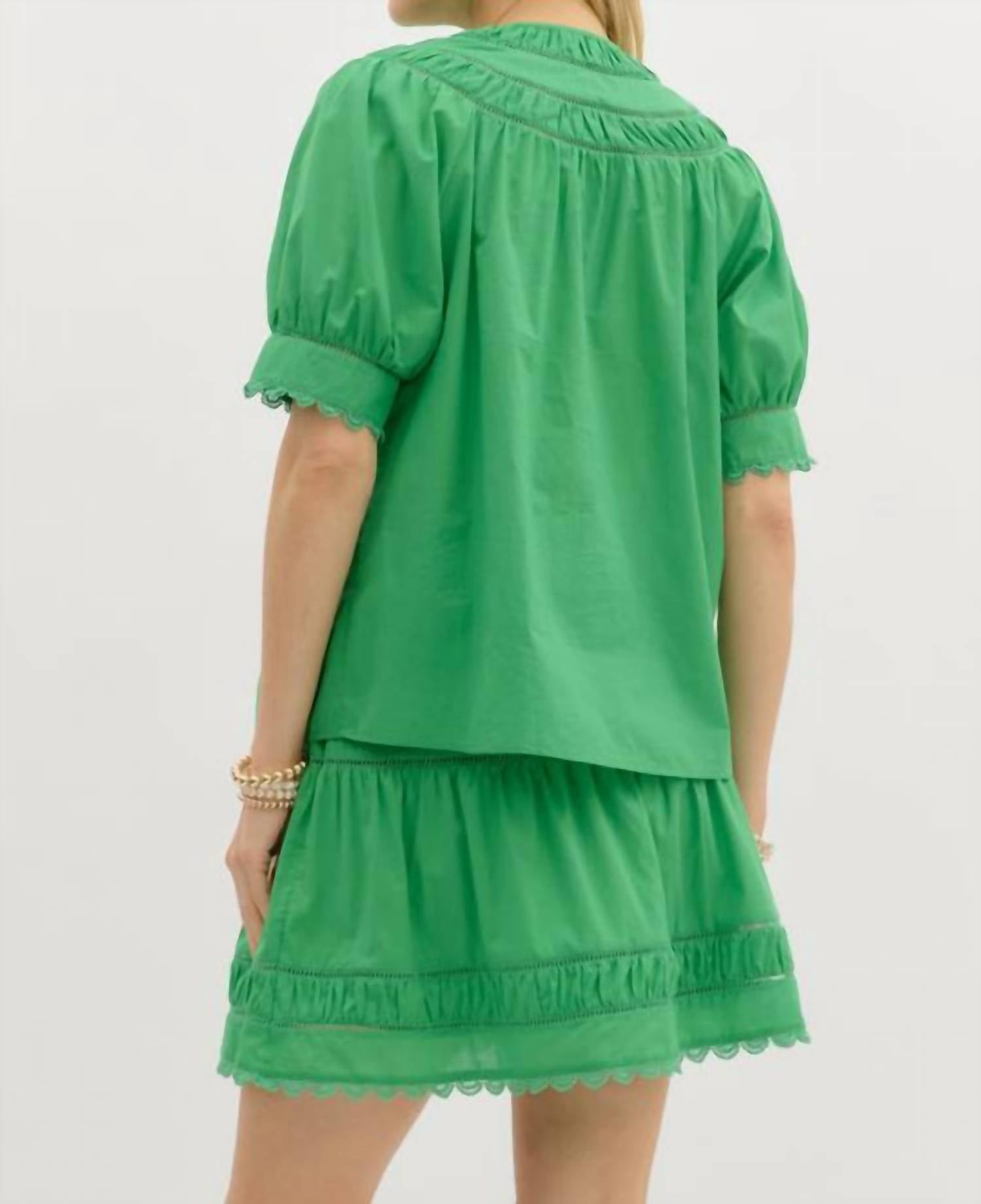 A set so cute you'll never want to take it off. Designed to look good while lounging, this little number is the perfect outfit for hanging at home in style. Elevate your seasonal wardrobe with the Lucky You Set by Entro, a perfect choice for Spring or Summer. This green loungewear set includes a top with short sleeves, featuring a simple V-neck and eyelet detailing across the chest. The skirt, designed to hit right above the knee, offers a side zipper closure and elastic back for comfort, with matching eyelet details seamlessly tying the set together. Crafted with intricate edging on the sleeves, this ensemble merges style with sophistication.