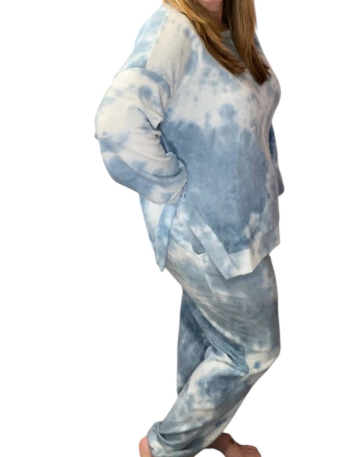 Lounge Set include: Top - Crew neckline. Long sleeves. Pullover style. Bottom - Pull-on style. Straight leg. Tie dye. True to size. Relaxed fit. 78% Polyester 18% Rayon 4% Spandex.