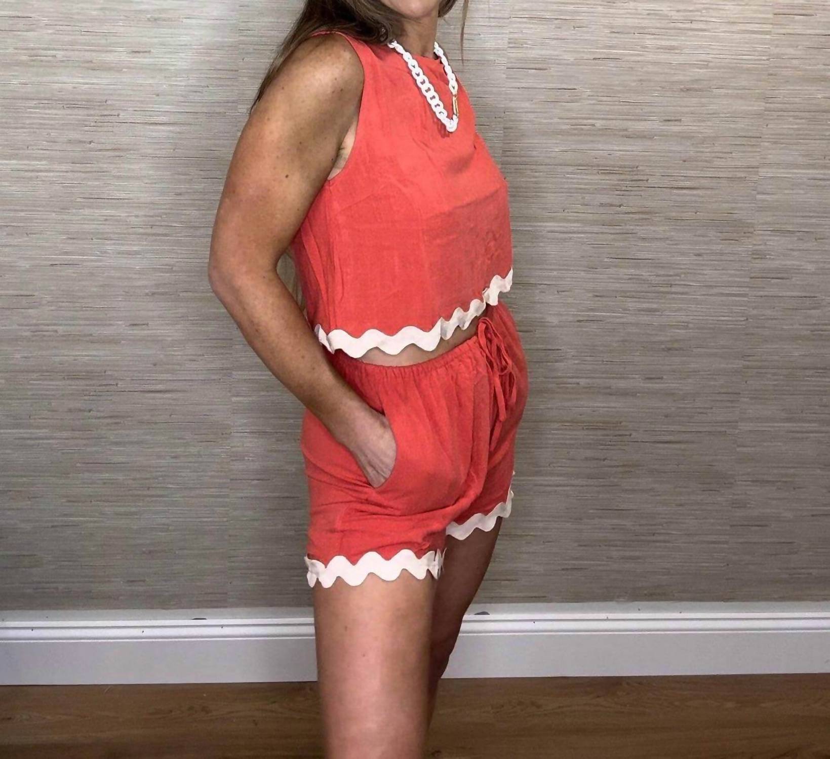 A match made in heaven. This two-piece set is so cute, you'll wish you could wear it out of the house! Did we mention how comfortable it is, too? You may want two sets! Embrace your playful side with the Ric Rac Trim Short Set by AnnieWear, a perfect choice for casual summer occasions. Crafted in a stylish coral hue, this sleeveless set features a standout ric rac trim design. Its comfortable fit ensures you stay at ease whether lounging at home or celebrating Valentine's Day in style. The set is machine washable for easy care.