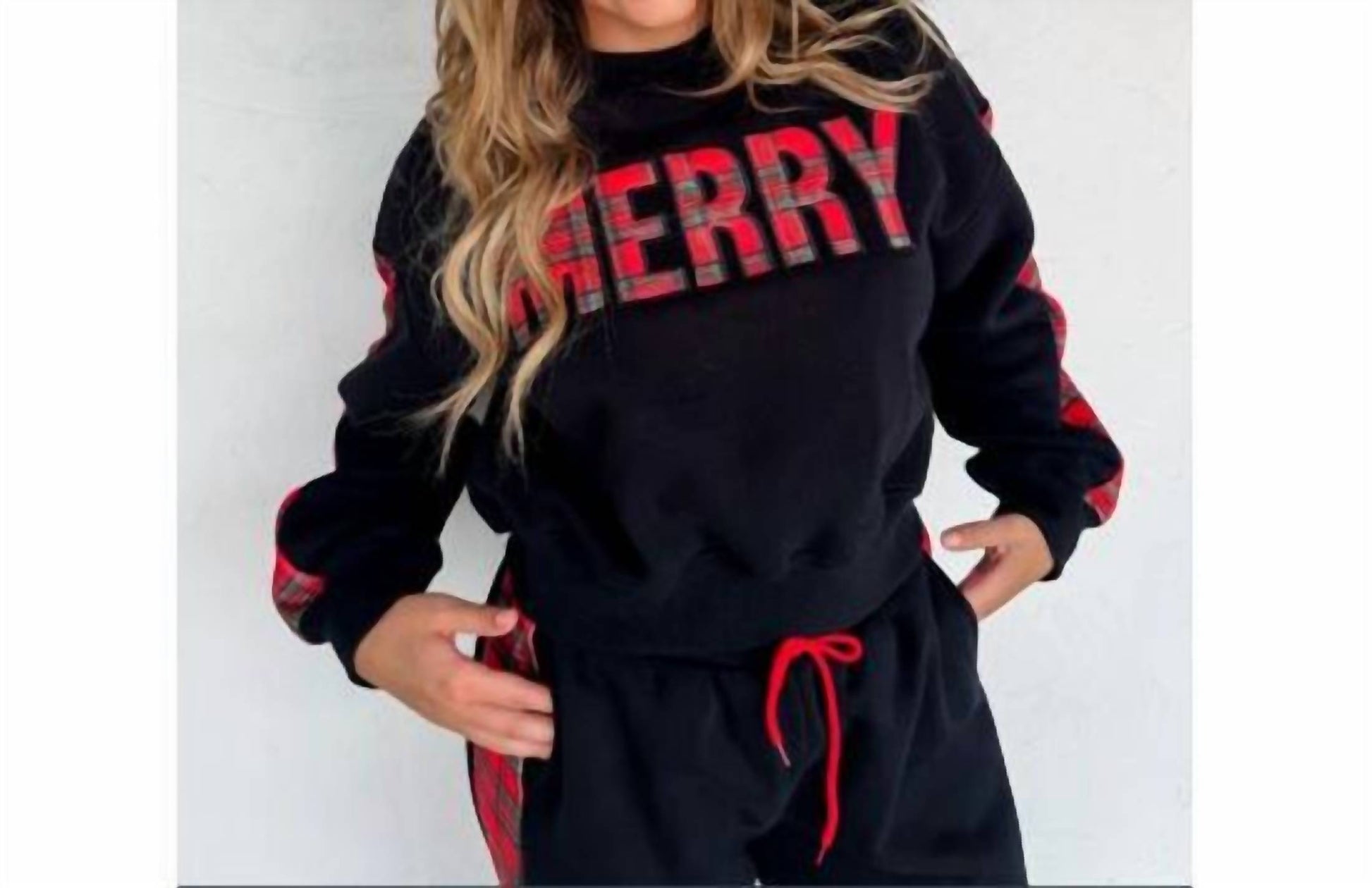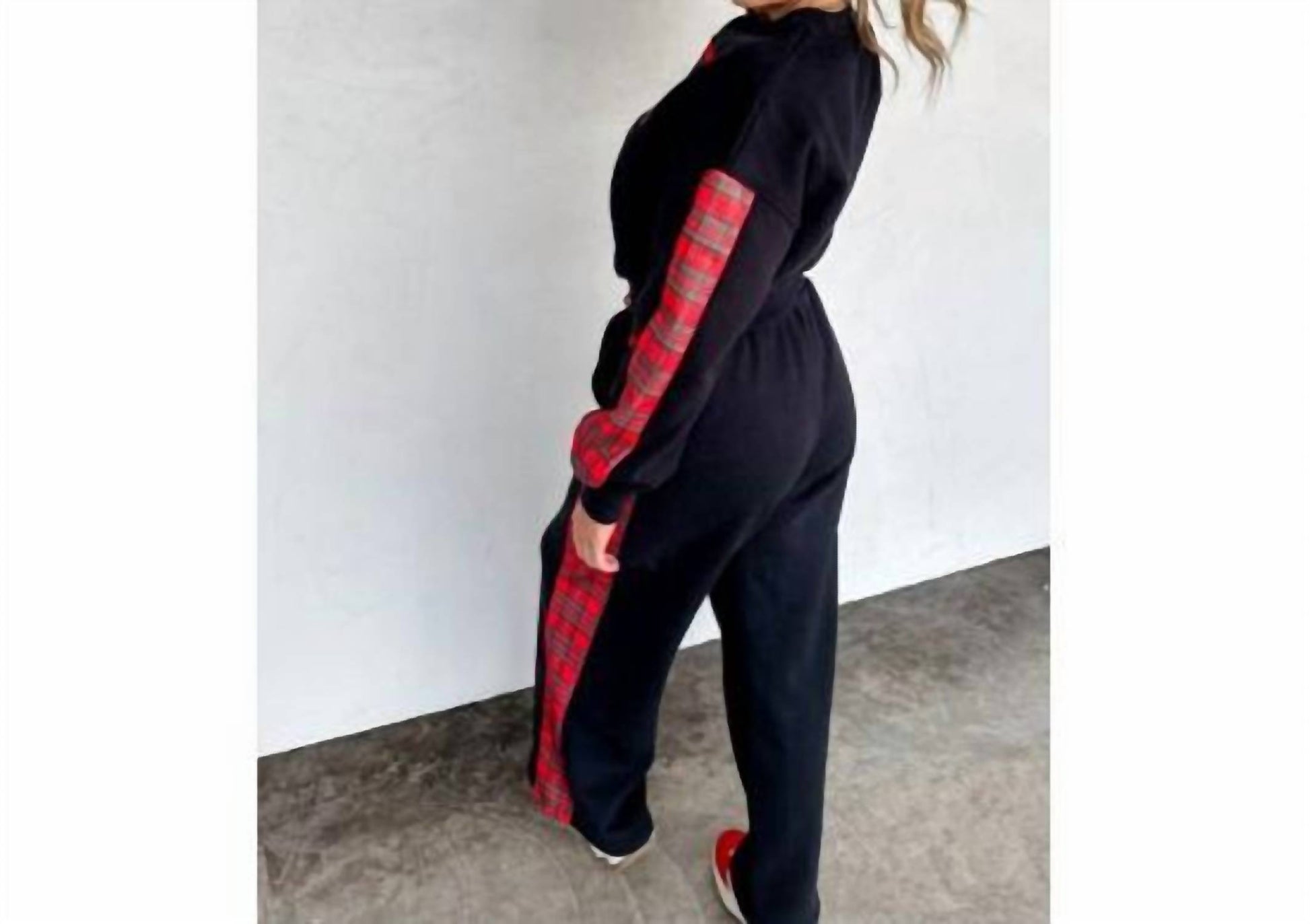A set so cute you'll never want to take it off. Designed to look good while lounging, this little number is the perfect outfit for hanging at home in style. Celebrate the season with the Blakely Merry Plaid Sweatsuit Set, a black loungewear ensemble perfect for winter festivities. This eye-catching set features long sleeves with bold red plaid details and a crewneck sweatshirt, complemented by joggers with coordinating plaid side stripes. Crafted from a 50% Cotton and 50% Polyester blend, it offers a cozy fleece interior and a relaxed fit, complete with a stretchy waistband and red drawstring. Sizes range from XS (0-4) to 1X (16), making it ideal for lounging or stepping out in effortless holiday style.