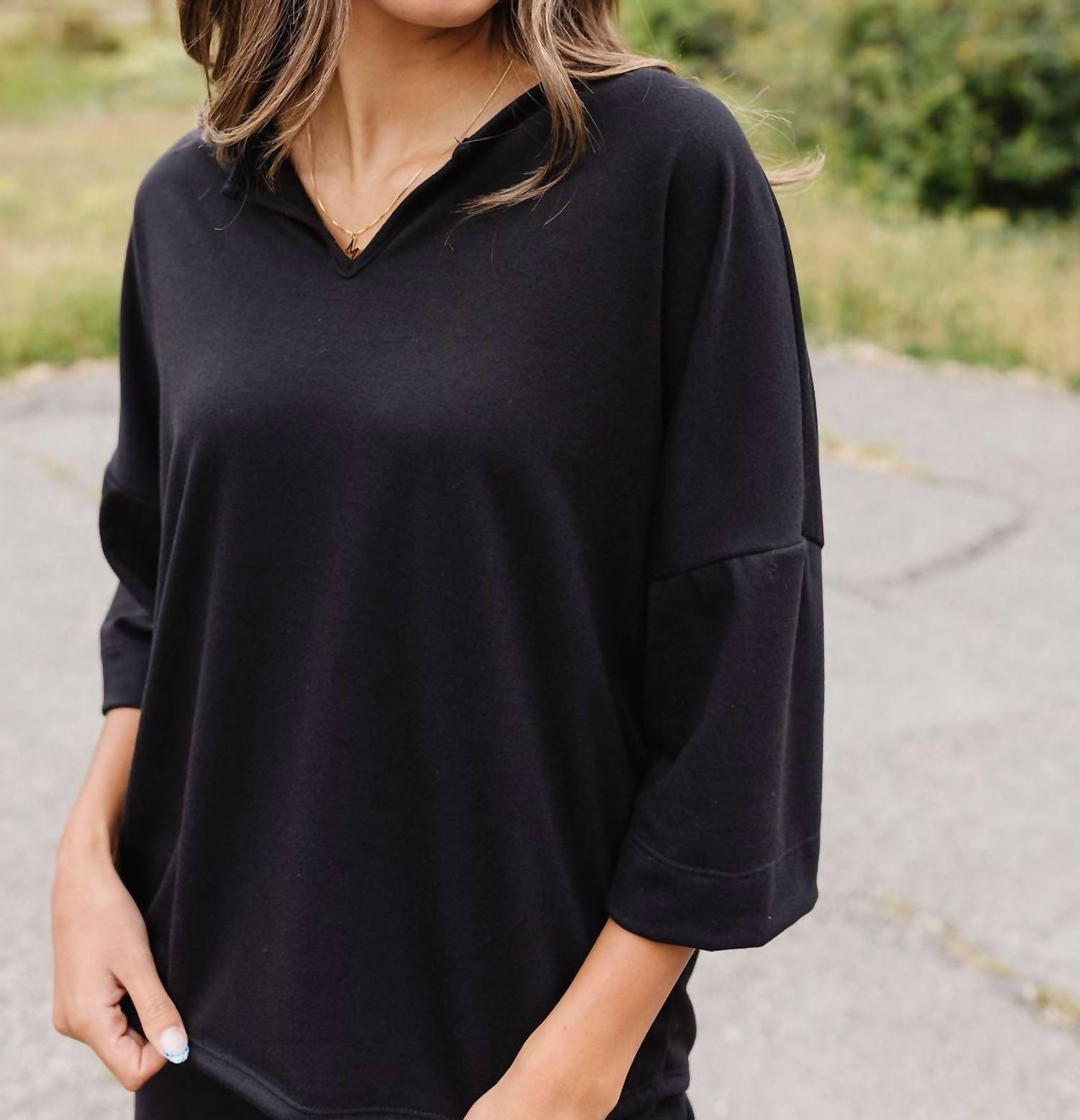 A set so cute you'll never want to take it off. Designed to look good while lounging, this little number is the perfect outfit for hanging at home in style. Experience the perfect blend of comfort and style with the Avonlea Drop Shoulder Top and Elastic Waist Pants Set by Blumin. This monochrome loungewear set features a drop shoulder top with a chic open V-neck collar and three-quarter sleeves, ensuring you stay effortlessly stylish. Crafted from a soft blend of 96% polyester and 4% spandex, it offers a flattering fit with the elastic waist pants. Country of origin is unspecified. Care for this solid black set is simple with dry clean instructions.