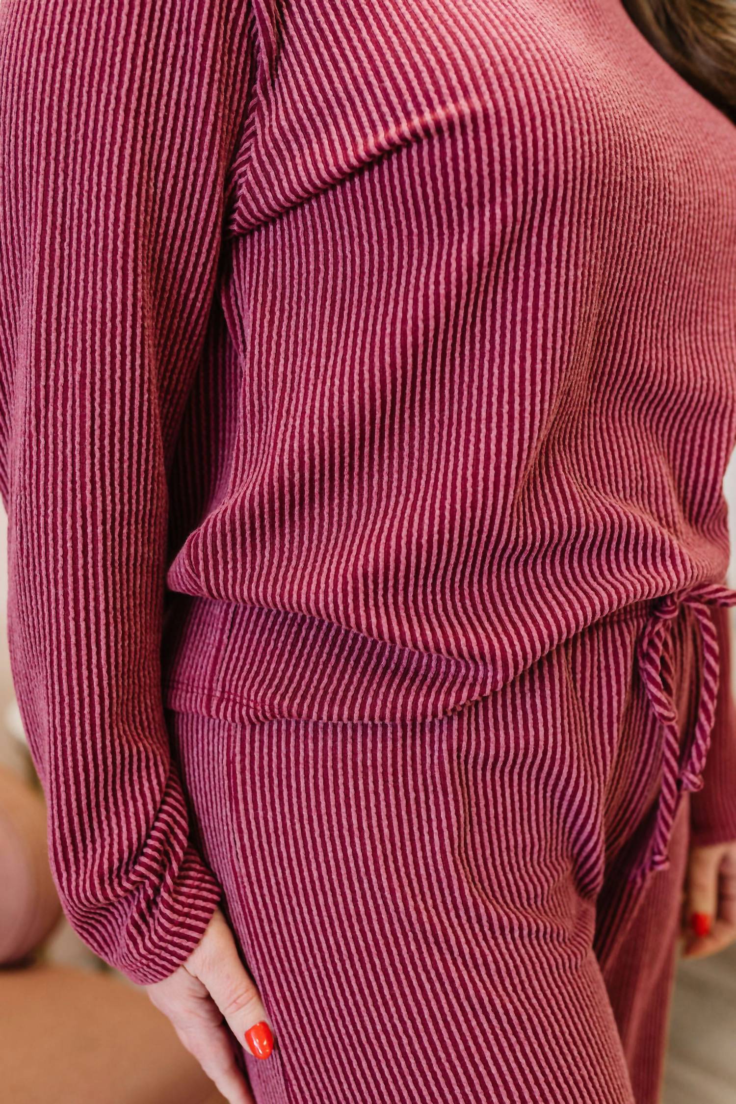 A set so cute you'll never want to take it off. Designed to look good while lounging, this little number is the perfect outfit for hanging at home in style. Discover the perfect balance of style and comfort with the Honor V-neck Top And Cropped Stretchy Pants Set by Blumin. This loungewear set in rich burgundy features long sleeves and textured fabric, providing a chic monochrome look for spring vacations or Easter gatherings. Crafted with a top composition of 76% Polyester, 21% Rayon, and 3% Spandex, and pants made of 96% Polyester and 4% Spandex, this ensemble offers a tailored fit with an elastic waist and bow detail. For best results, hand wash and line dry; dry cleaning is also recommended.