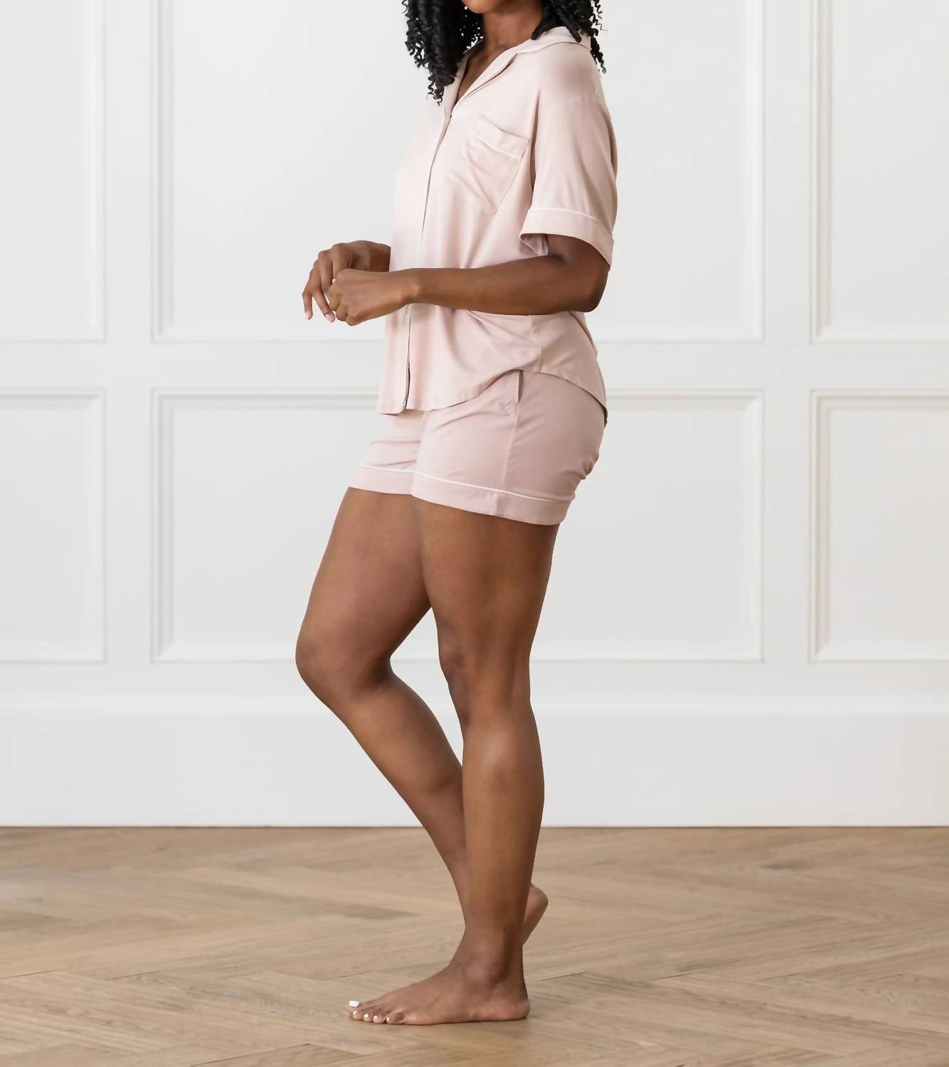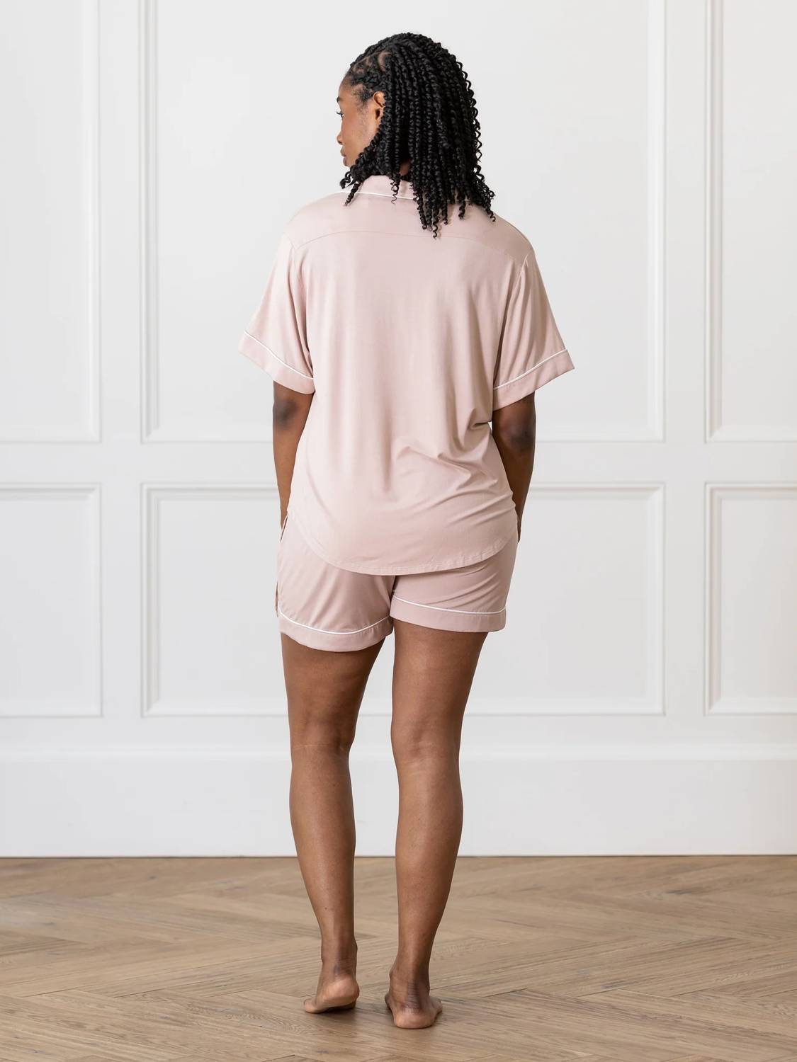 A set so cute you'll never want to take it off. Designed to look good while lounging, this little number is the perfect outfit for hanging at home in style. Discover the epitome of comfort with the Cozy Earth Short Sleeve PJ Set in a soothing blush hue, perfect for minimalist summer loungewear. This solid-colored set is crafted from a luxurious viscose blend, comprising 95% bamboo viscose and 5% spandex, offering a silky smooth touch against the skin. It features short sleeves and a classic collar neckline, making it a stylish choice for Thanksgiving relaxation. Though care instructions are not specified, the quality and design promise a delightful bedtime experience.