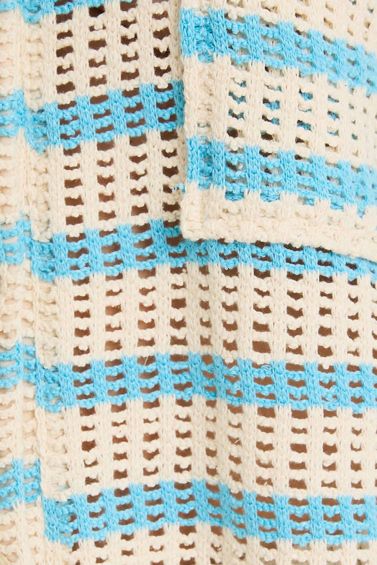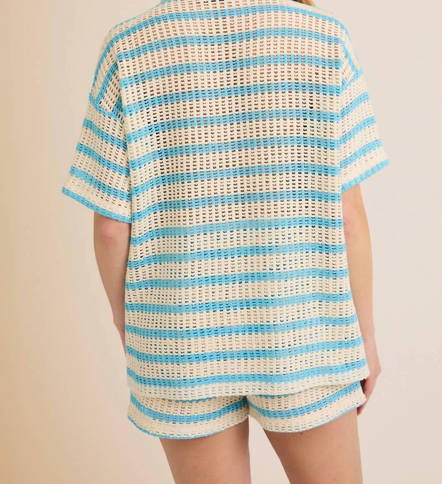 Loungewear doesn't have to be frumpy and this is exactly what we had in mind. Designed for a comfortable fit, this chic little number will be your favorite lounging-at-home look. Embrace seaside elegance with the Cove Crochet Set by GILLI, a boho chic ensemble perfect for a beach day. This short sleeve, button-up shirt and short set features a charming blue and taupe stripe pattern, making it an ideal choice for lounging or as a stylish bathing suit cover-up. The set embodies a breezy, summertime allure, designed for the modern woman. Enjoy effortless comfort and distinctive style on your next ocean outing.
