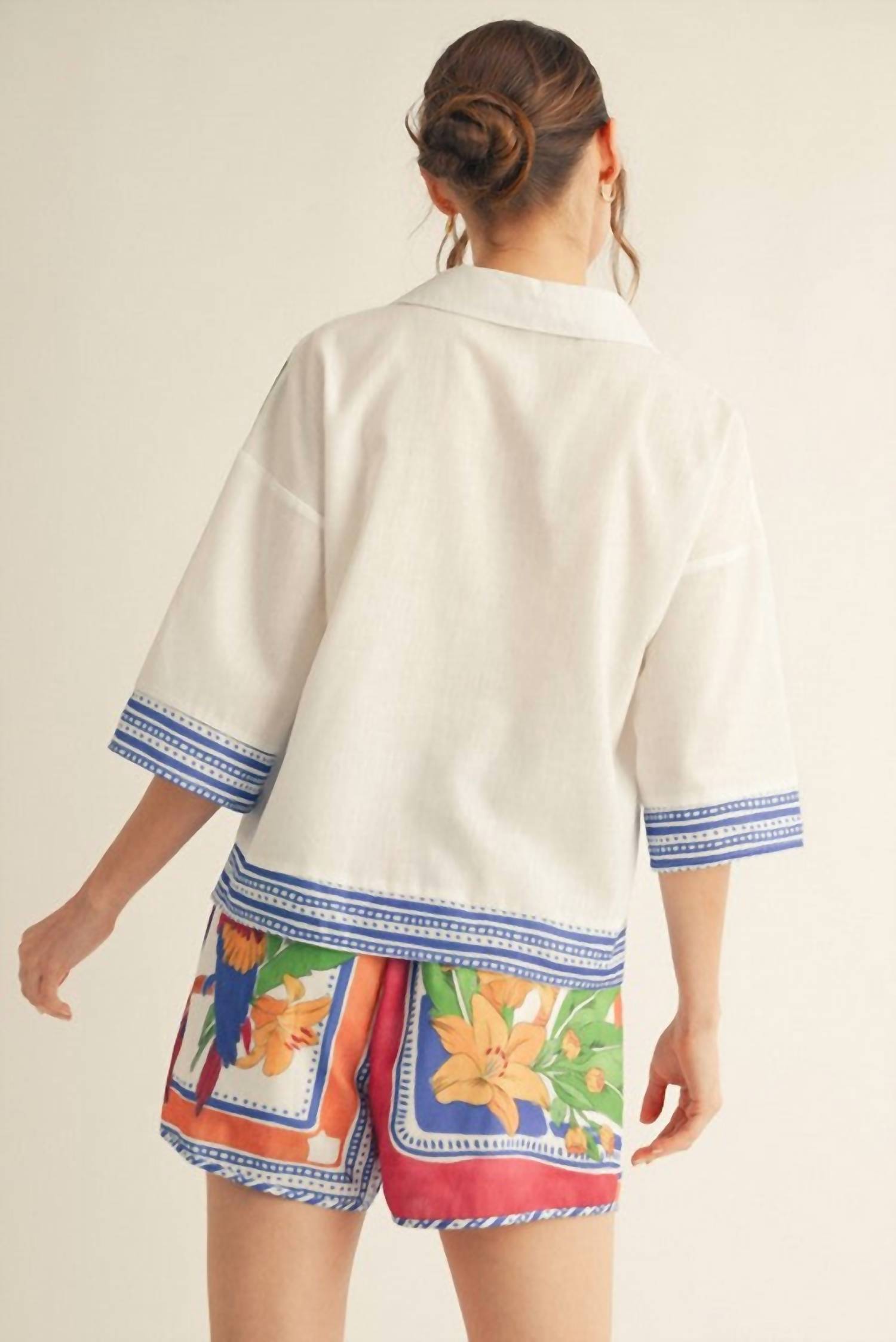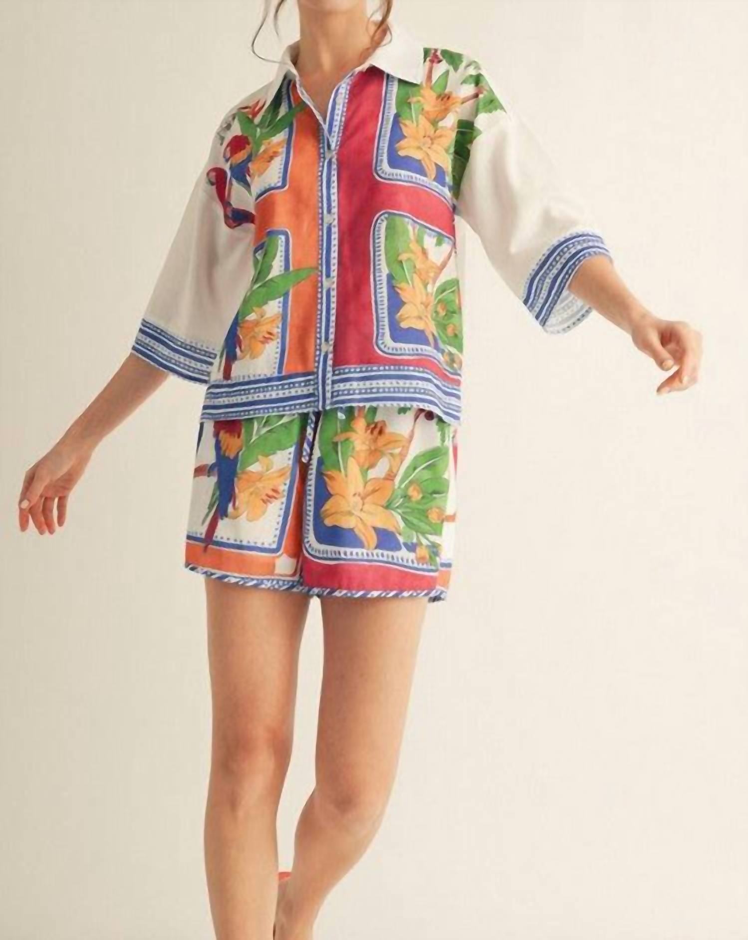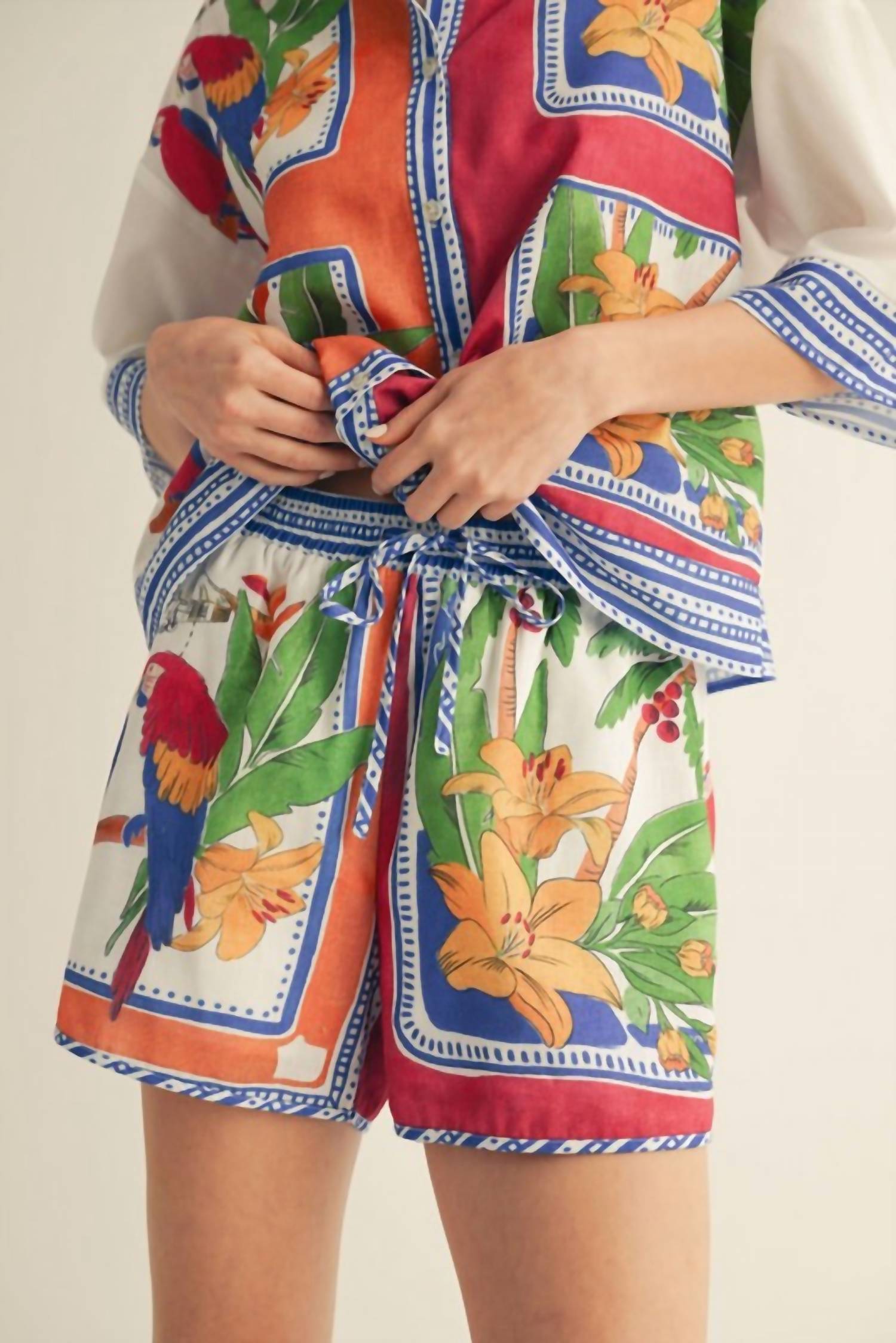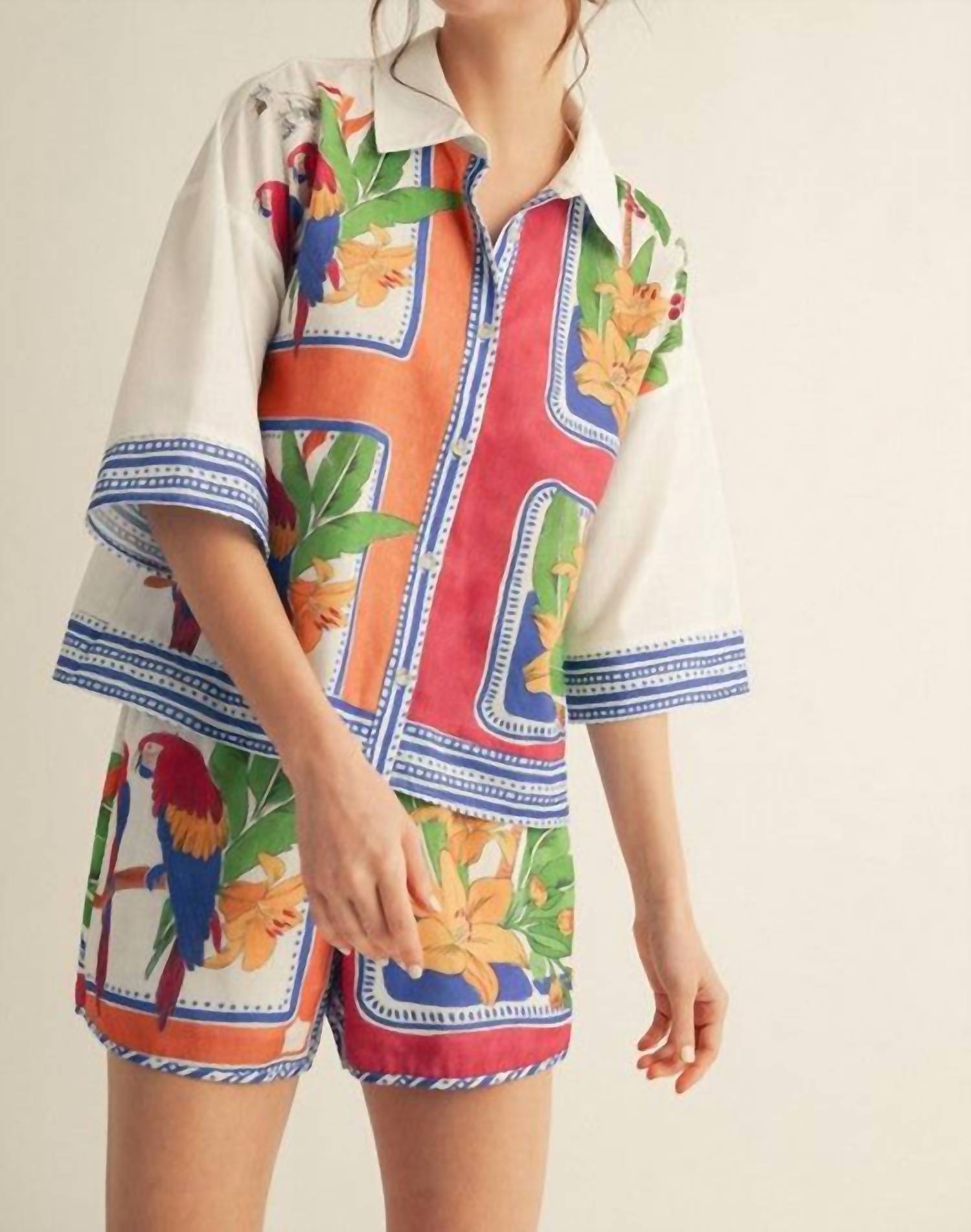 A set so cute you'll never want to take it off. Designed to look good while lounging, this little number is the perfect outfit for hanging at home in style. Embrace the season's charm with the Parrott Matching Set by Jodifl, a playful loungewear ensemble in multicolor perfect for women. The three-quarter sleeve top showcases a vibrant graphic pattern with a stylish collared neckline and a comfortable drawstring waist. Crafted from 100% linen, this breathable set includes shorts with side pockets, ideal for warmer weather. Care: Machine wash and line dry, available in sizes Small to Large.