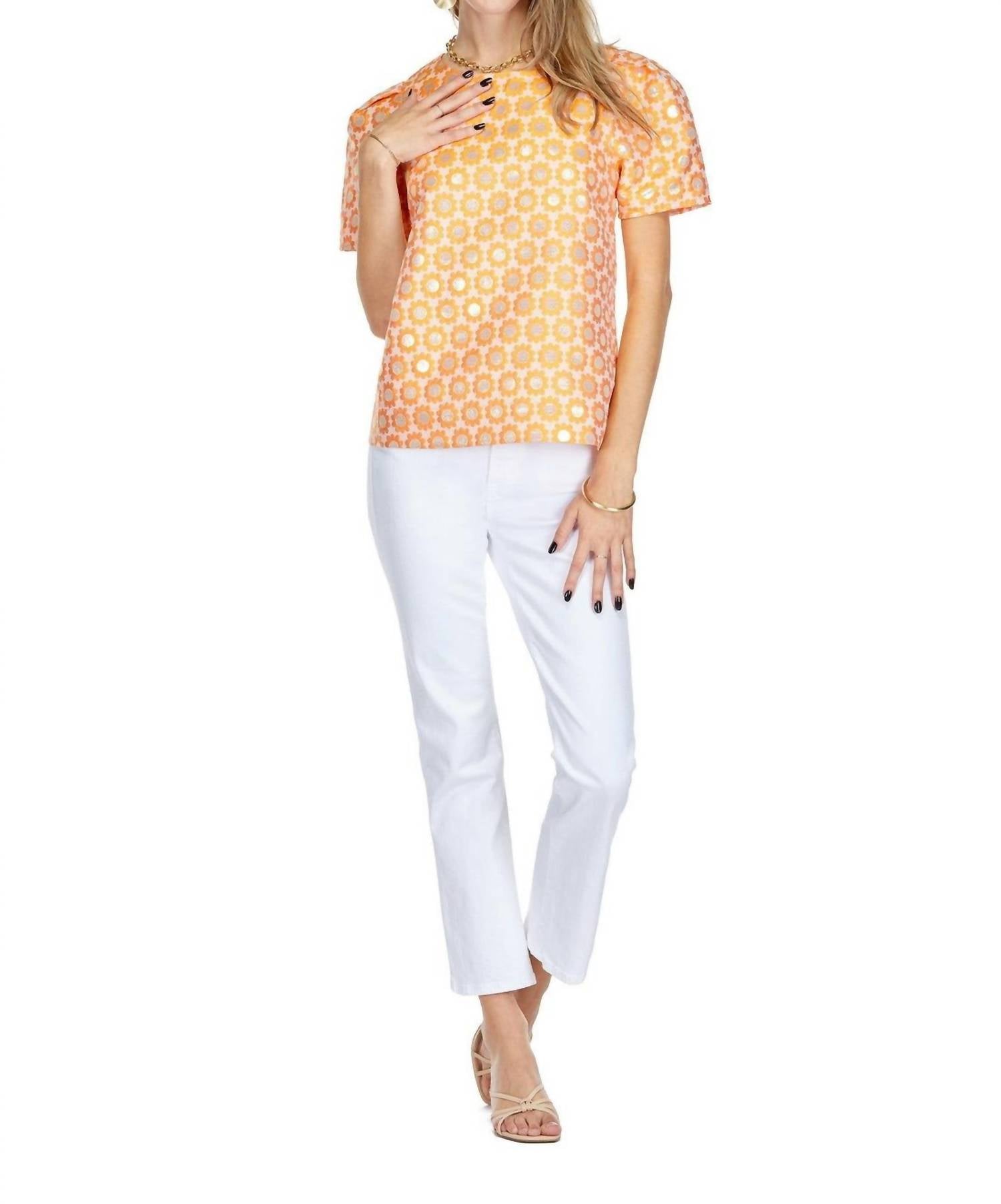 A set so cute you'll never want to take it off. Designed to look good while lounging, this little number is the perfect outfit for hanging at home in style. Introducing the Metallic Daisy Short Sleeve Top by Joy Joy, a vibrant addition to your wardrobe with its charming puff sleeves. This women's top in orange multi features a crew neck and a metallic daisy print that adds a playful touch to its A-line fit. It is designed to flatter all body types and is perfect for petite sizes. For best care, lay flat to dry.