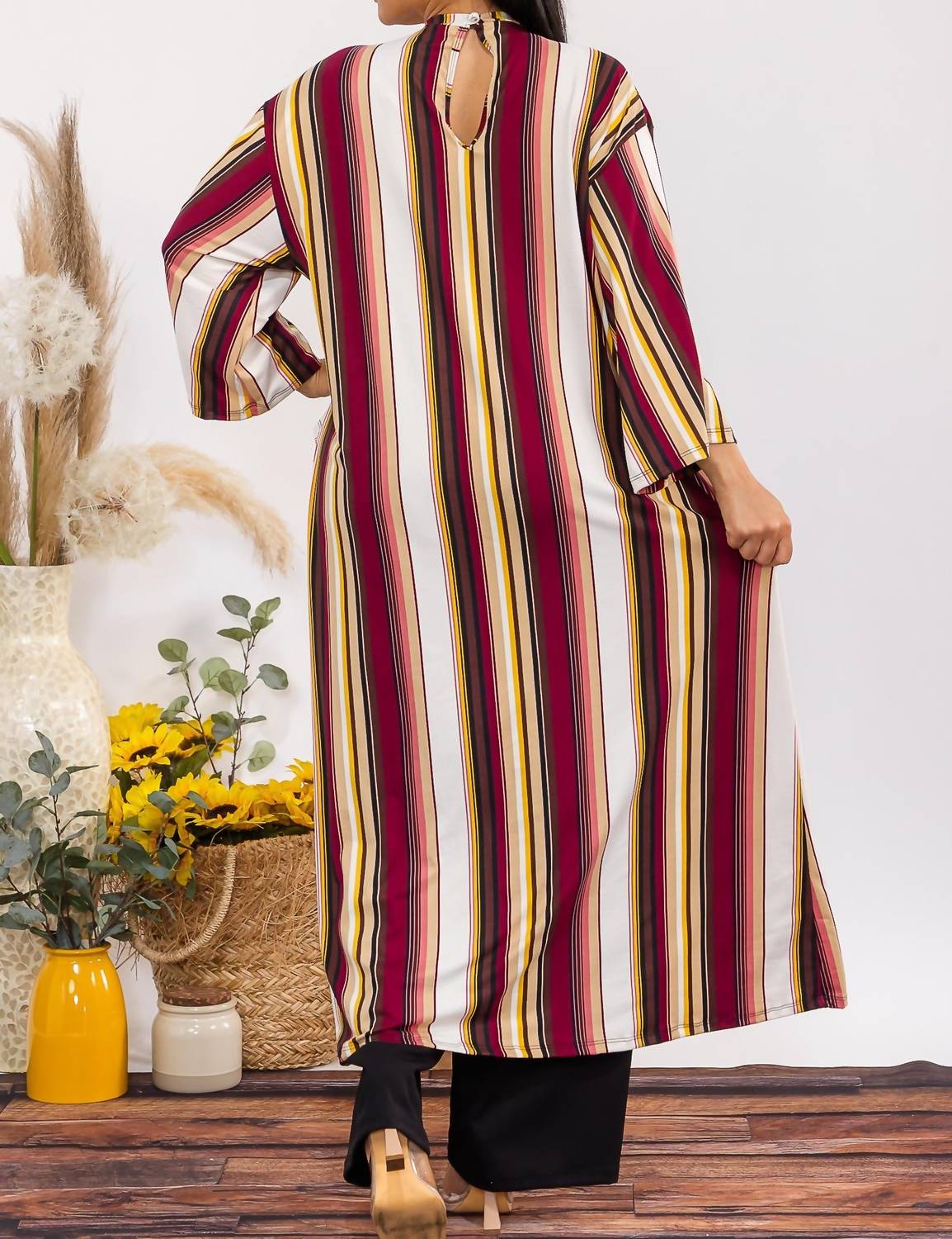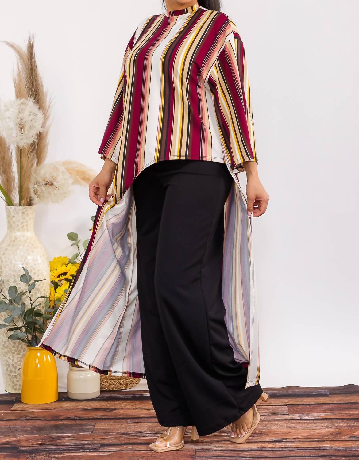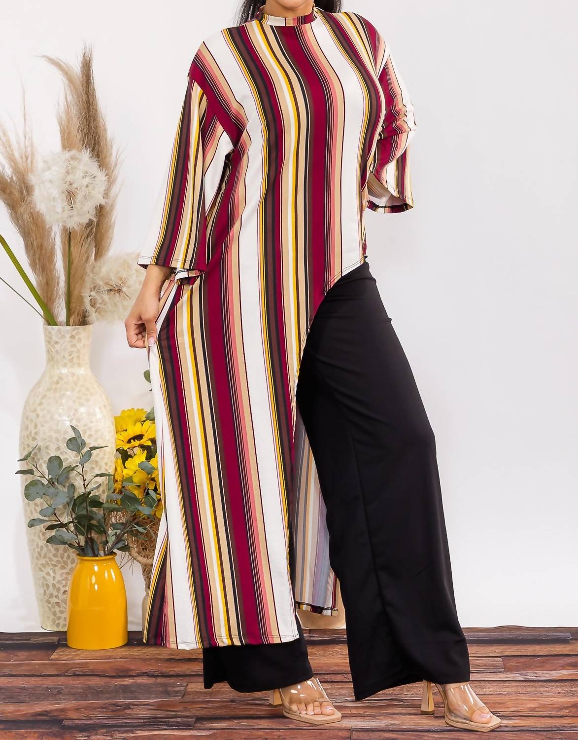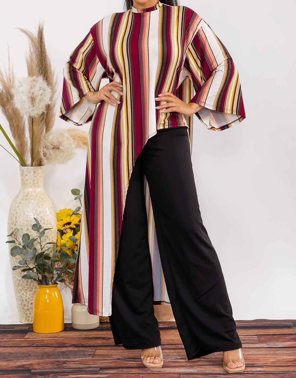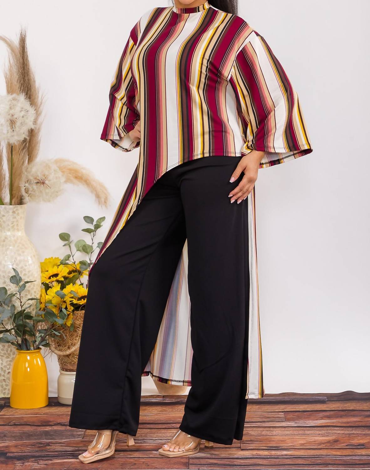 A set so cute you'll never want to take it off. Designed to look good while lounging, this little number is the perfect outfit for hanging at home in style. Introducing the Karen T Design Asymmetrical Top Two Piece Set, perfect for elevating your workwear to a new level of comfort and style. This multi brown striped ensemble features three-quarter bell sleeves and a chic high-neck tunic, paired with matching high-waist pants. Crafted from very soft and stretchy fabric, this set is designed for versatility and ease. Available in sizes M to 3X, making it an ideal choice for dinner parties or festive gatherings. Model is wearing a size Medium.