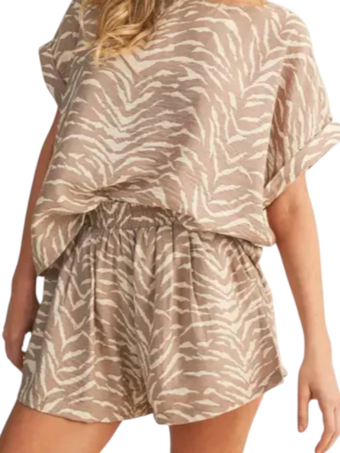Loungewear doesn't have to be frumpy and this is exactly what we had in mind. Designed for a comfortable fit, this chic little number will be your favorite lounging-at-home look. Elevate your loungewear game with the Anything Goes Zebra Print Short Set by Klesis, perfect for a chic yet relaxed summer style. This taupe animal print set includes a short sleeve, crewneck top paired with shorts featuring an elastic waistband for added comfort. Crafted from 80% Rayon and 20% Nylon, this ensemble showcases a relaxed fit ideal for dinner parties or casual outings. Embrace the preppy trend effortlessly with this standout piece in your wardrobe.