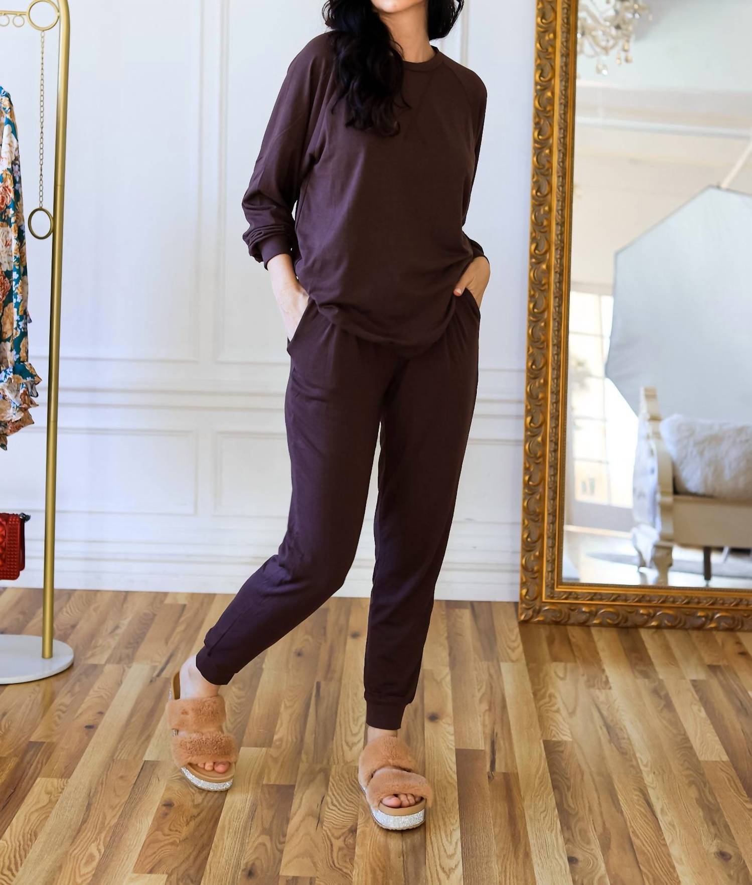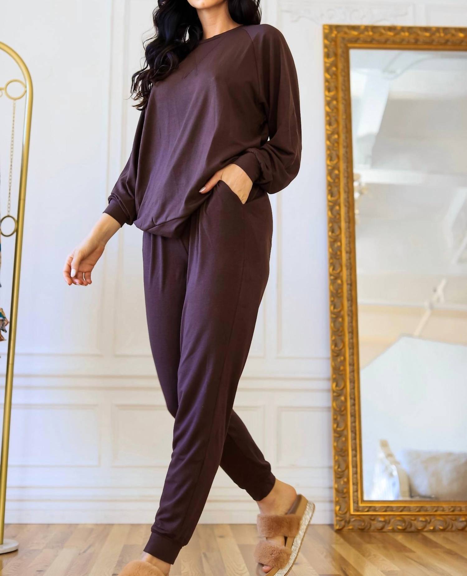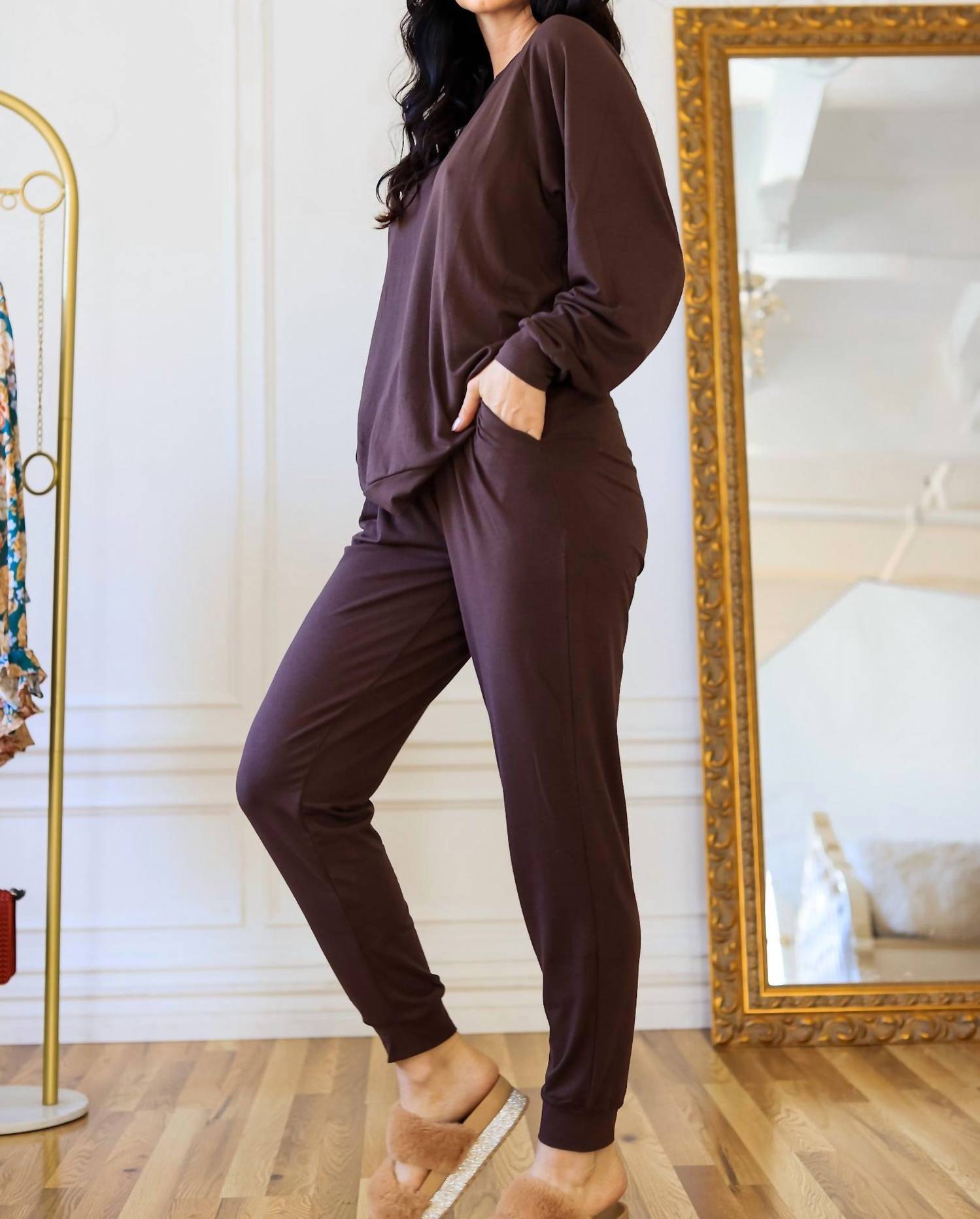A match made in heaven. This two-piece set is so cute, you'll wish you could wear it out of the house! Did we mention how comfortable it is, too? You may want two sets! Elevate your loungewear collection with the All Day Me Time Women’s Lounge Set by Little Secret Of Mine, offered in a rich cacao color perfect for a monochrome look. This women's set features long sleeves and a flattering high-waisted design, making it an essential for vacation or fall holidays like Thanksgiving. Designed with a solid pattern and a classic crewneck, this set delivers both style and comfort. While made for all-day wear, specific care instructions are not provided.