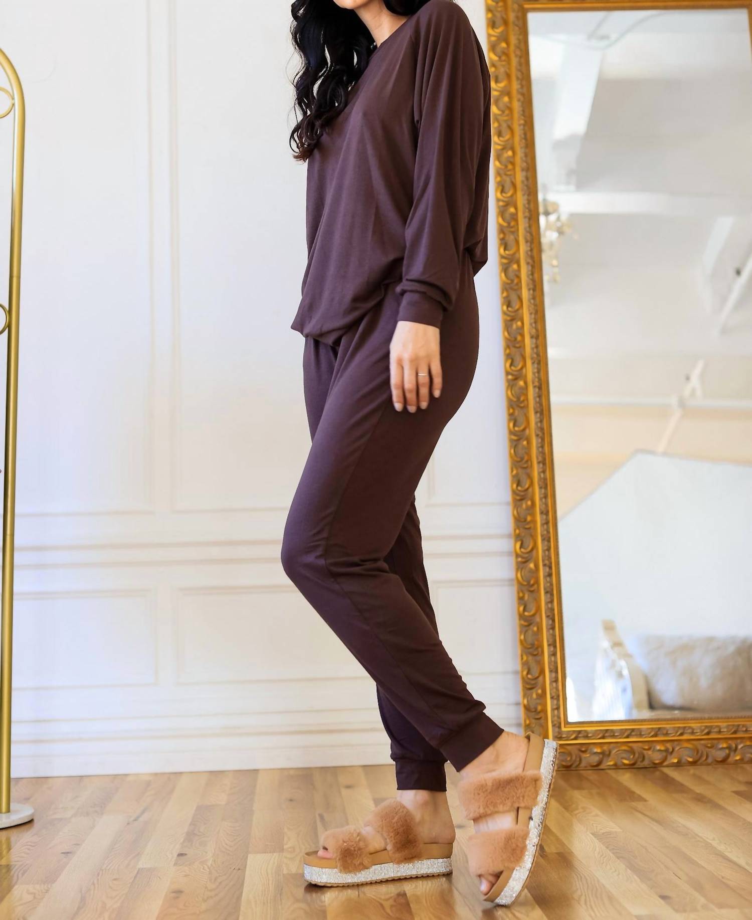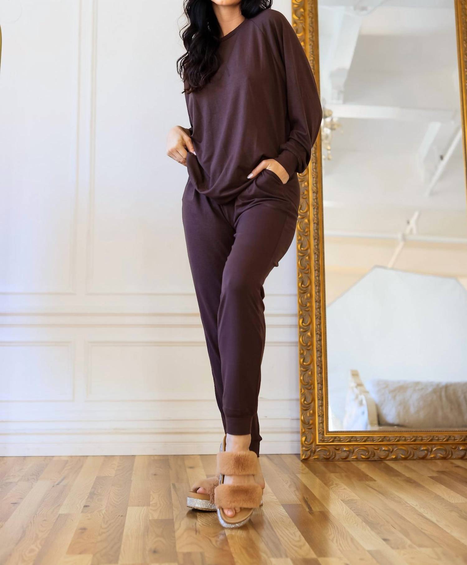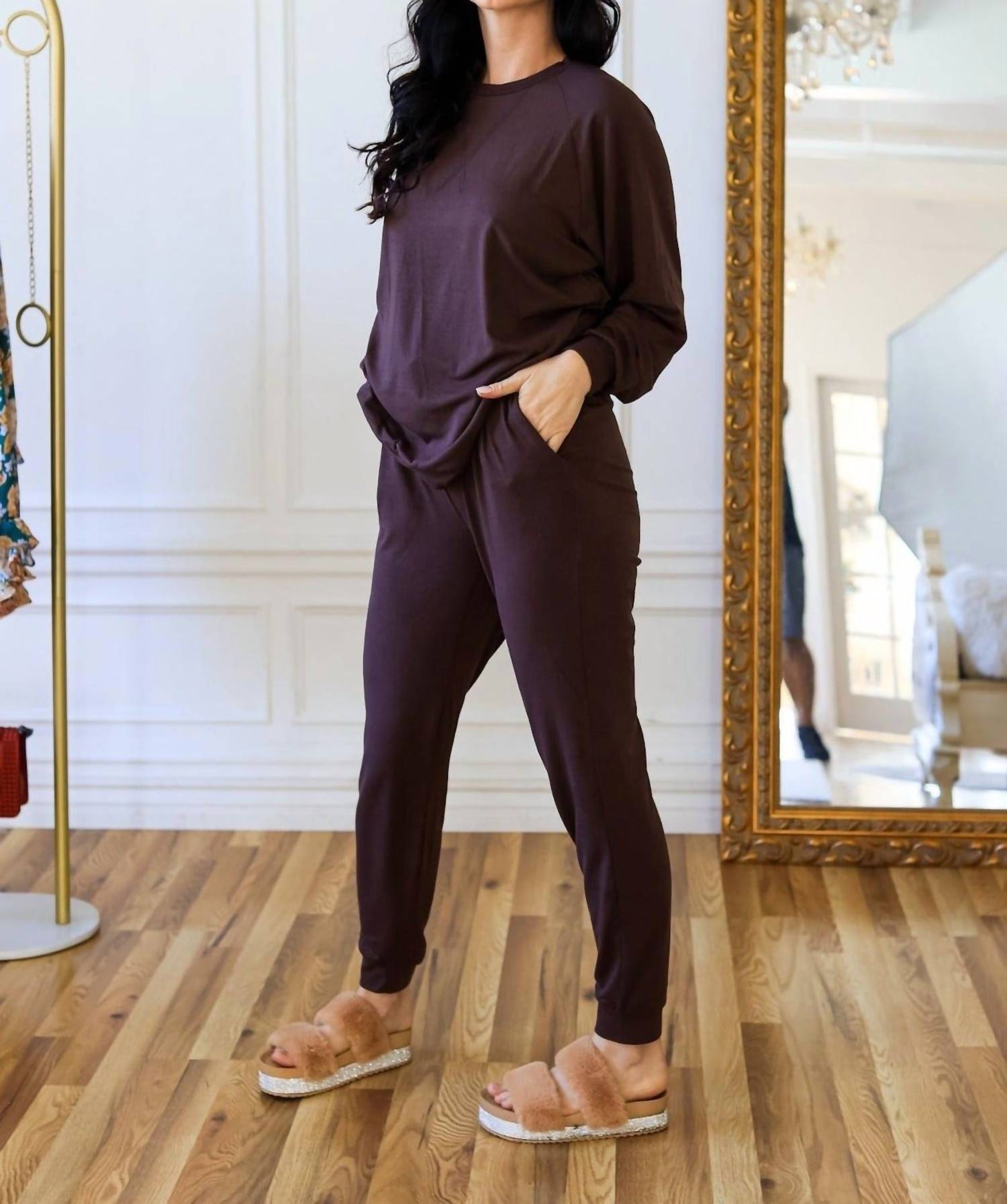 A match made in heaven. This two-piece set is so cute, you'll wish you could wear it out of the house! Did we mention how comfortable it is, too? You may want two sets! Elevate your loungewear collection with the All Day Me Time Women’s Lounge Set by Little Secret Of Mine, offered in a rich cacao color perfect for a monochrome look. This women's set features long sleeves and a flattering high-waisted design, making it an essential for vacation or fall holidays like Thanksgiving. Designed with a solid pattern and a classic crewneck, this set delivers both style and comfort. While made for all-day wear, specific care instructions are not provided.