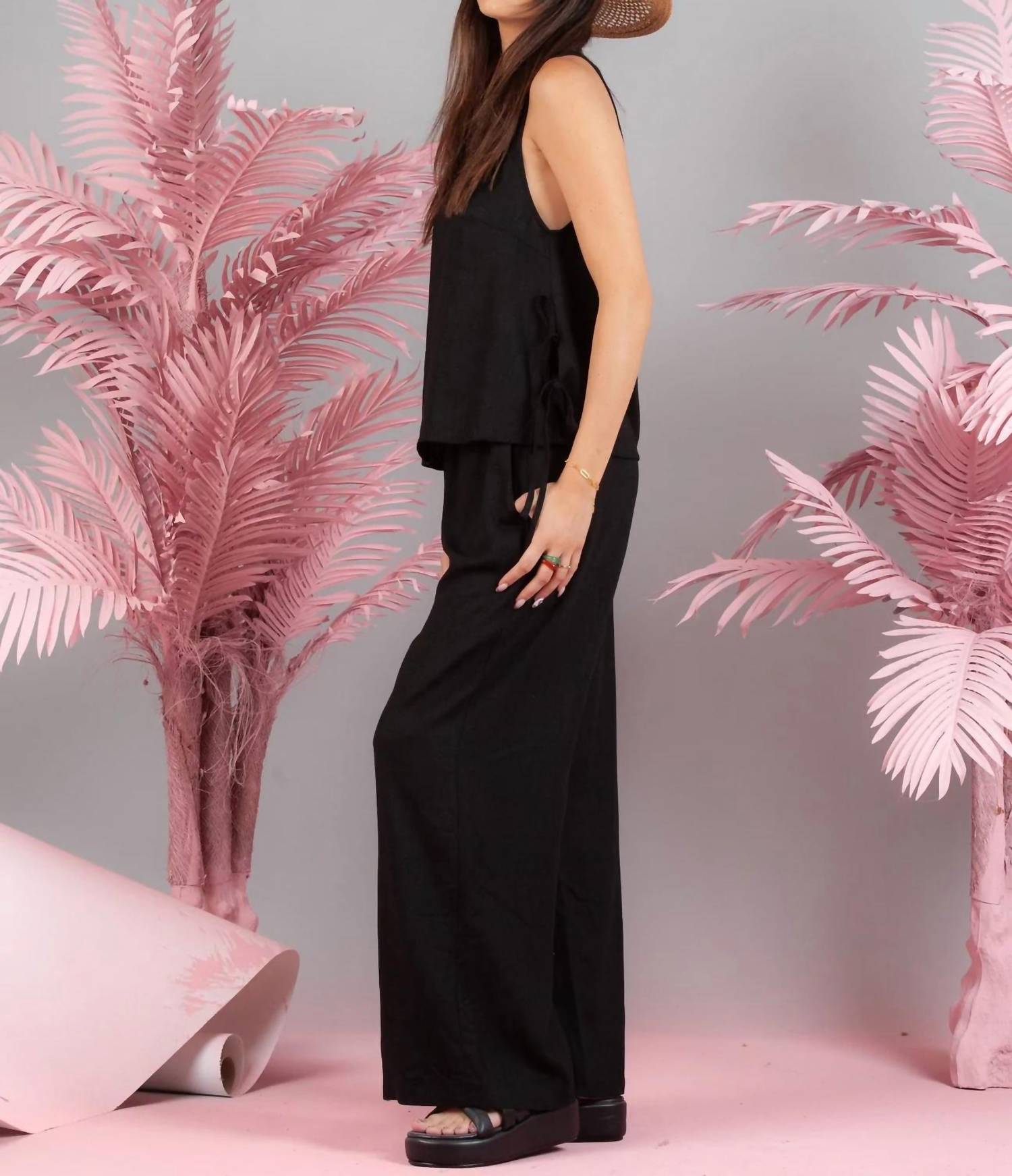 A set so cute you'll never want to take it off. Designed to look good while lounging, this little number is the perfect outfit for hanging at home in style. Introducing the Della Tank Top and Pant Set by LUCCA, a chic and comfortable choice for travel and vacations. This sleeveless ensemble in classic black boasts a loose tank top with side tie detailing and straight-leg pants featuring pockets and an elastic waistband. Composition: 70% Rayon, 30% Linen. Care: Machine wash. Ideal for a stylish, monochrome look during the spring season or Easter holiday.