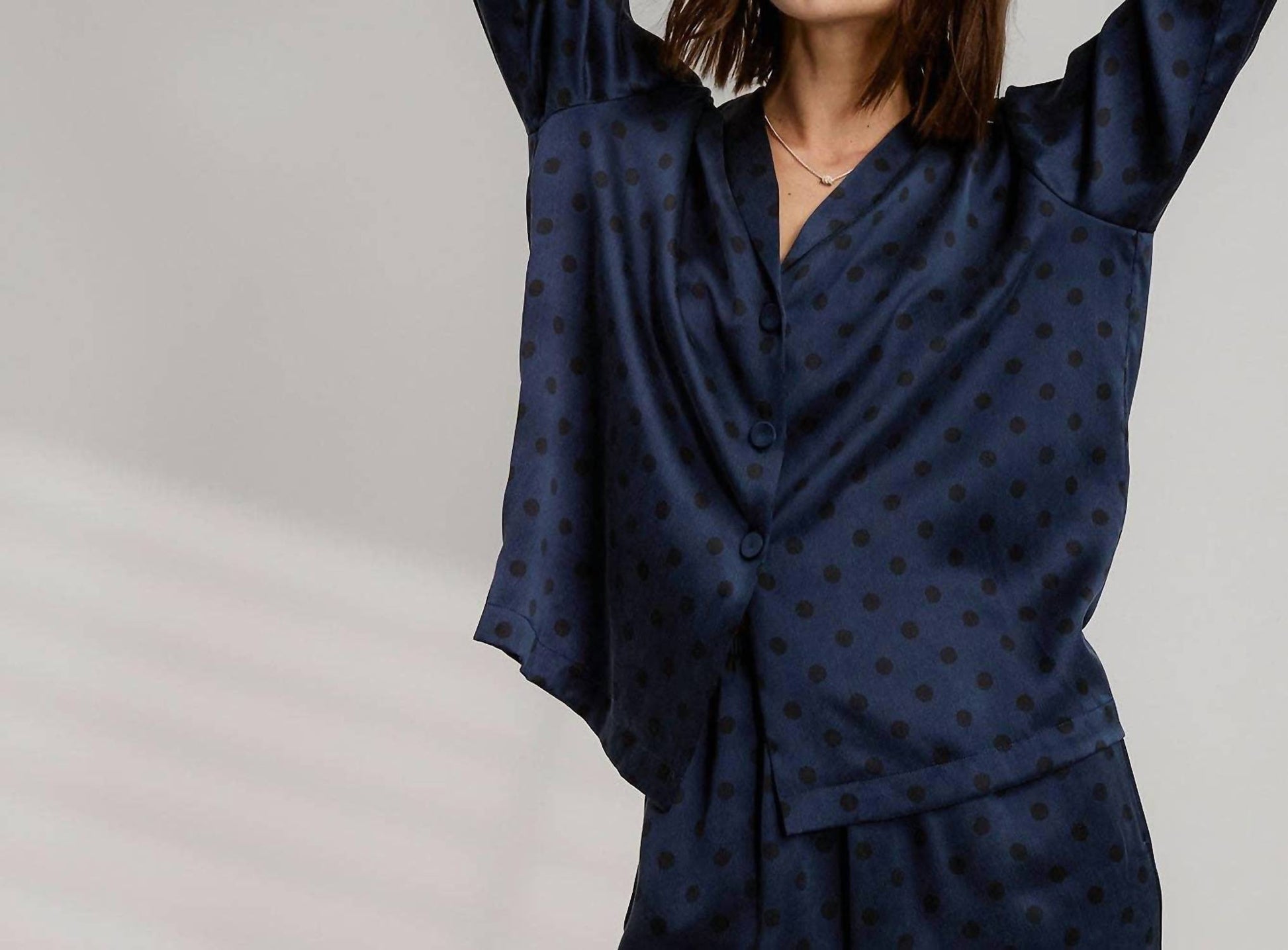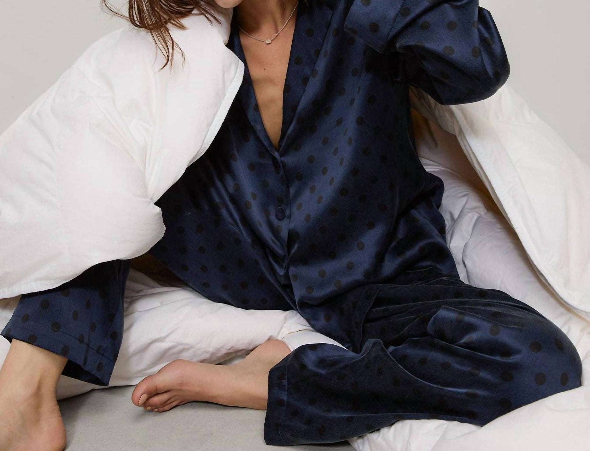 Loungewear doesn't have to be frumpy and this is exactly what we had in mind. Designed for a comfortable fit, this chic little number will be your favorite lounging-at-home look. Elevate your loungewear collection with the Washable Silk Long Sleeve Pants Set by Lunya, designed in a subtle Blue Ellipsis polka dot pattern. This women's set is crafted from 100% washable silk, offering a lightweight and naturally thermoregulating experience with a luxurious feel. It features polka dots for a trendy quiet luxury appeal, complete with a collar neckline and long sleeves, perfect for sophisticated relaxation during summer festivities. Care is simple with machine wash and line dry instructions, making it ideal for a laid-back holiday party look.
