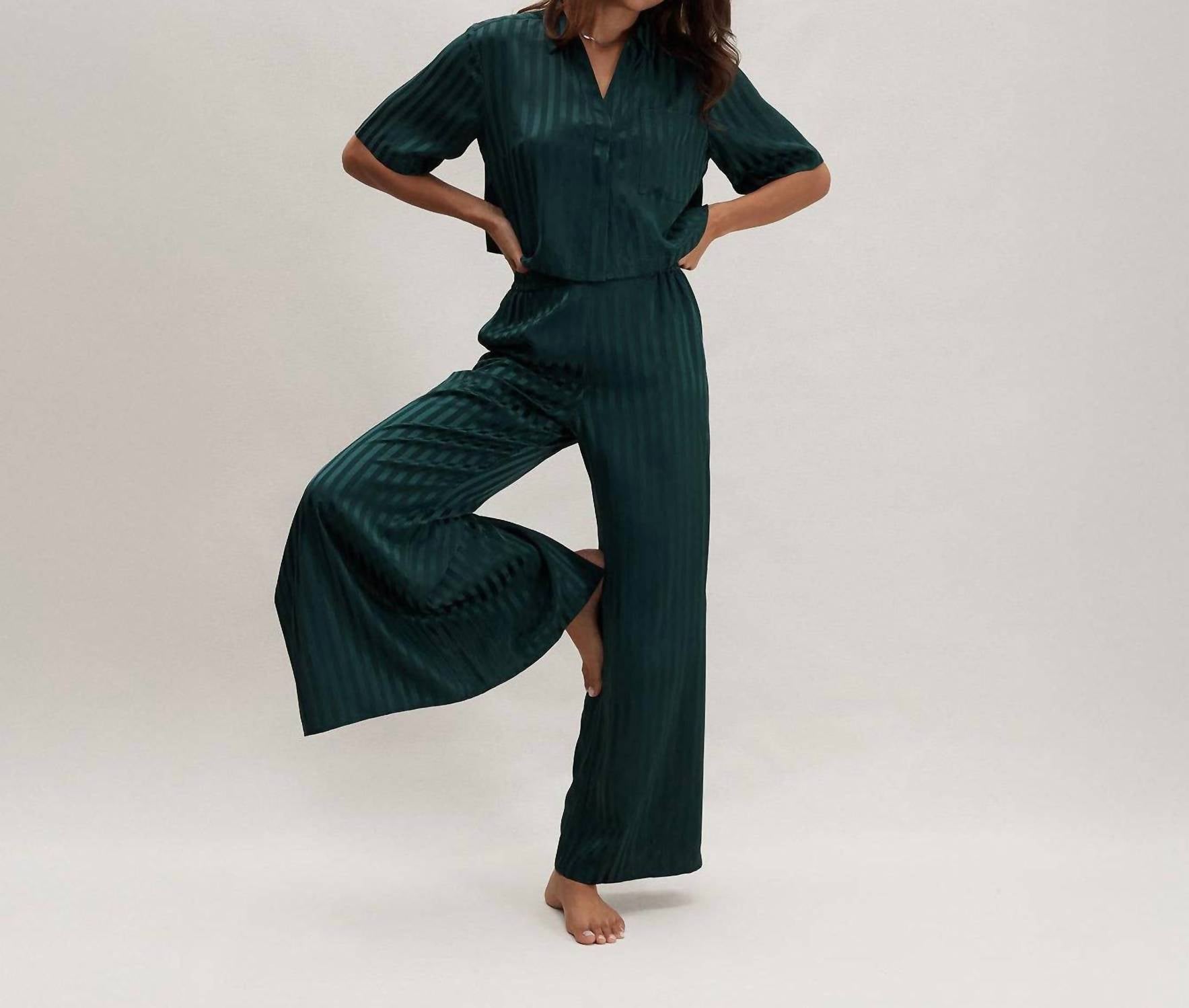 A match made in heaven. This two-piece set is so cute, you'll wish you could wear it out of the house! Did we mention how comfortable it is, too? You may want two sets! Introducing the Washable Silk Striped Jacquard High Rise Pants Set by Lunya—a statement in Quiet Luxury with Dusky Cypress Jacquard undertones. This women's loungewear set features a short-sleeve, collared, cropped button-down paired with high-rise pants. Crafted from 100% Mulberry Washable Silk, it includes an elasticized waistband, pant side slits, and discreet pockets, ensuring comfort and style for any vacation occasion. Care: Machine wash, line dry.