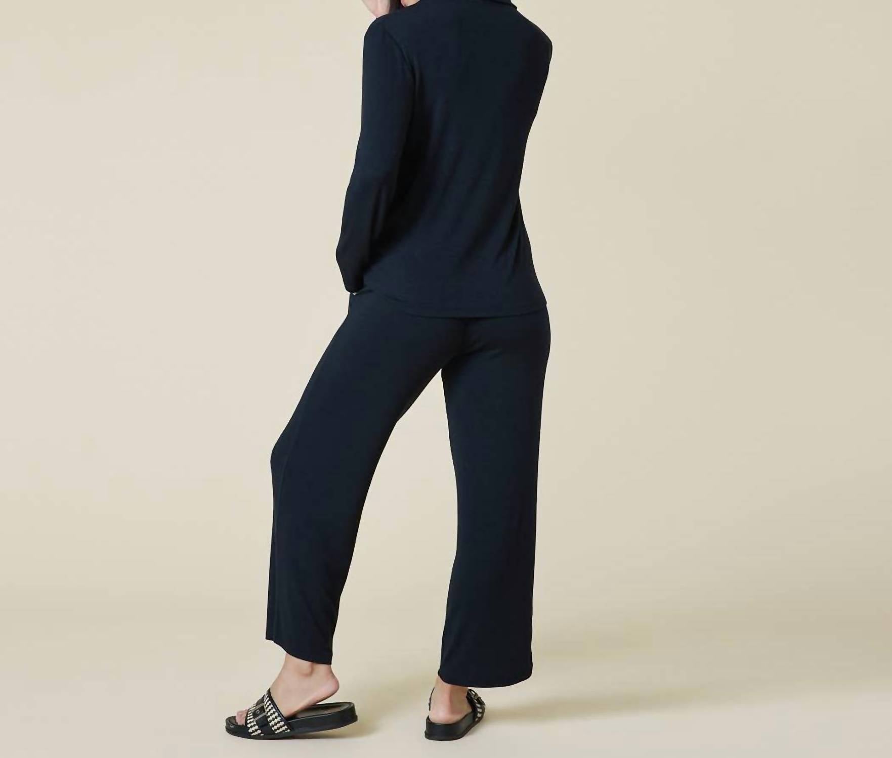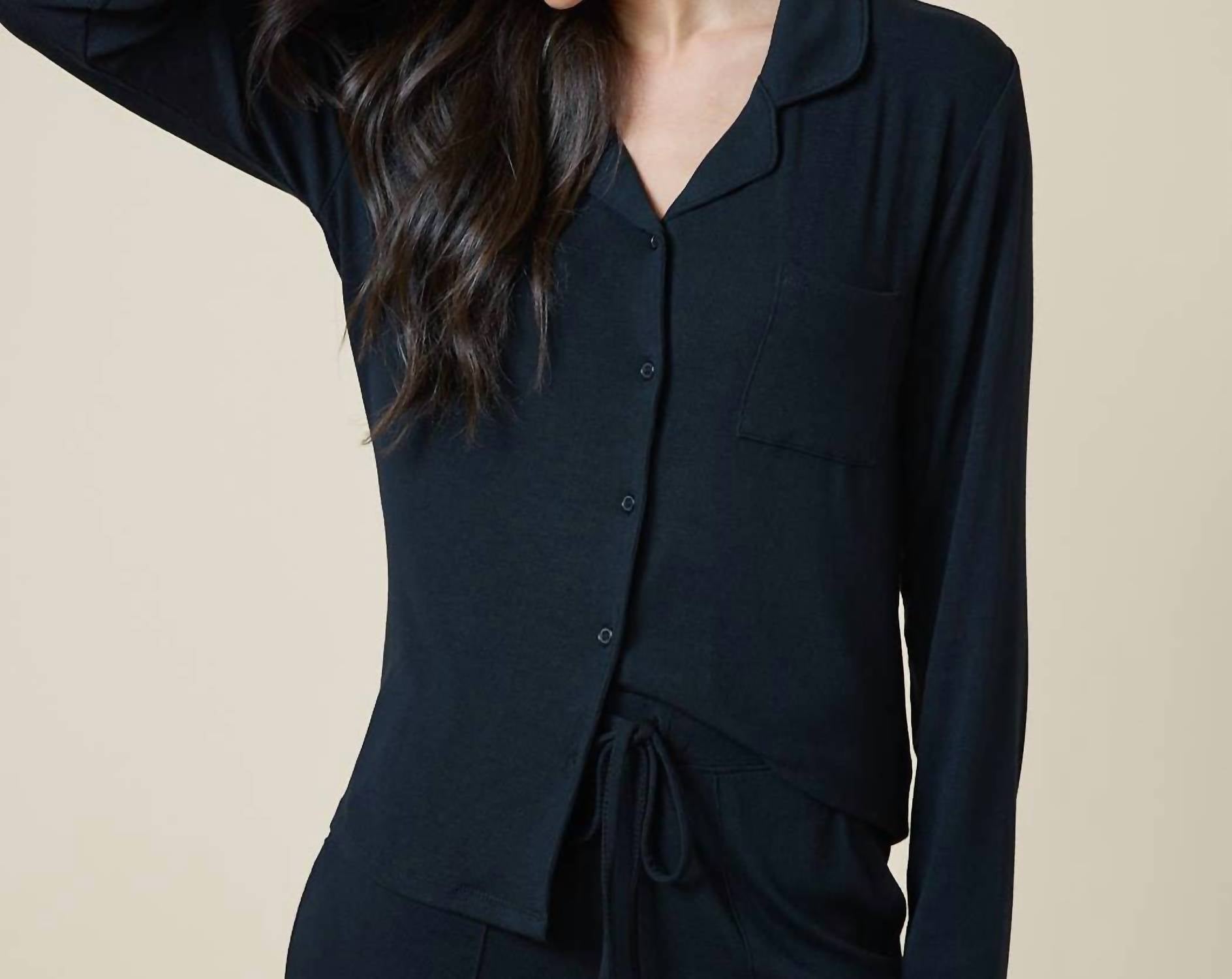 Experience ultimate comfort with the Sleep Soft Collar Pajama Set for Women by SOFTiES, featuring long sleeves and a classic notch collar design. Made from luxurious fine-ribbed knit material, this PJ set provides a soft and smooth feel in a minimalist solid black pattern. Ideal for a restful night's sleep, it includes practical features like a drawstring waist and side pockets. Care instructions recommend machine washing, and tumble drying for easy maintenance, making it perfect for cozy holiday lounging or a fall vacation.