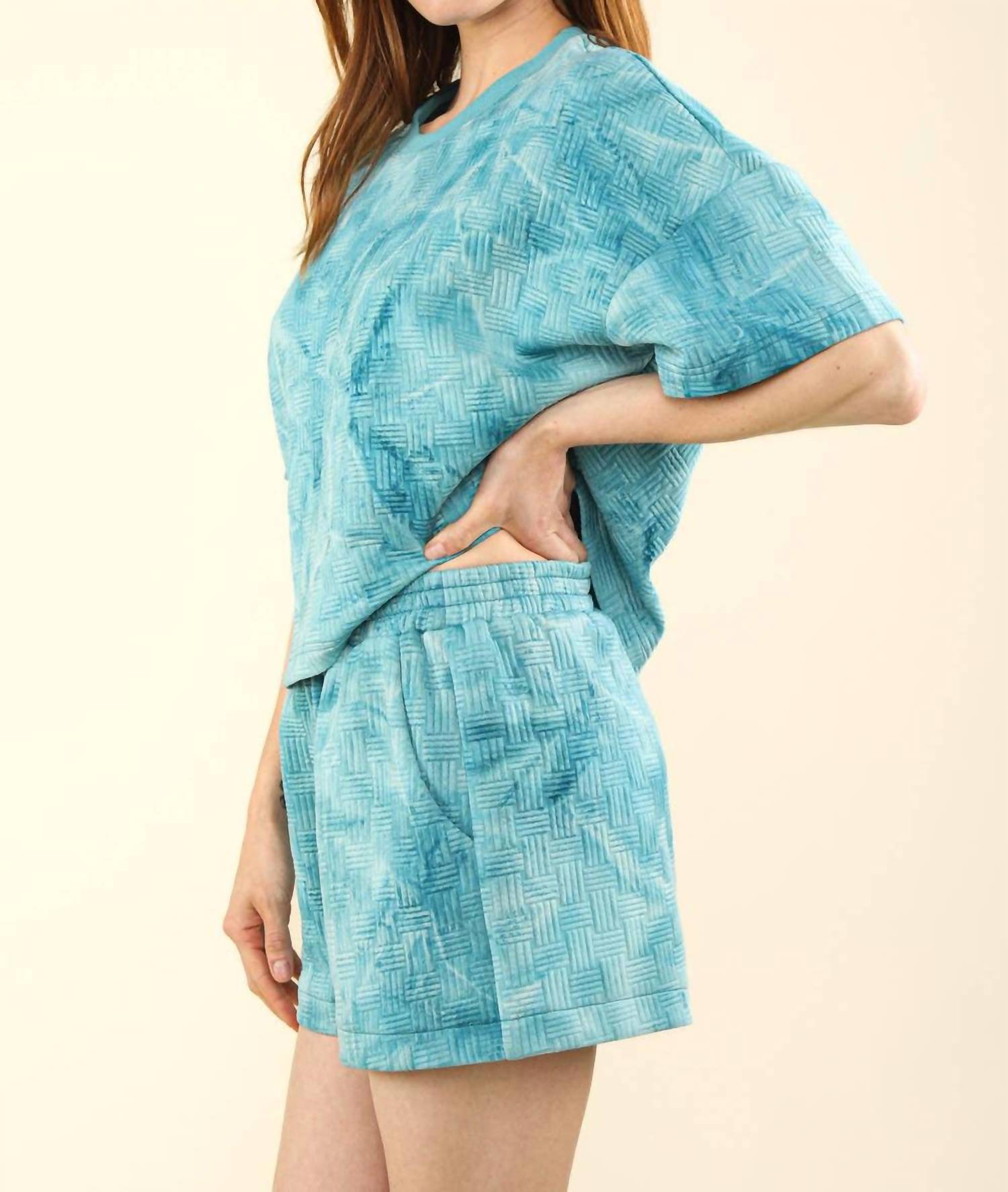 Loungewear doesn't have to be frumpy and this is exactly what we had in mind. Designed for a comfortable fit, this chic little number will be your favorite lounging-at-home look. Elevate your lounge game with the Quilted Top & Shorts Set by VERY J, crafted in a chic teal hue. The top features a comfy crewneck and short sleeves, making it ideal for those laid-back summer days. The shorts are designed with a high waist and elastic waistband, enhanced by side pockets for added convenience. Model is 5'7" and is wearing a size Small.