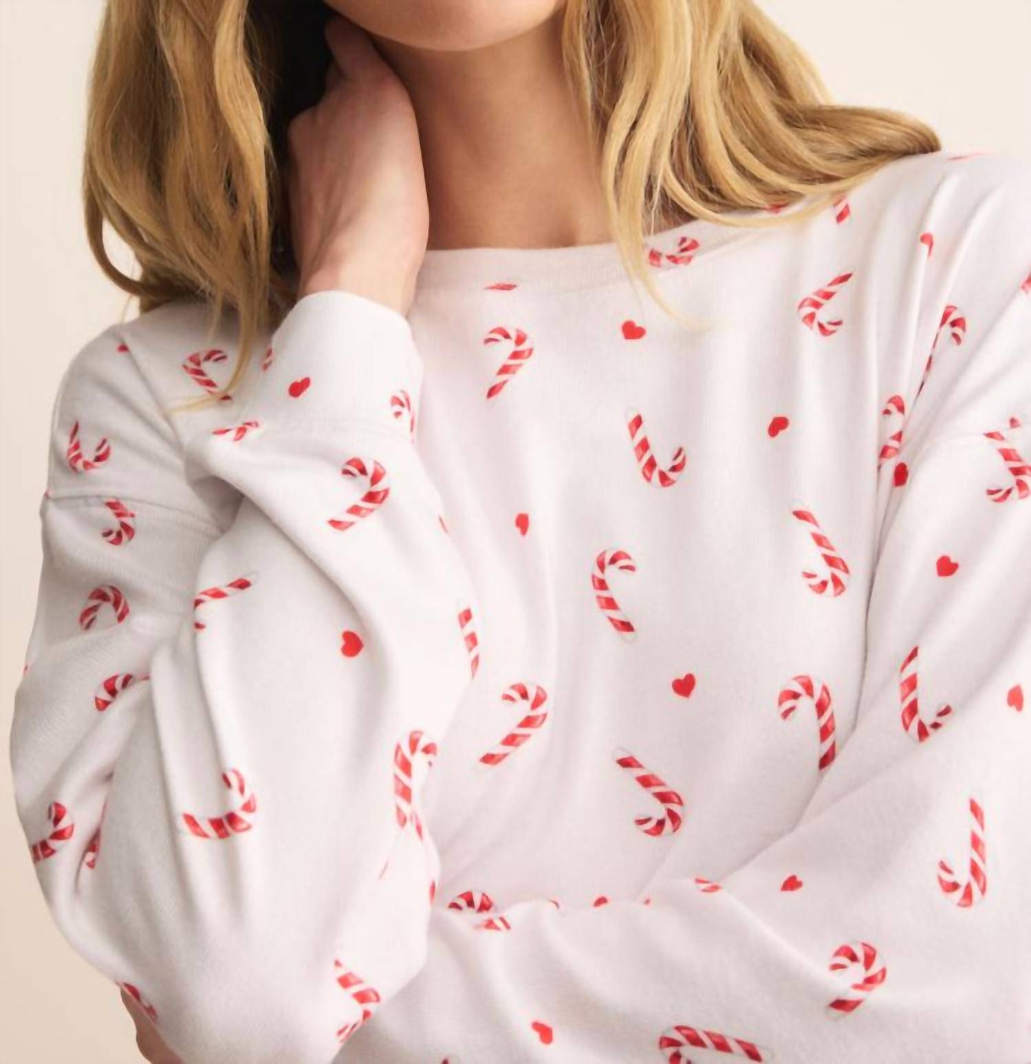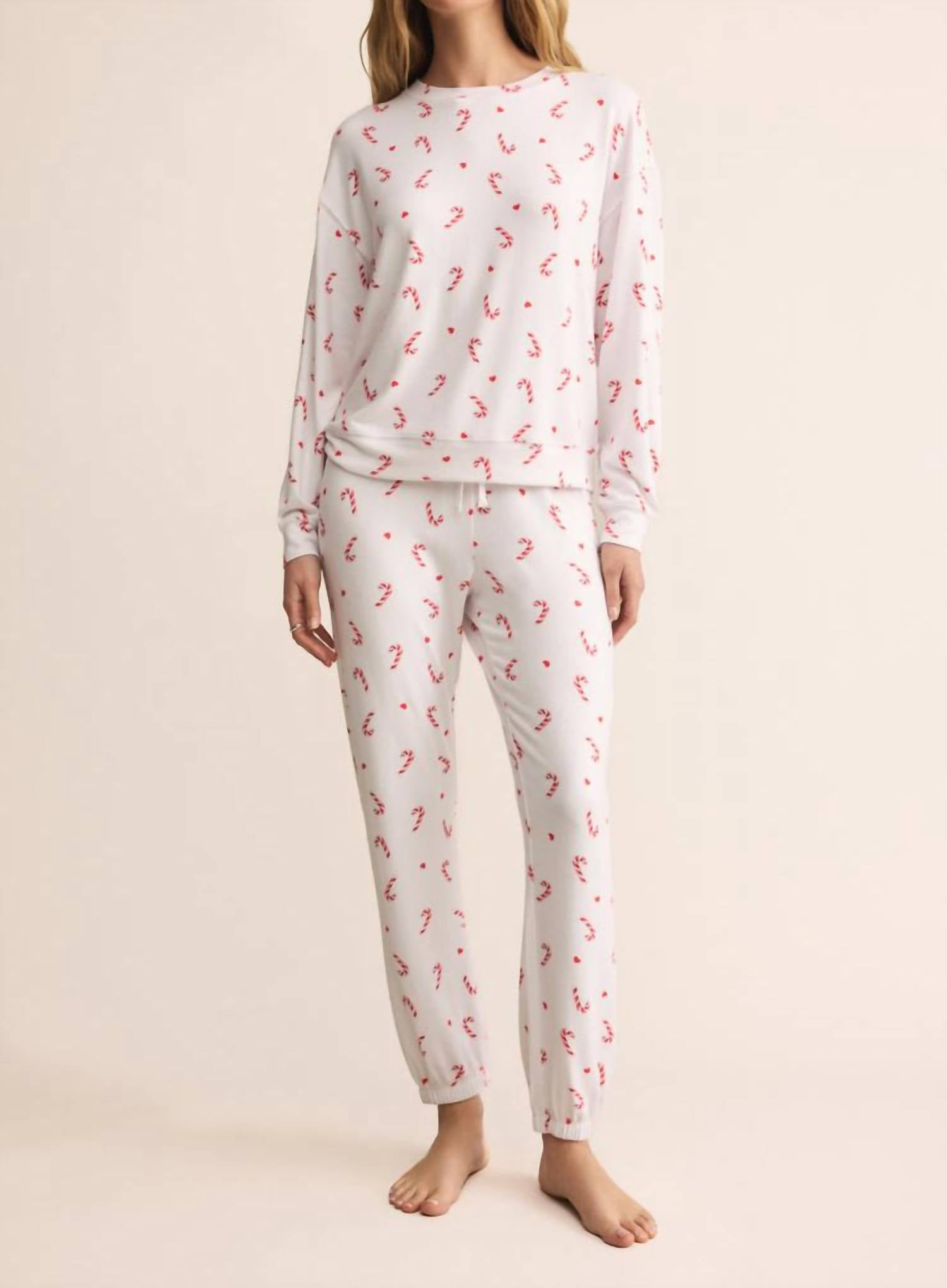 Works well with naps, zoom calls and binging your favorite series. Stay snug and stylish with the Cozy Candy Cane Set from Z Supply, a must-have for your winter wardrobe. This charming pajama set features a playful candy cane print, ensuring you're festive and comfortable. Crafted in a relaxed fit from silky jersey comprising 95% Polyester and 5% Spandex, it includes a long sleeve crew neck top and high-rise jogger with an ankle-length drawcord waistband. Care: Machine wash cold on a gentle cycle, then either tumble dry low or lay flat to dry.