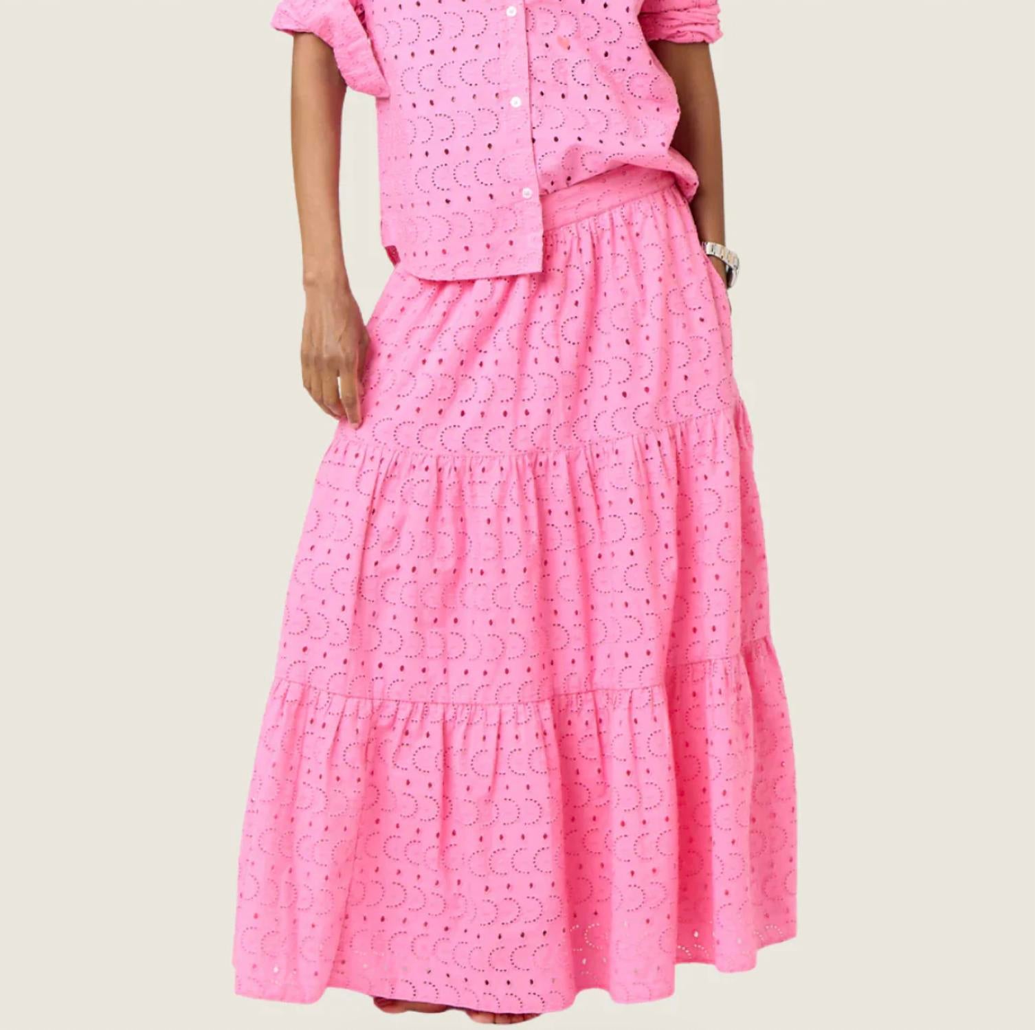 Who doesn't love a good maxi skirt? The Gabrielle Eyelet Skirt is crafted from soft, breathable cotton poplin, offering a comfortable and lightweight feel. Its design features delicate half-moon eyelets, adding a touch of intricate detail to the classic silhouette. With its versatile, airy construction, this skirt is perfect for adding a refined yet relaxed look to your wardrobe. 100% Cotton voile Eyelet pattern in half moon motif 3 tiered embroidered heart at center back in contrast color In seam pockets at side seam Lined Self waistband with encased back elastic
