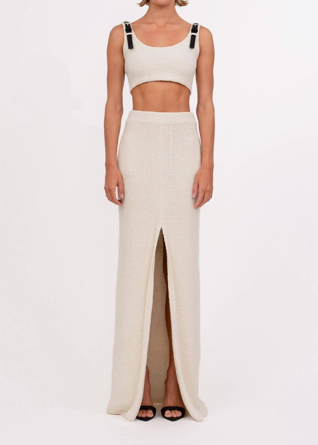 Who doesn't love a good maxi skirt? Introducing the Simone Maxi Skirt by Nonchalant Label, a chic addition to any wardrobe in elegant ivory. Crafted from a cotton-blend bouclé fabric, this solid pattern skirt embodies minimalist style and versatility. Designed with a convenient pull-on closure, it features a stylish front slit that can be elegantly repositioned. Perfect for summer dinner parties, elevate your look by pairing it with any top or the matching Otto Crop.