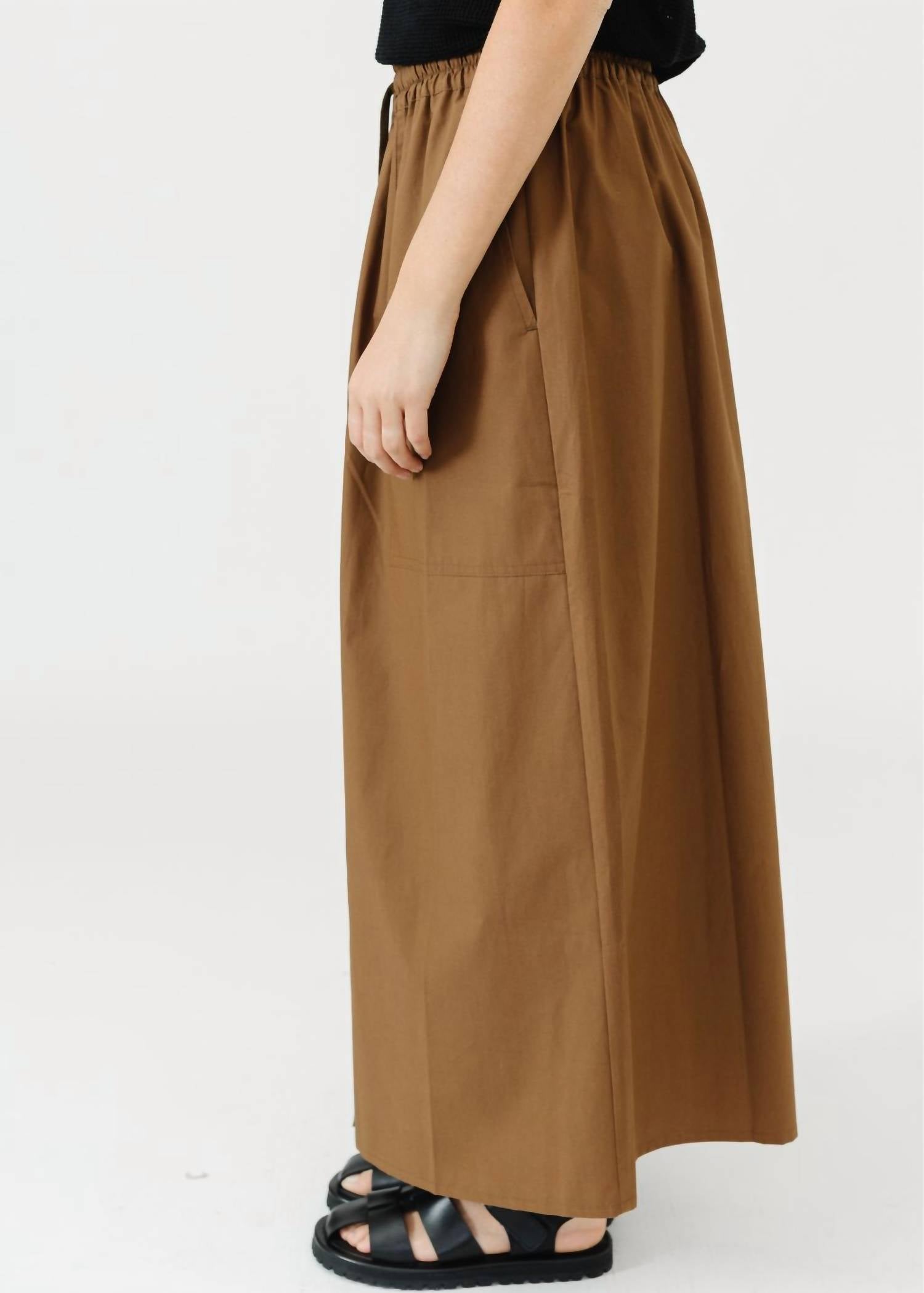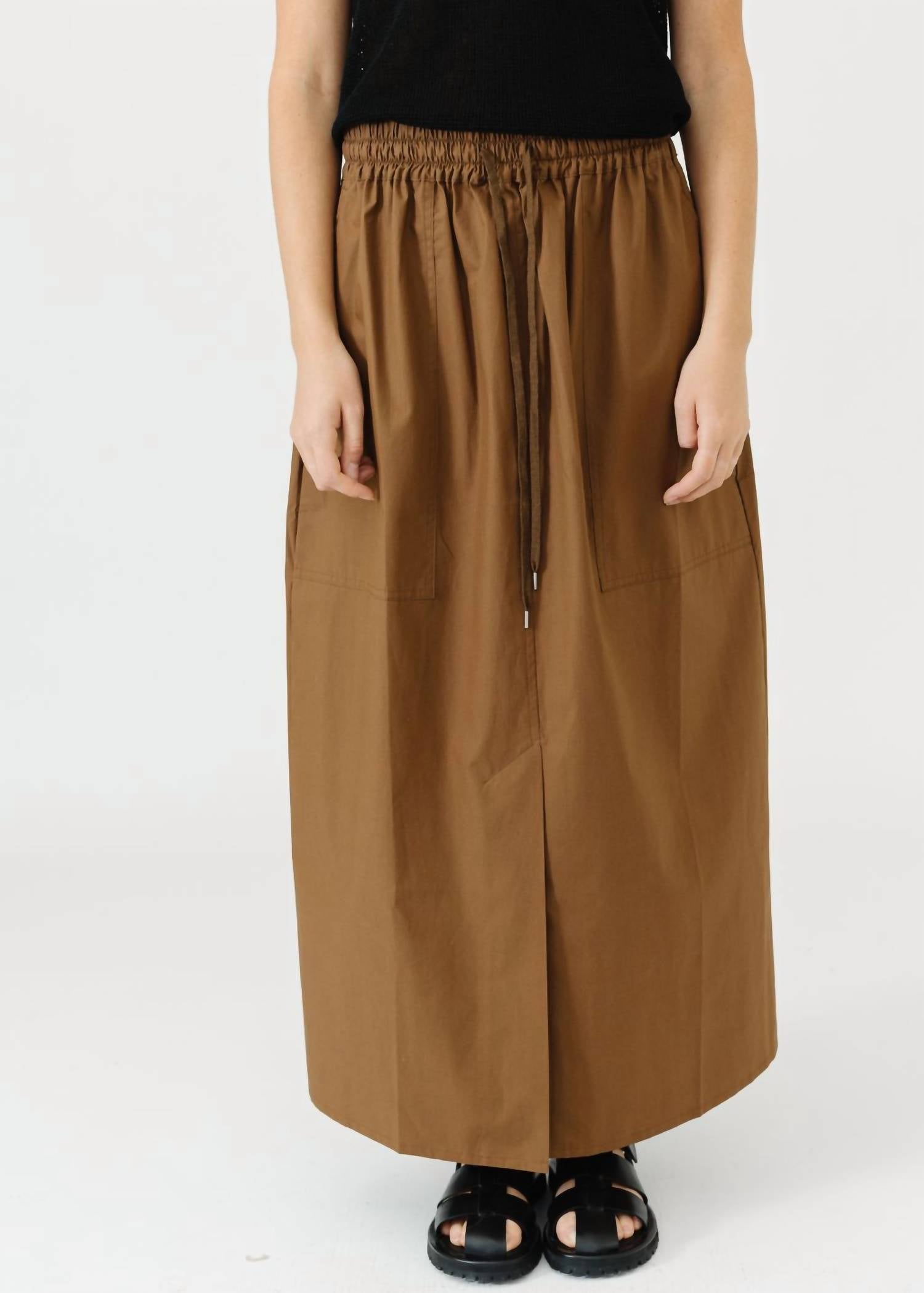 Tuck in your favorite tee for a more casual yet feminine look. Introducing the Oates Maxi Skirt by Studio Nicholson, a quintessential piece in a stylish Almond hue. With its elasticated waist and front vent closure, this skirt offers the perfect blend of comfort and elegance. Crafted from 100% cotton, it features Italian patch pockets, delivering a touch of workwear influence to your wardrobe. Care: Delicate wash cold, cool iron. Perfect for a spring dinner party, this skirt embodies maximalist style with its unique noisy cotton fabric.
