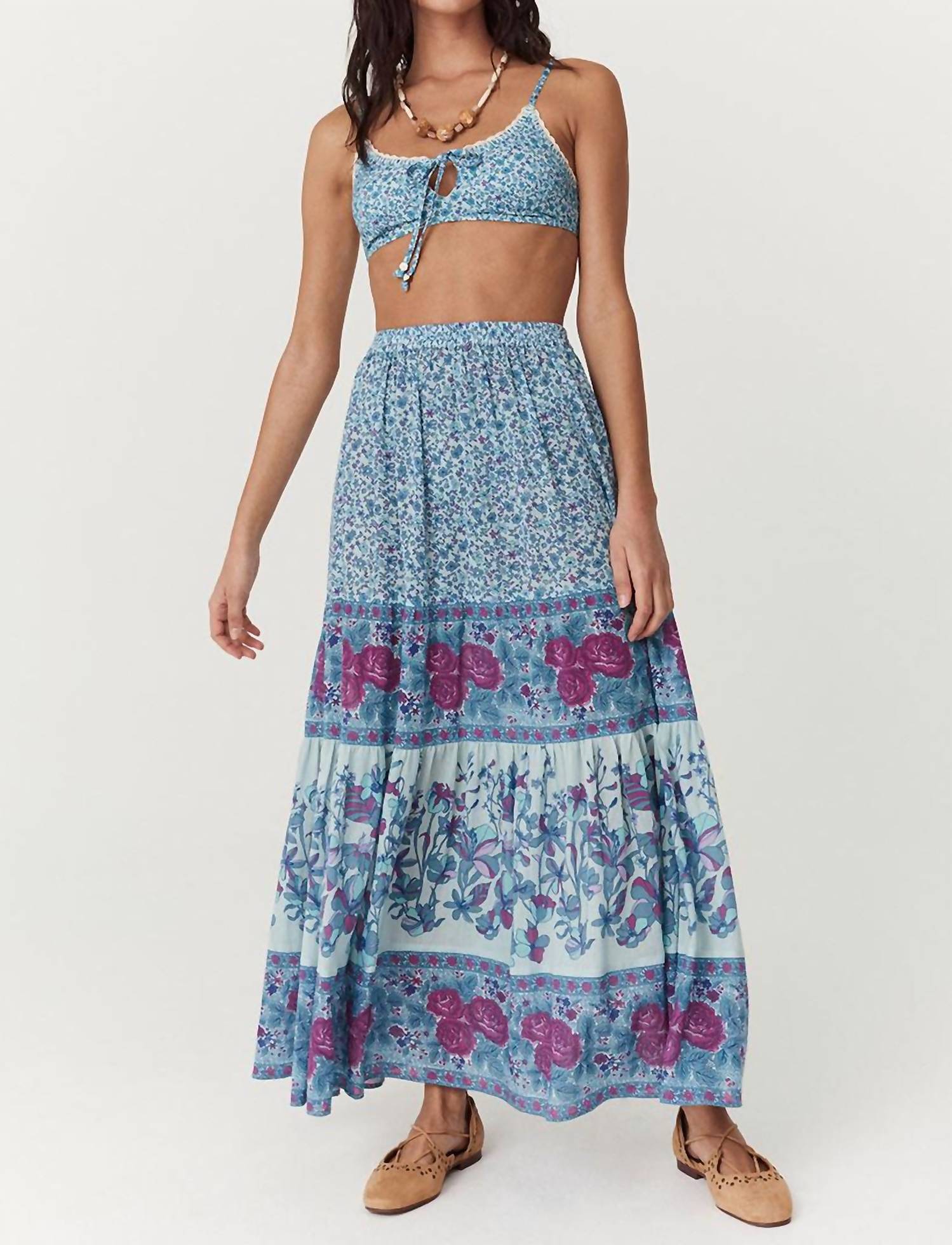 Who doesn't love a good maxi skirt? Elevate your boho-chic style with the Love Jetty Maxi Skirt by SPELL in a serene Nirvana hue. This women's skirt is made from 100% organic cotton crepe for a flowy and breathable fit, featuring a floral pattern and an elastic waist that ensures ease and comfort. With a convenient pull-on closure, it embodies femininity for vacation vibes or a relaxed summer holiday. Care instructions suggest machine washing in cold with mild detergent, line drying in shade, and cool ironing while damp.
