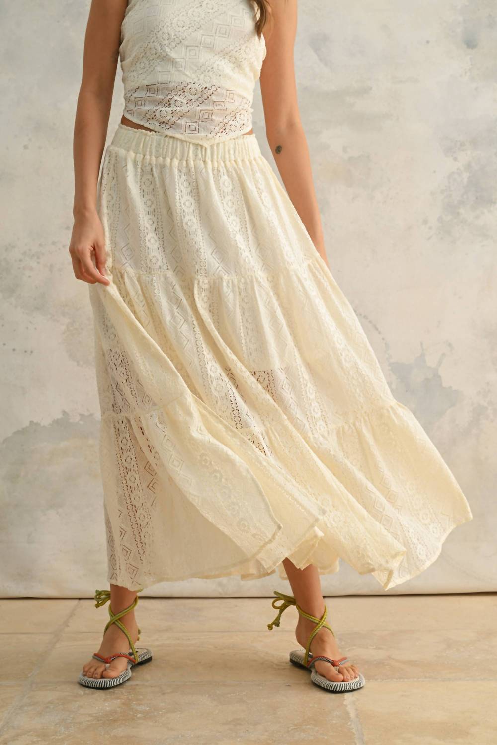 Who doesn't love a good maxi skirt? Elevate your wardrobe with the Flowy Breeze Maxi Skirt by MIOU MUSE, a cream treasure that's perfect for any summer occasion. Crafted from a luxurious cotton blend featuring 65% cotton and 35% nylon with a 100% polyester lining, this skirt exudes a boho chic vibe. Its textured, tiered crochet fabric showcases an elegant flow and ensures a standout appearance whether dressed up or down. Designed with a convenient pull-on closure, this maxi skirt is an effortless choice for a stylish beach day or a special outing.
