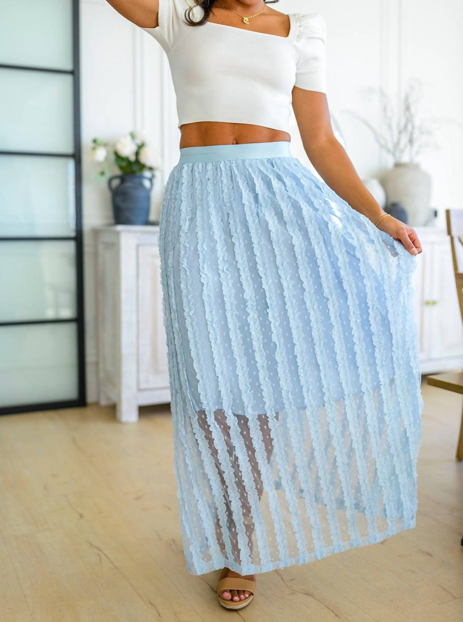 This maxi-length A-line skirt. It features a high-waisted fit, an elastic waistband, and a ruffled Swiss dot mesh overlay. Made with a 100% polyester overlay and 100% rayon lining, it is true to size with a non-stretch lining. Measurements: S: Waist 23" Length 40". M: Waist 25" Length 40". L: Waist 27" Length 40". 1XL: Waist 31" Length 40". 2XL: Waist 33" Length 40". 3XL: Waist 35" Length 40". Waistband Stretches ~2". Model Maddy is wearing size S. Model Jordan is wearing size 1XL.