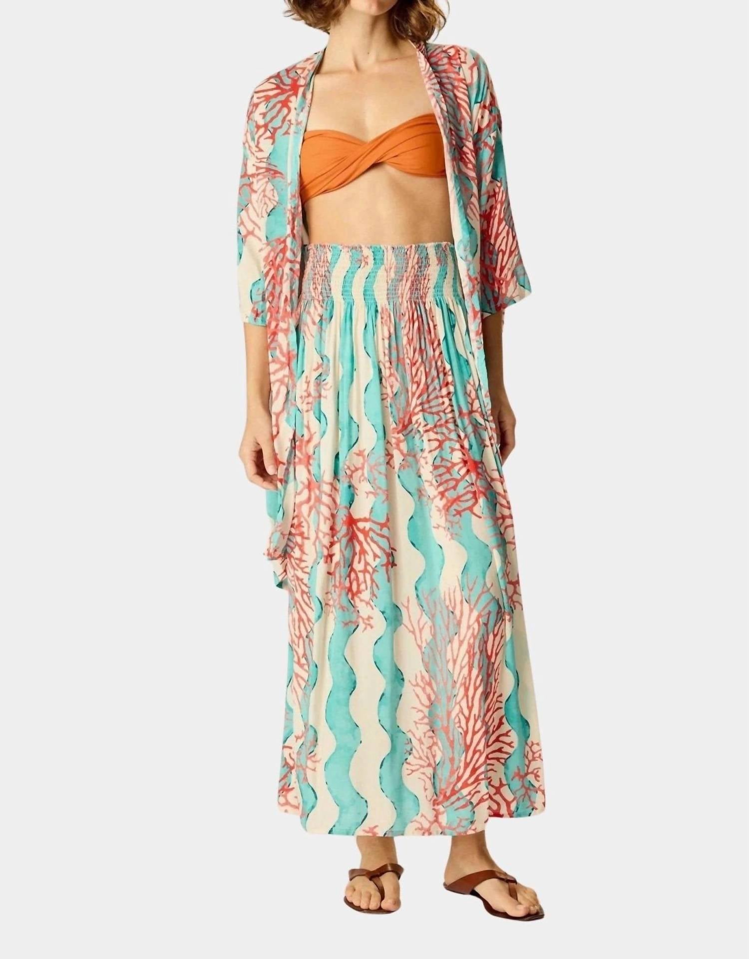 Who doesn't love a good maxi skirt? Experience the captivating charm of the Bella Maxi Skirt by Natalie Martin in Coral Wave Turquoise. This beautifully patterned maxi skirt, made from 100% Rayon, showcases a boho chic style perfect for summer gatherings and beach days. Hand-dyed and sewn in Bali, it features a pull-on closure with an elastic waist for a comfortable, one-size-fits-most silhouette. Care instructions include hand wash cold and lay flat to dry or dry clean to maintain its unique handmade appeal.