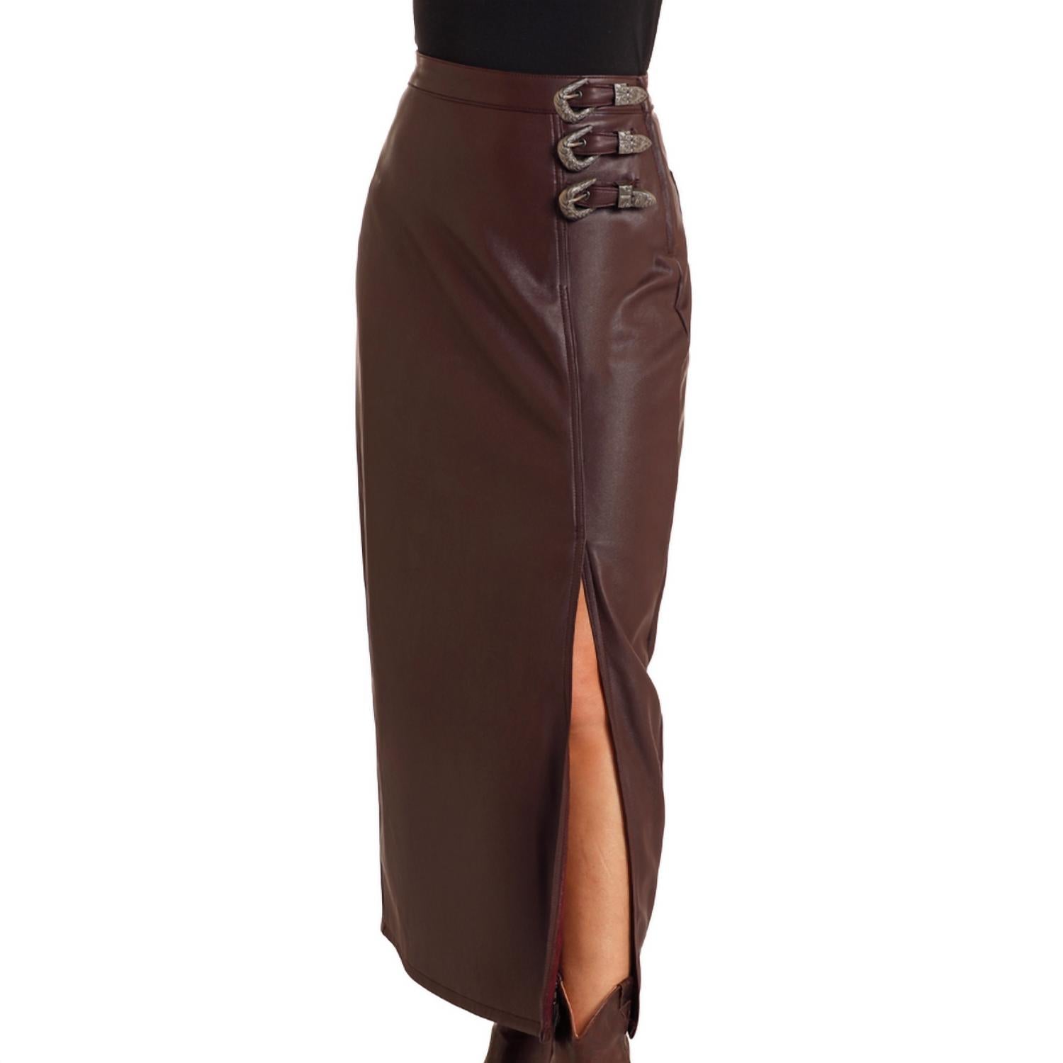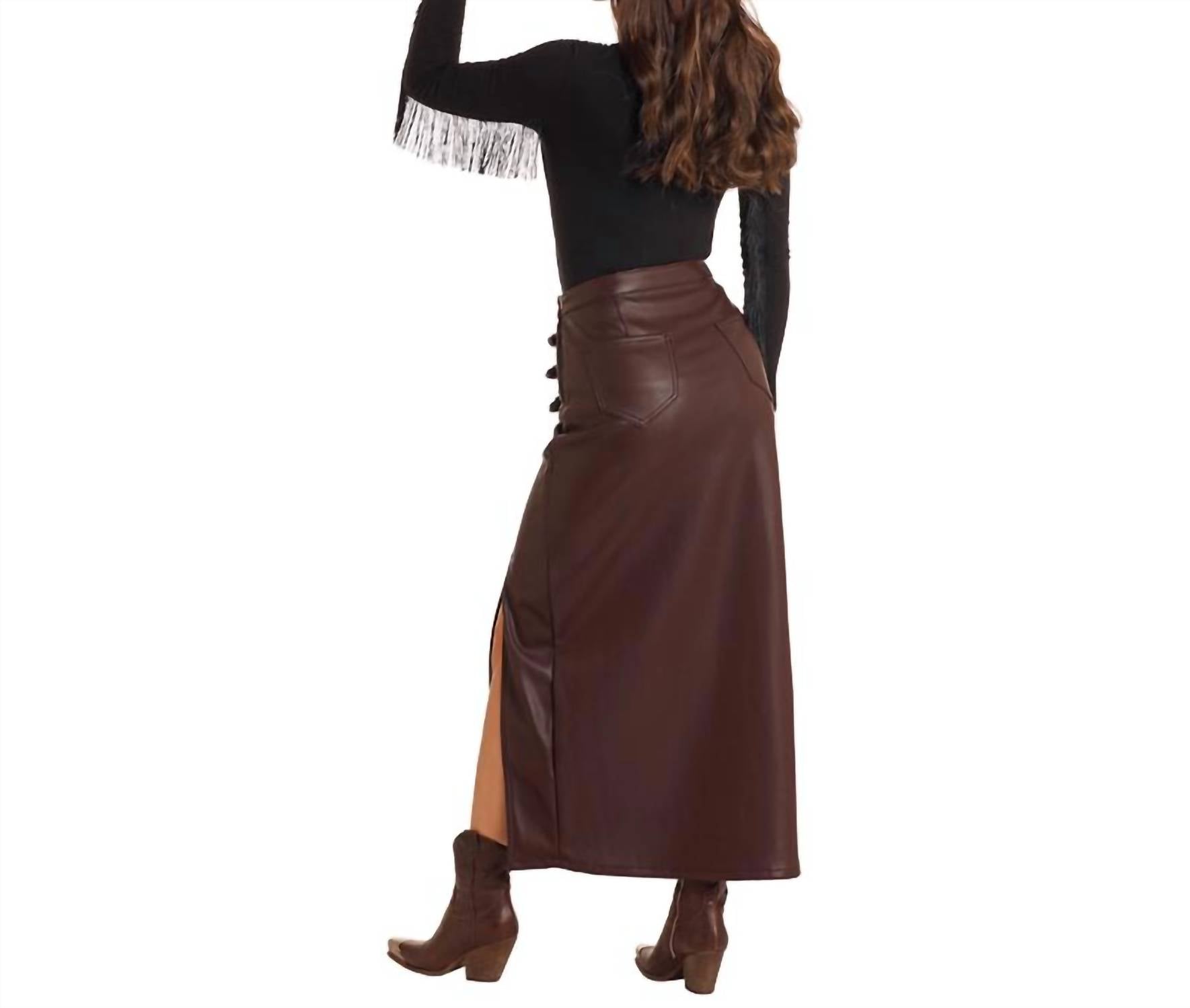 Tuck in your favorite tee for a more casual yet feminine look. The Pleather Maxi Skirt by Rock & Roll Denim is your next standout piece for a dinner party or western-themed event. Boasting a maxi length in a rich wine color, this skirt is crafted with a surface of 100% polyurethane and a polyester backing. It features a side slit and a side zipper closure for ease of wear. Care instructions: Dry clean only.