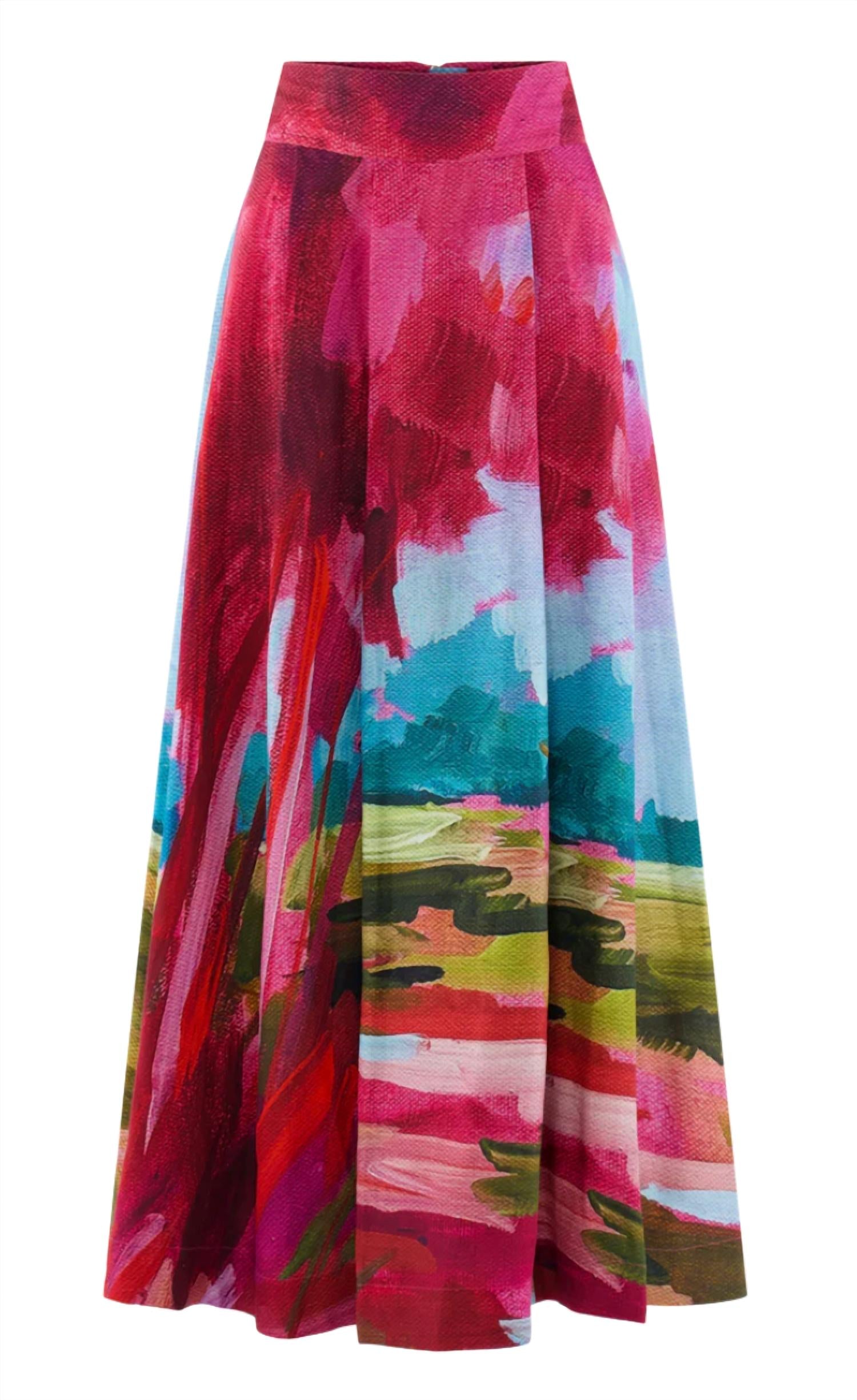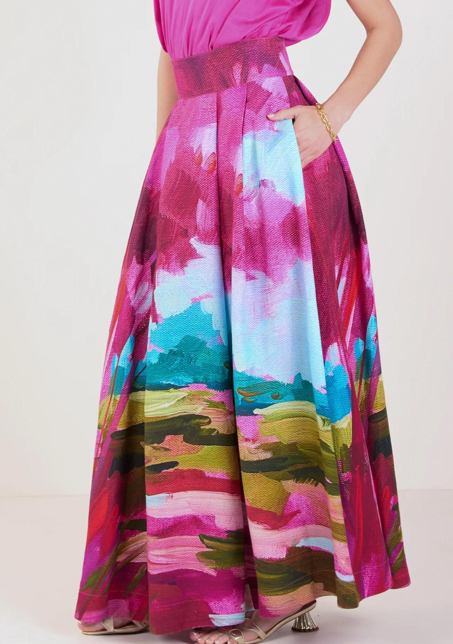 Who doesn't love a good maxi skirt? Elevate your style with the Milly Skirt by Emily McCarthy, showcasing the enchanting Bellamy Sunset design. This high-waisted maxi skirt combines an empire silhouette with a wide, structured waistband, offering both support and grace in its full drape. Crafted from 70% rayon and 30% linen, it features an exposed back zip closure with a signature gold pull. Care for this exquisite piece with dry-cleaning or spot cleaning with cold water.